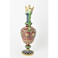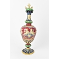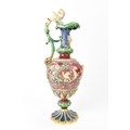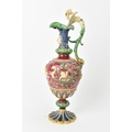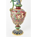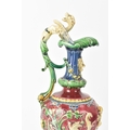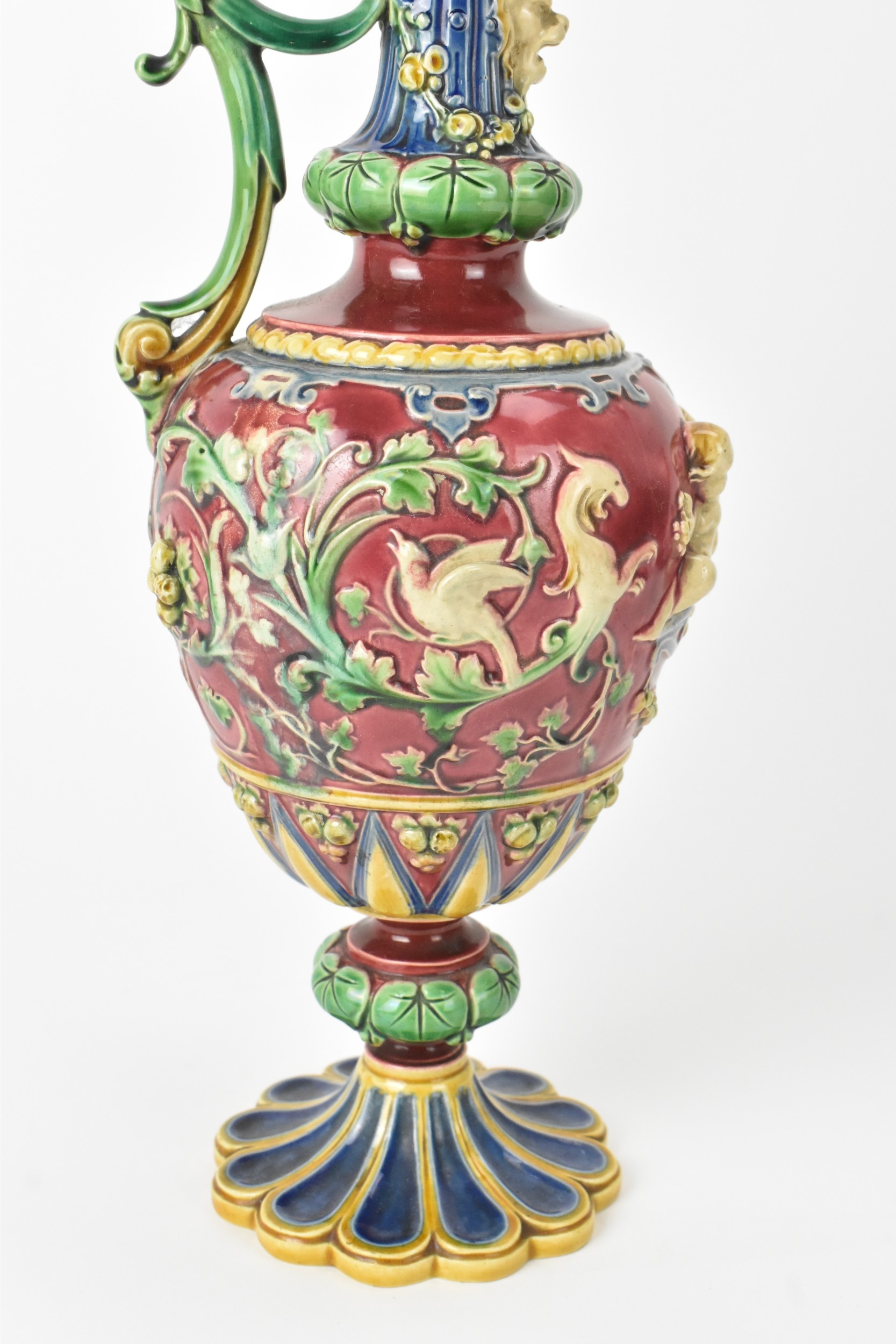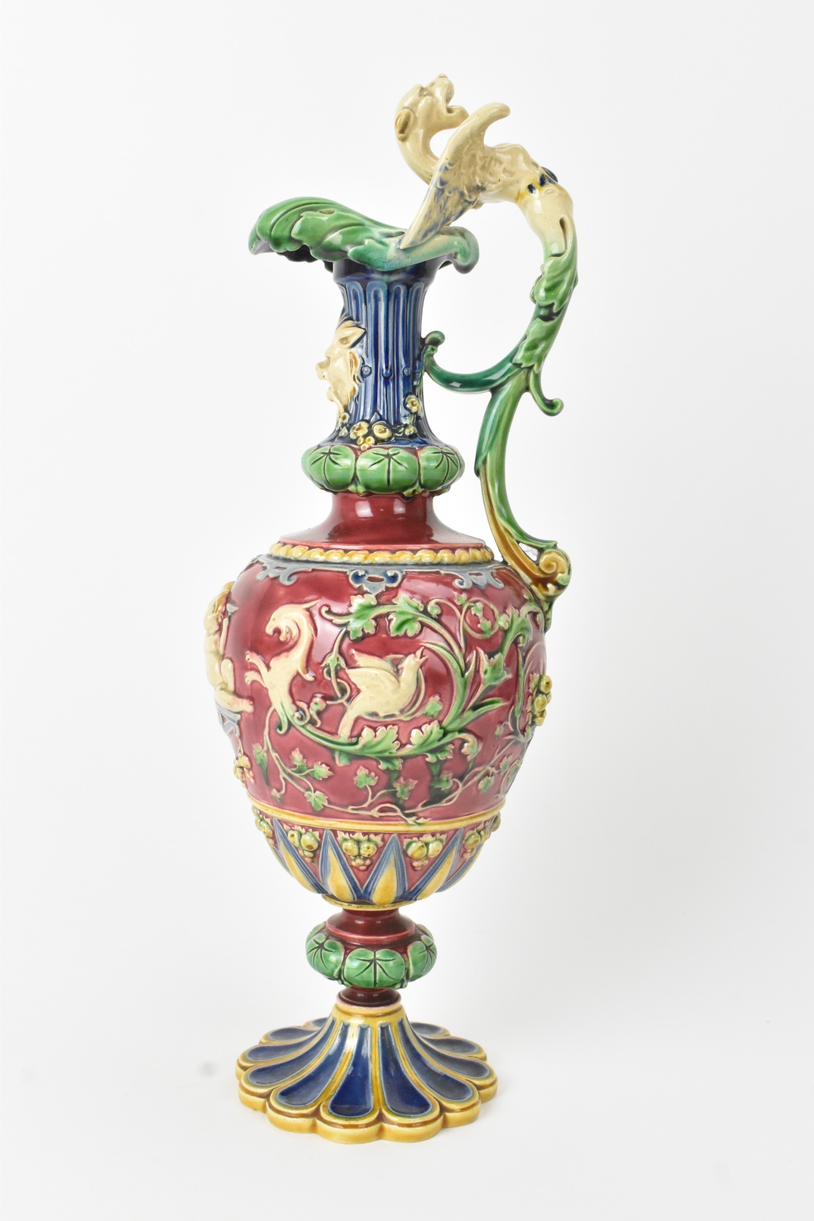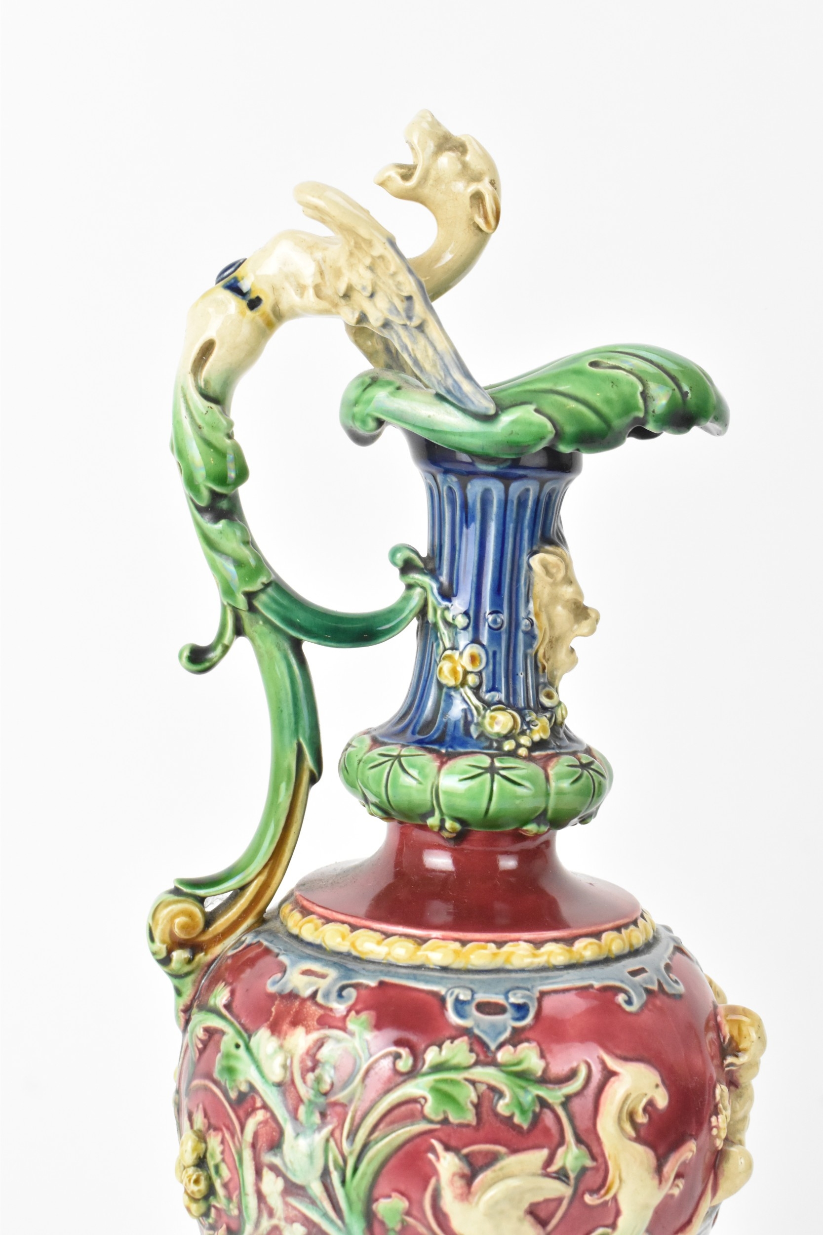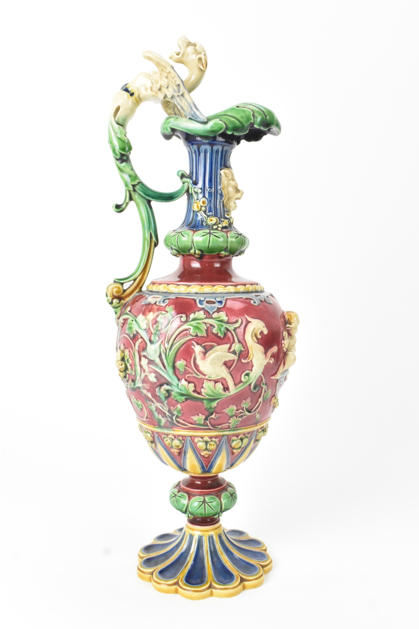 A late 19th century Minton majolica ewer, moulded and enamelled in neo renaissance style with acanthus leaf formed spout, scrolled handle surmounted by a griffin, baluster body cast in relief with cherubs and vining flowers on a red ground, shape number 472, impressed marks, 35cm high