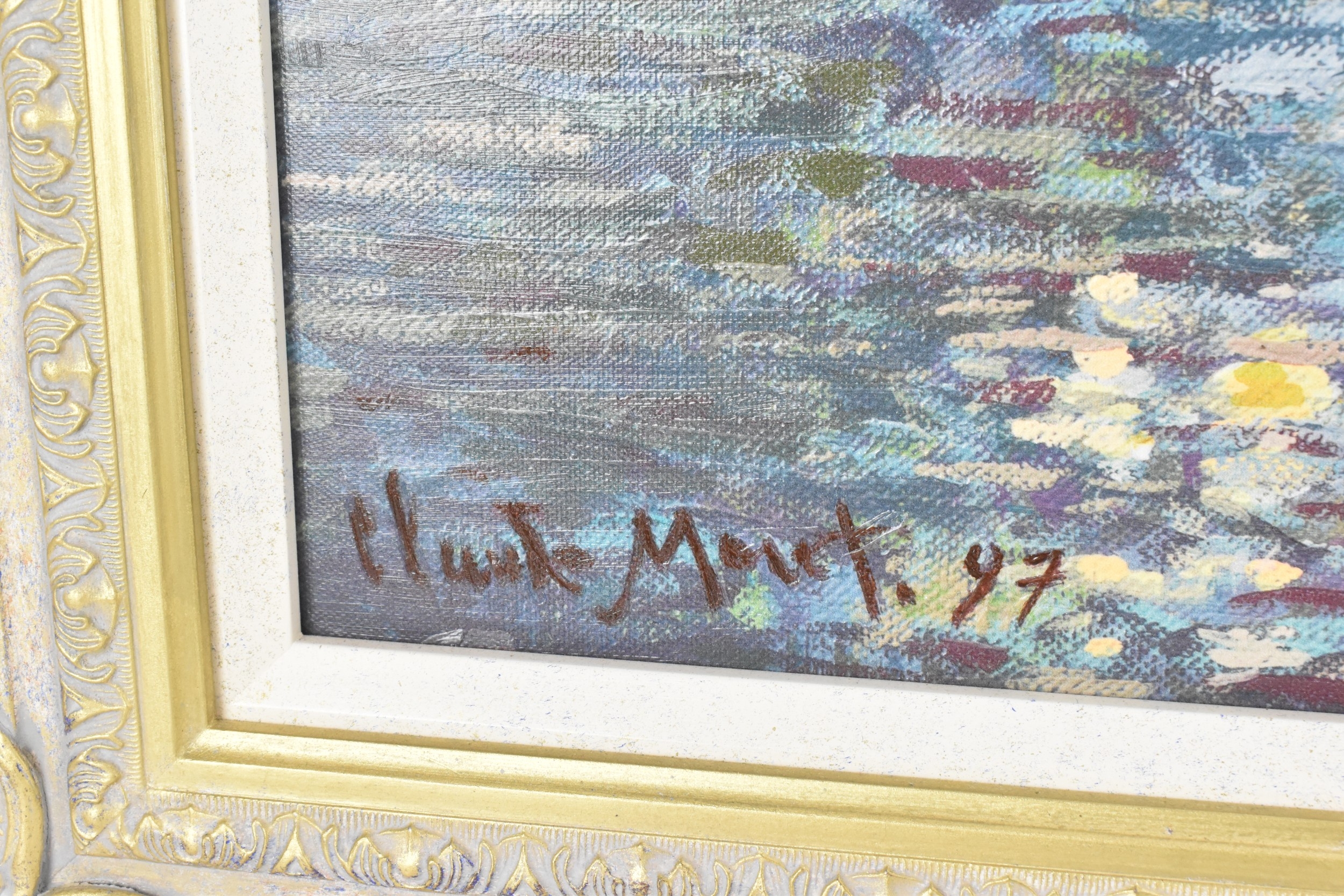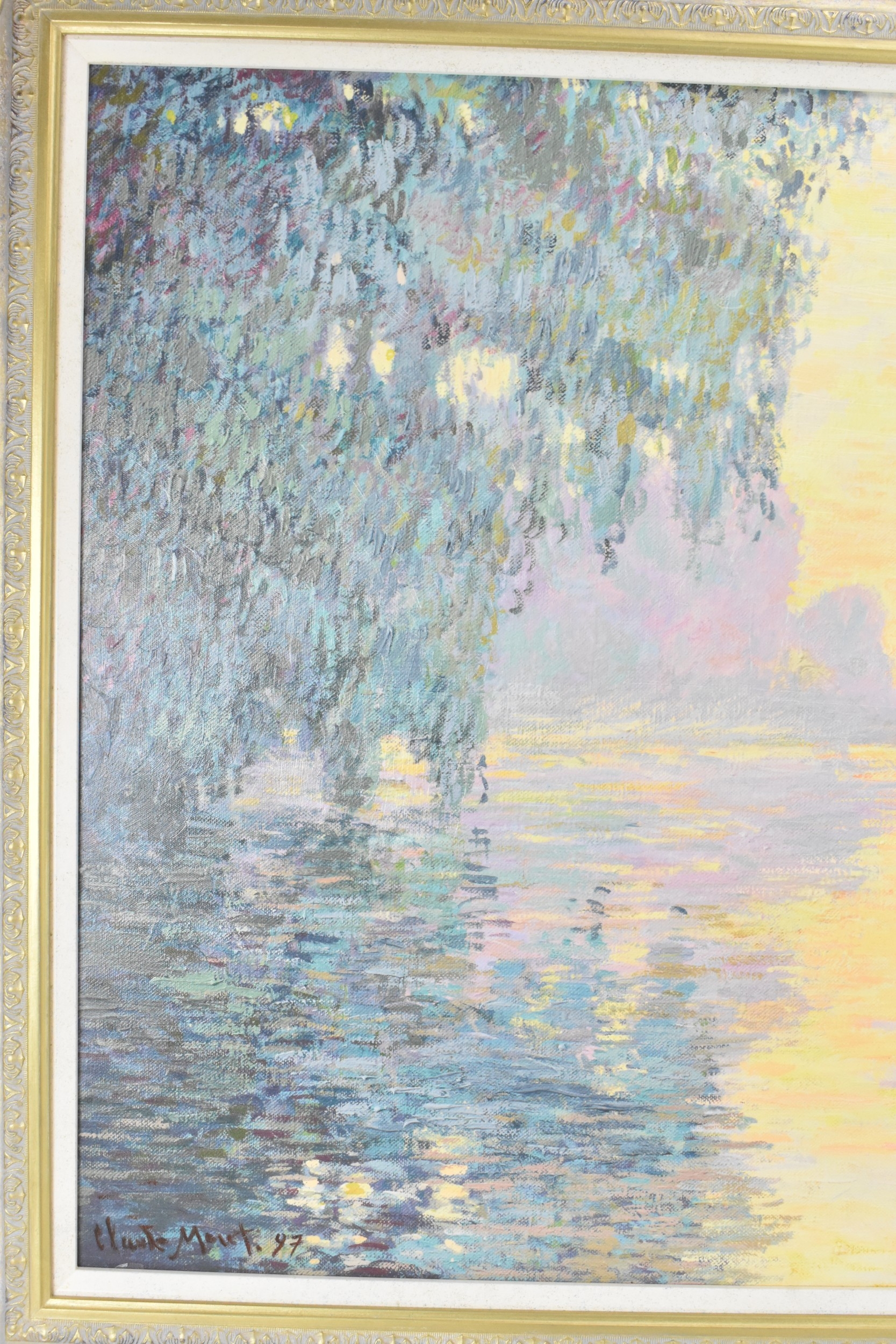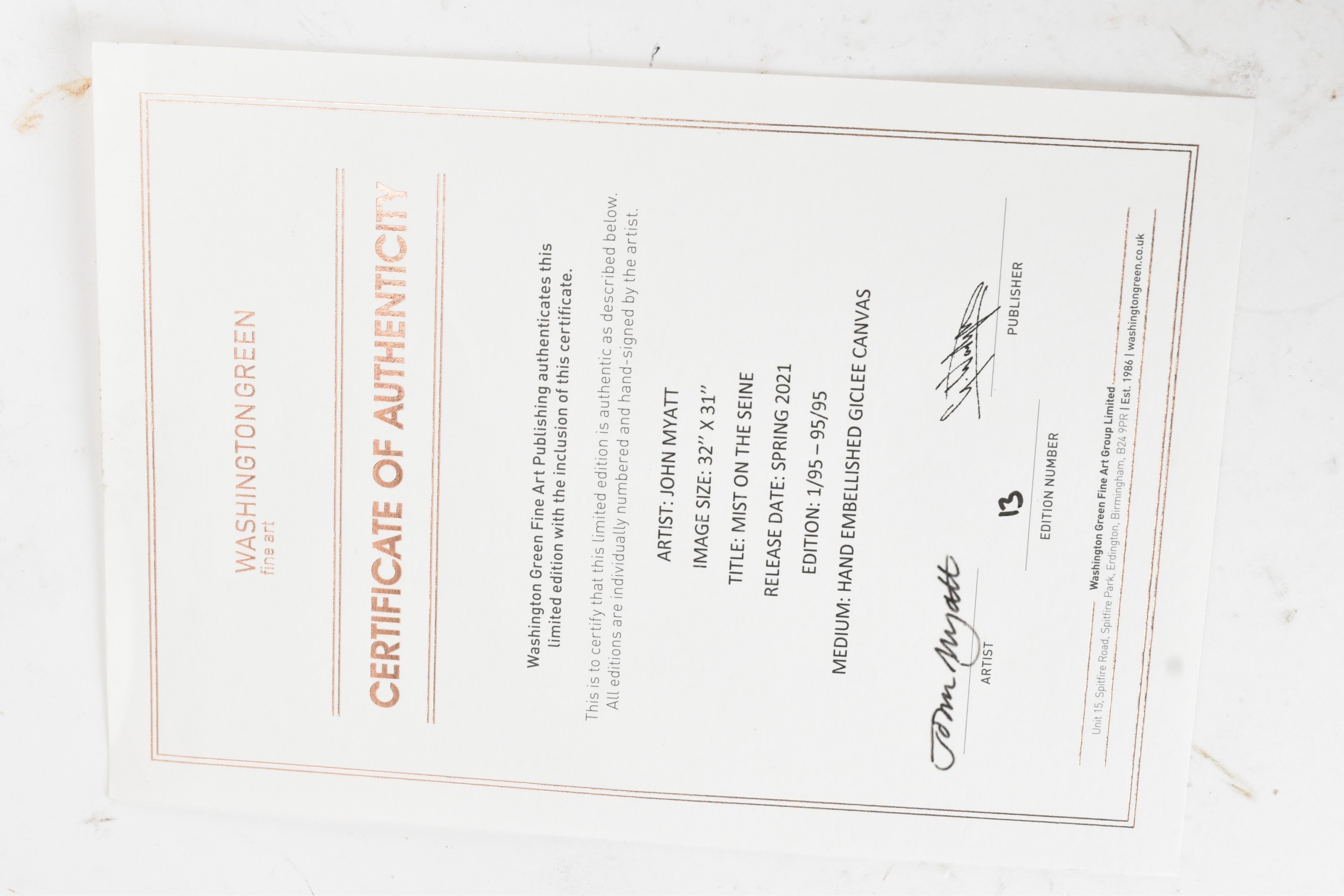 John Myatt (B.1945) A hand embellished giclee canvas entitled 'Mist on the Seine', limited edition numbered 13/95, with certificate of authenticity, 78.5cm x 81cm, framed