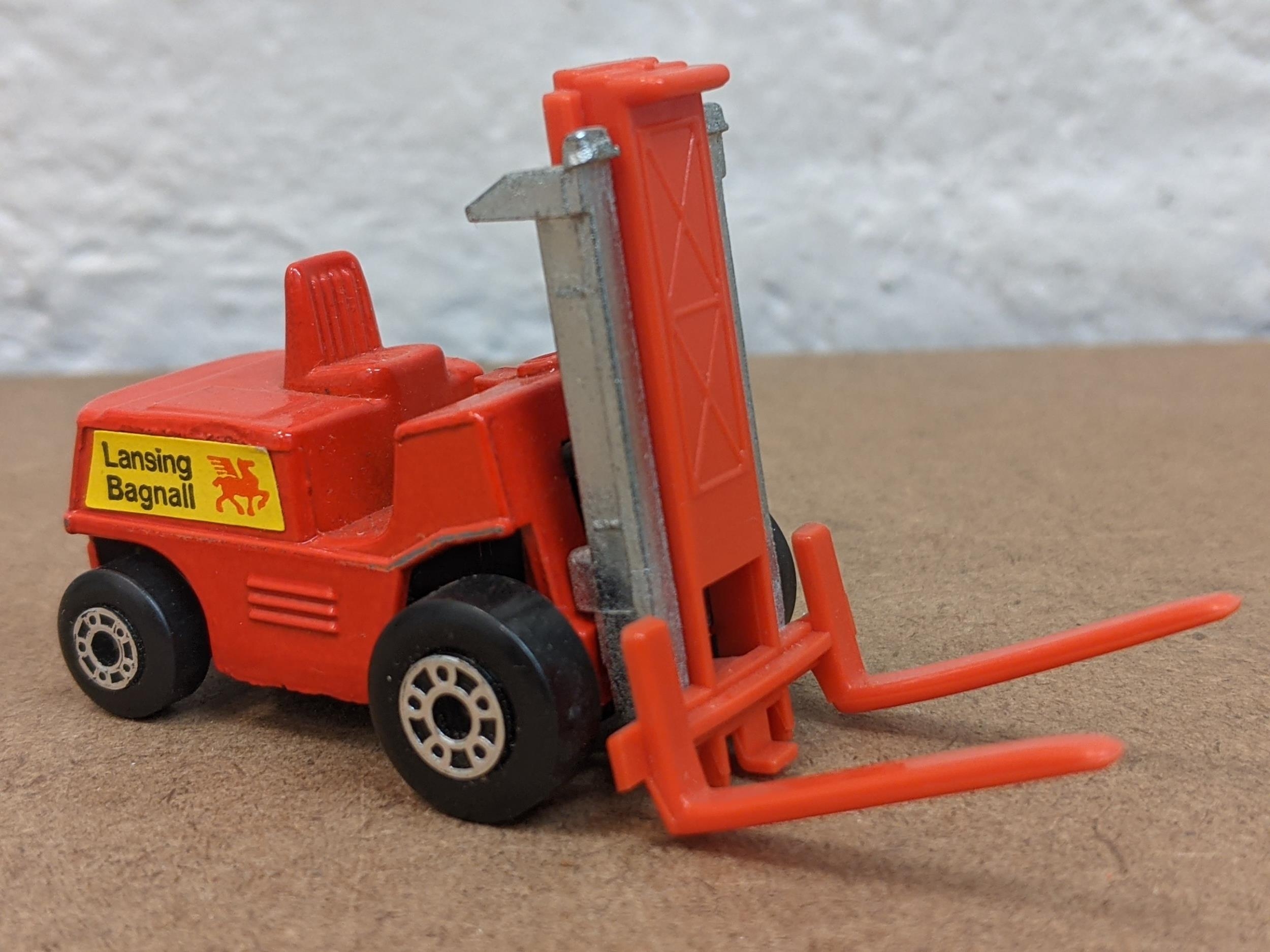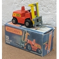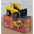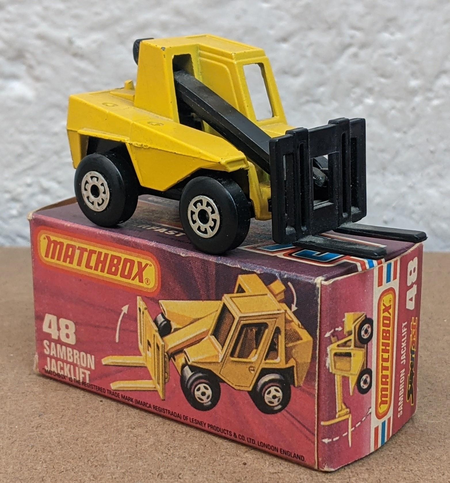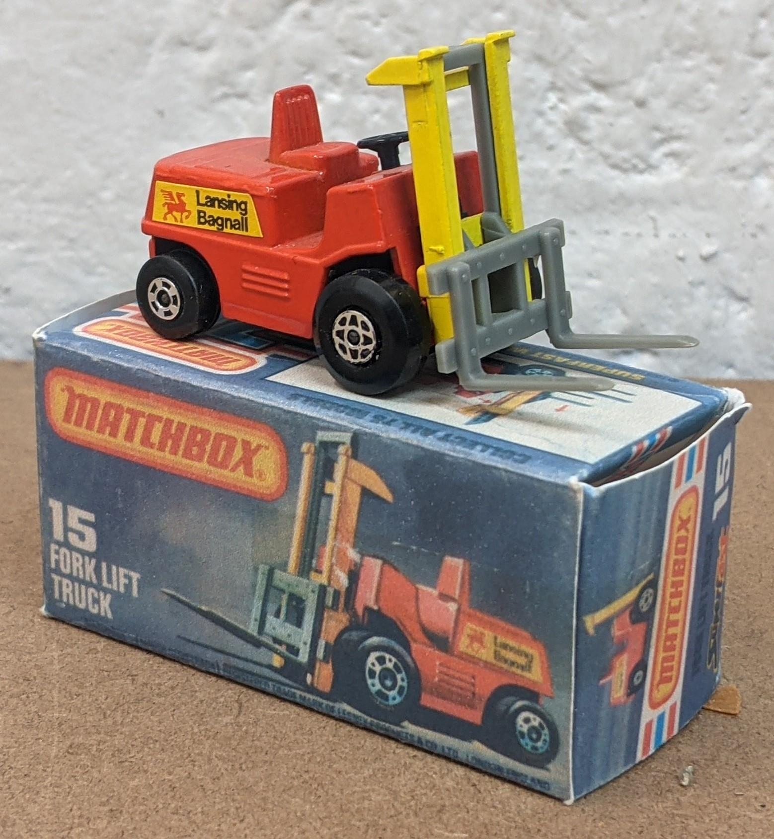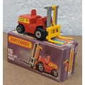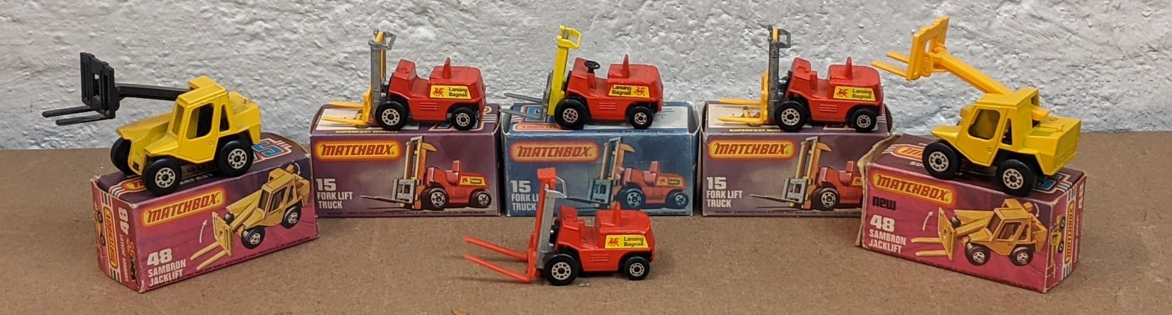 Four Matchbox forklift trucks, three boxed, all number 15 and all dated 1972 underneath with Lansing Bagnall stickers, the three boxes are dated 1978, along with two Matchbox 48 Sambron Jacklifts, both with yellow bodies, one with yellow lifting forks, the other with black, both dated 1977, both boxed with he boxes dated 1976
