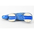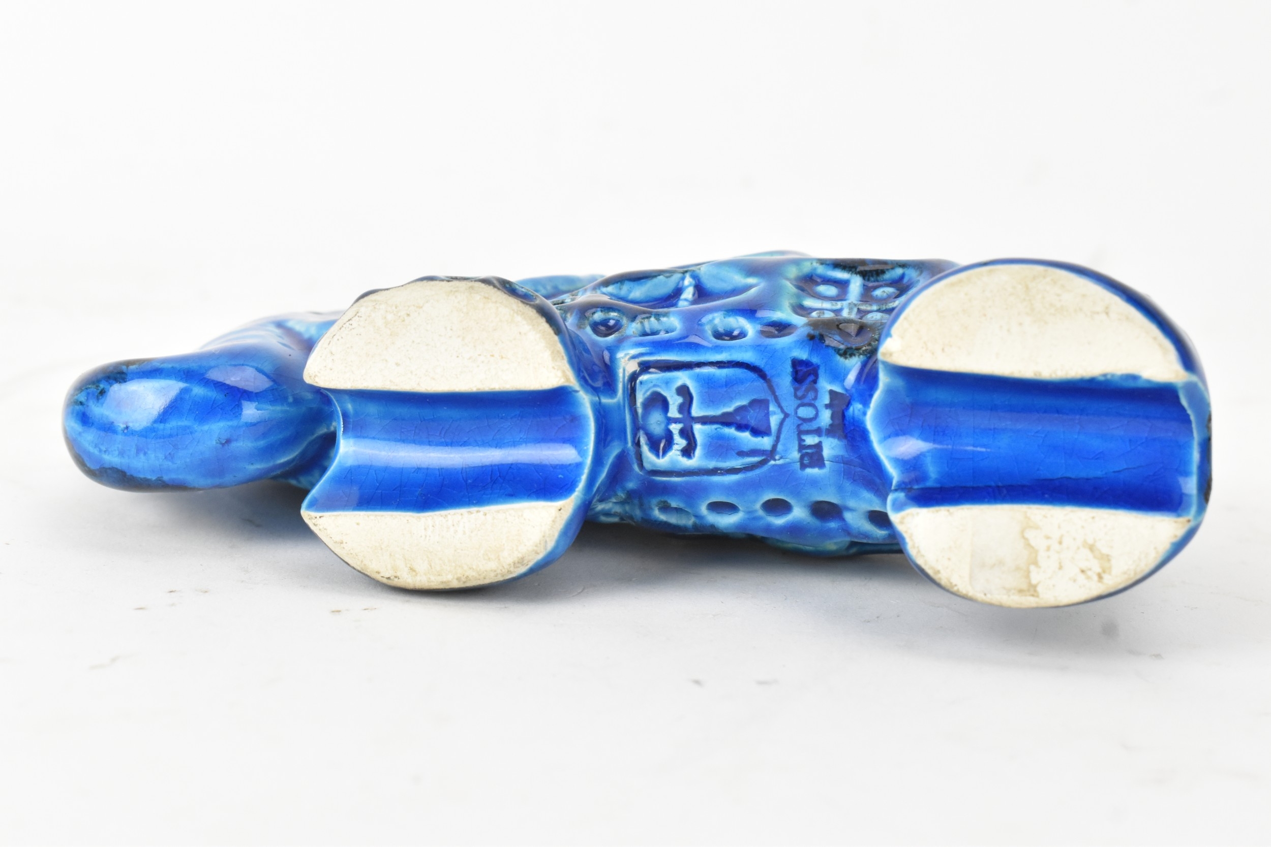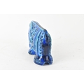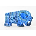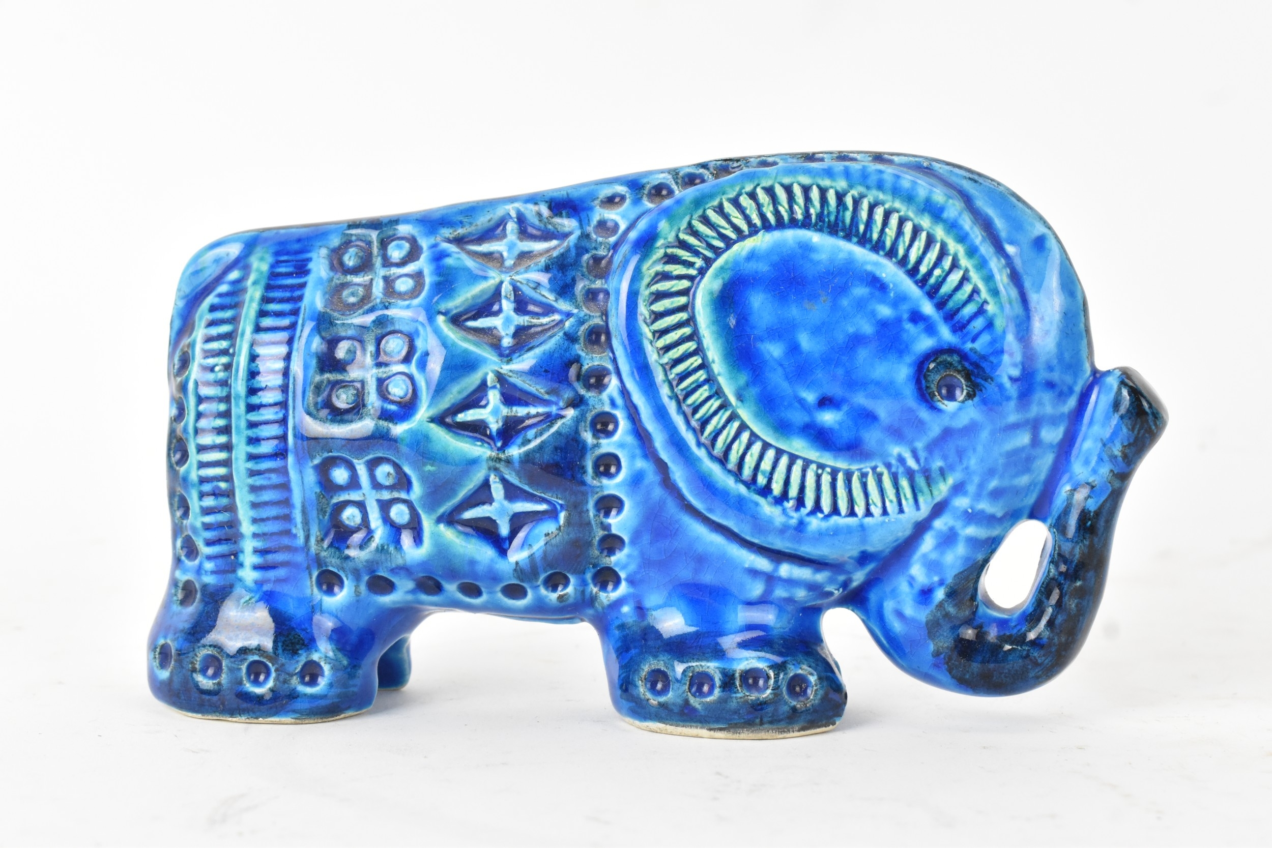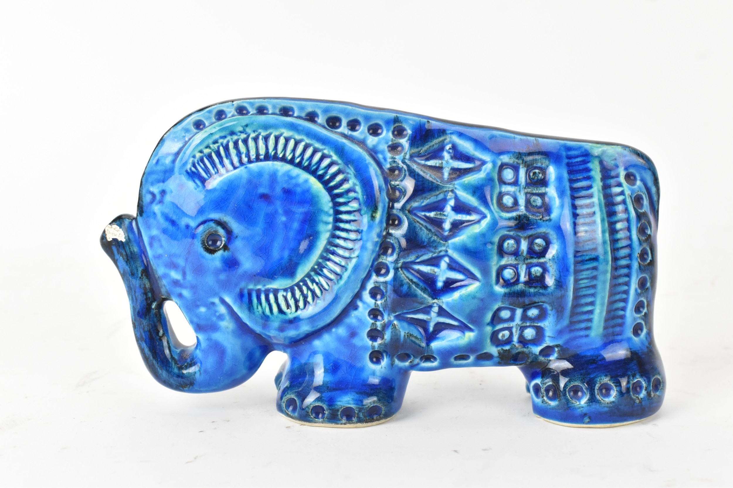A mid-20th century Italian Bitossi elephant, designed in the Rimini Blu glaze, with bold impressed geometric decoration and glazed in vibrant turquoise and cobalt tones. Marked to the base “Bitossi Italy”, 8.6cm high x 15.5cm wide, A/F