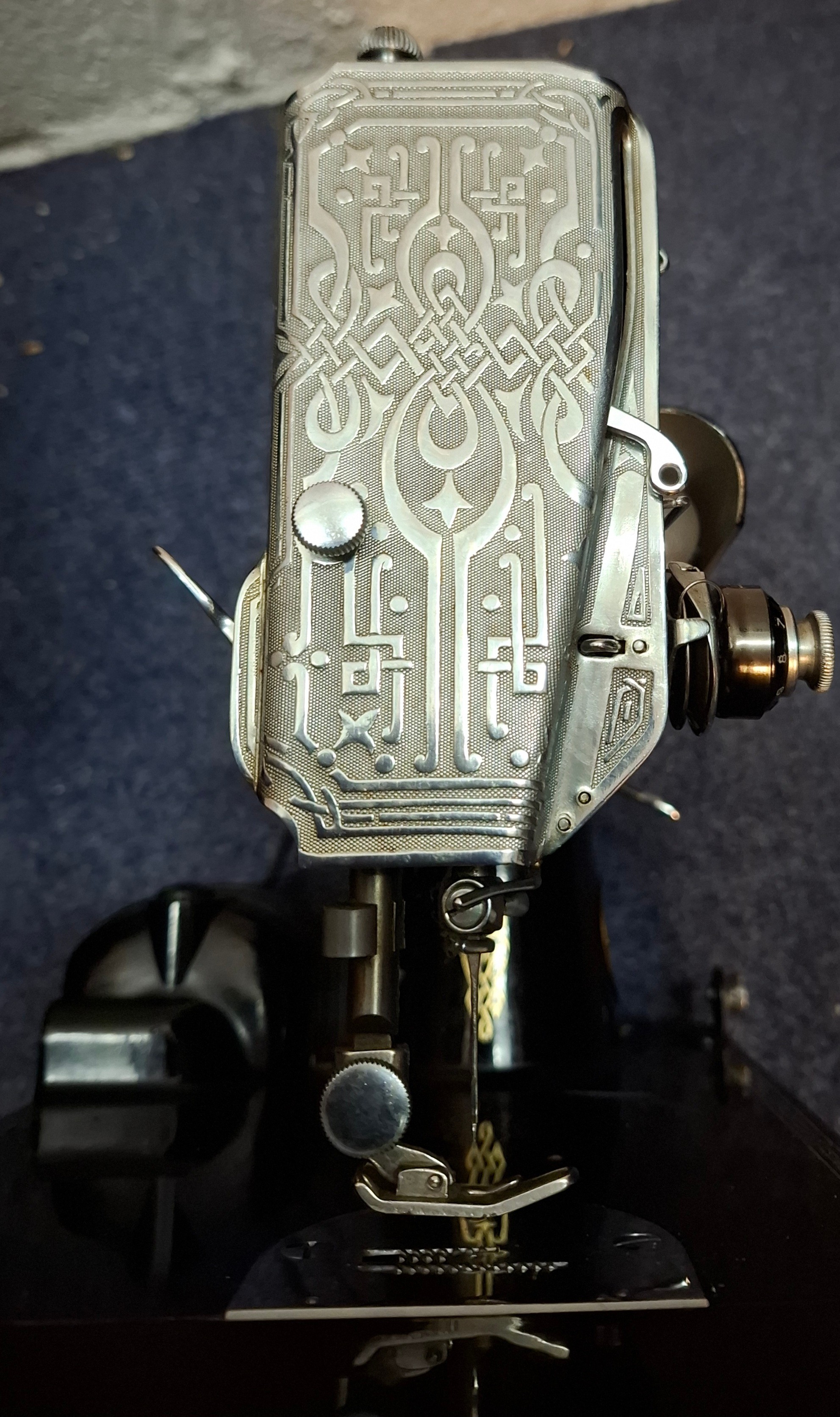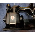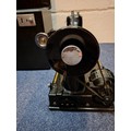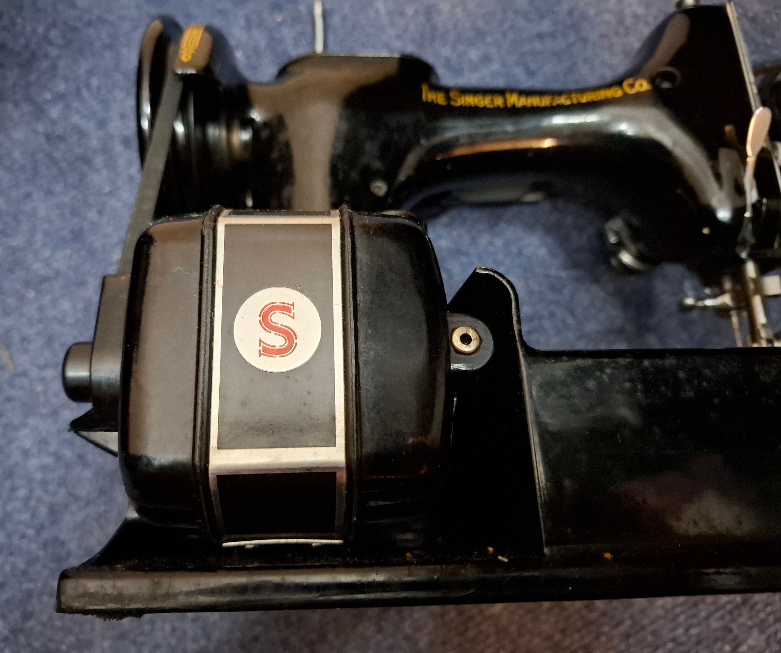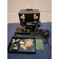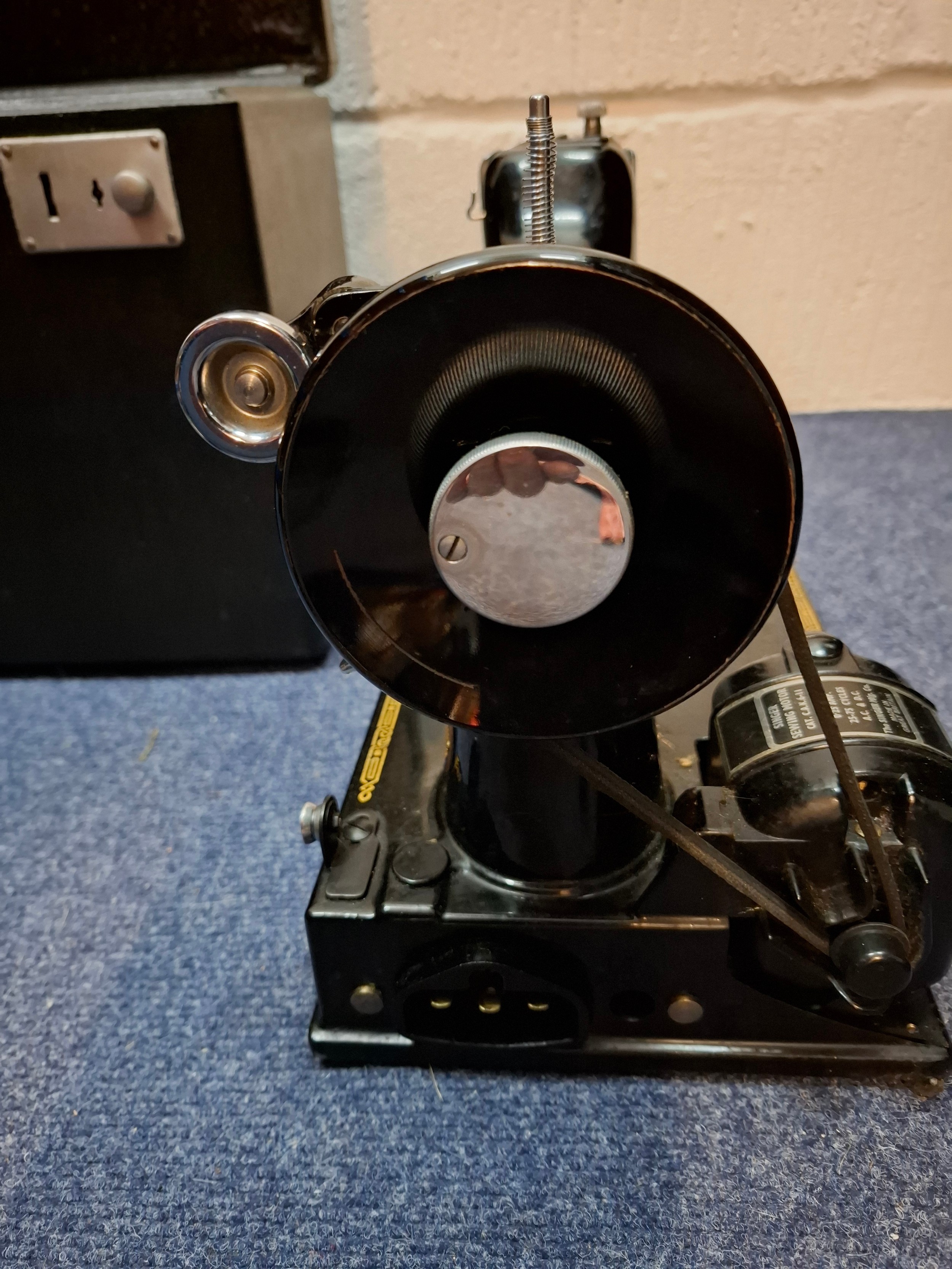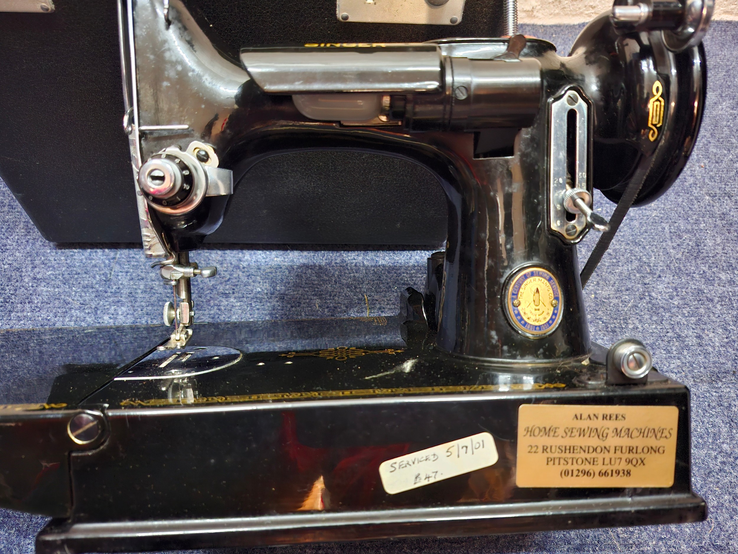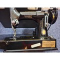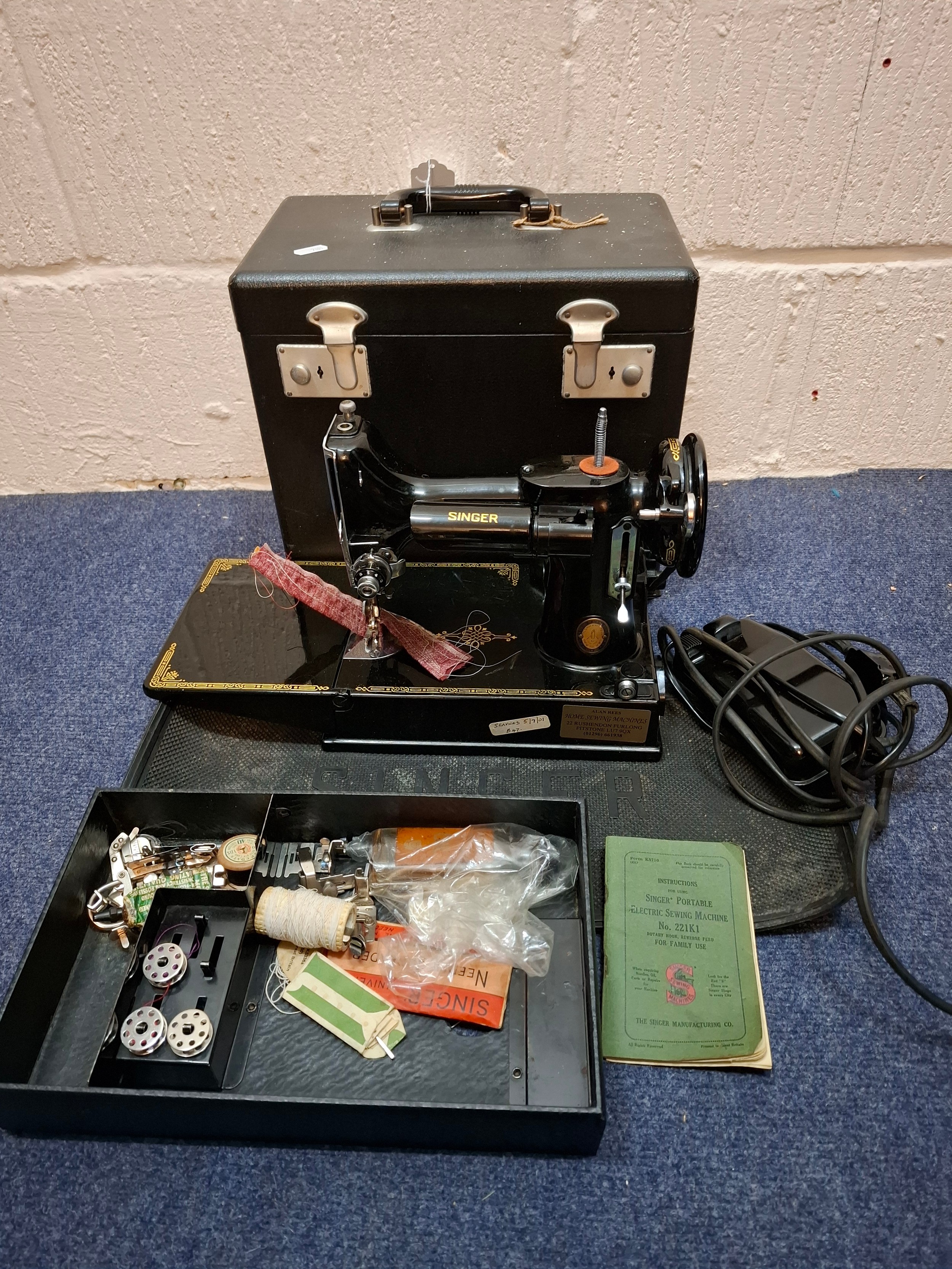 A 1951 Singer 221K electric featherweight sewing machine in original fitted case with accessories and manual, serial number EG961734, spool casing and rubber intact, no keys. Location:1.4