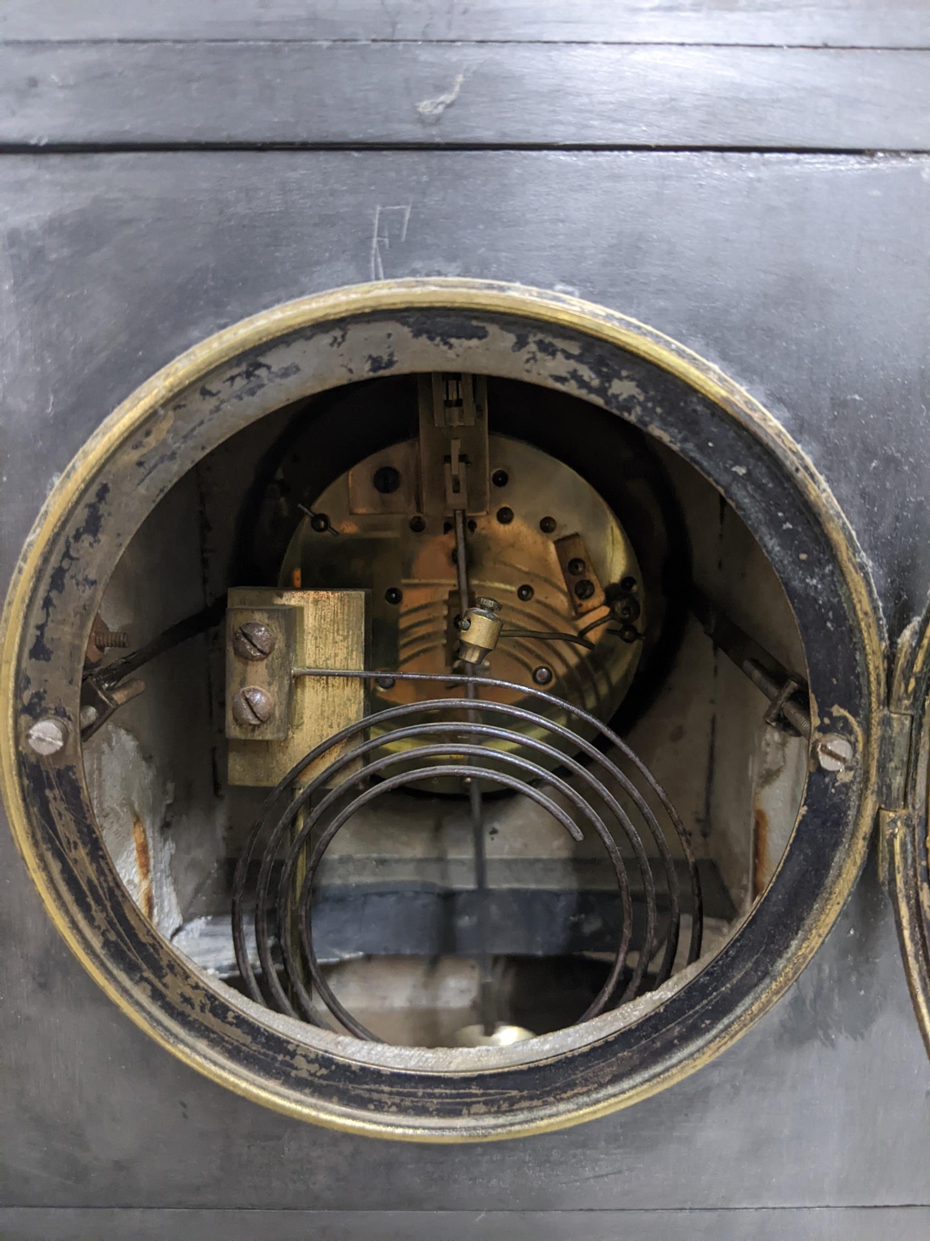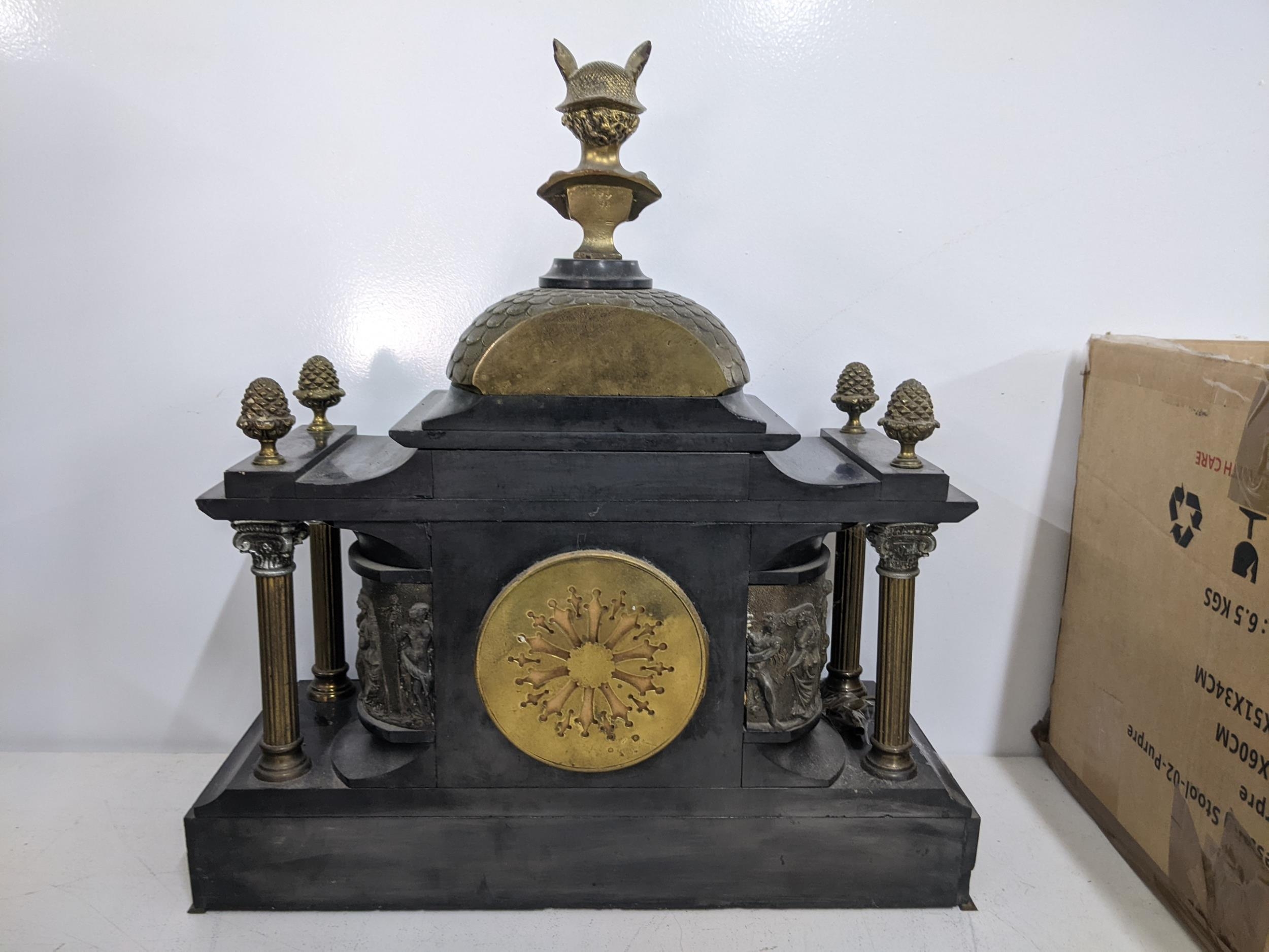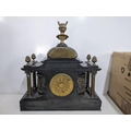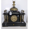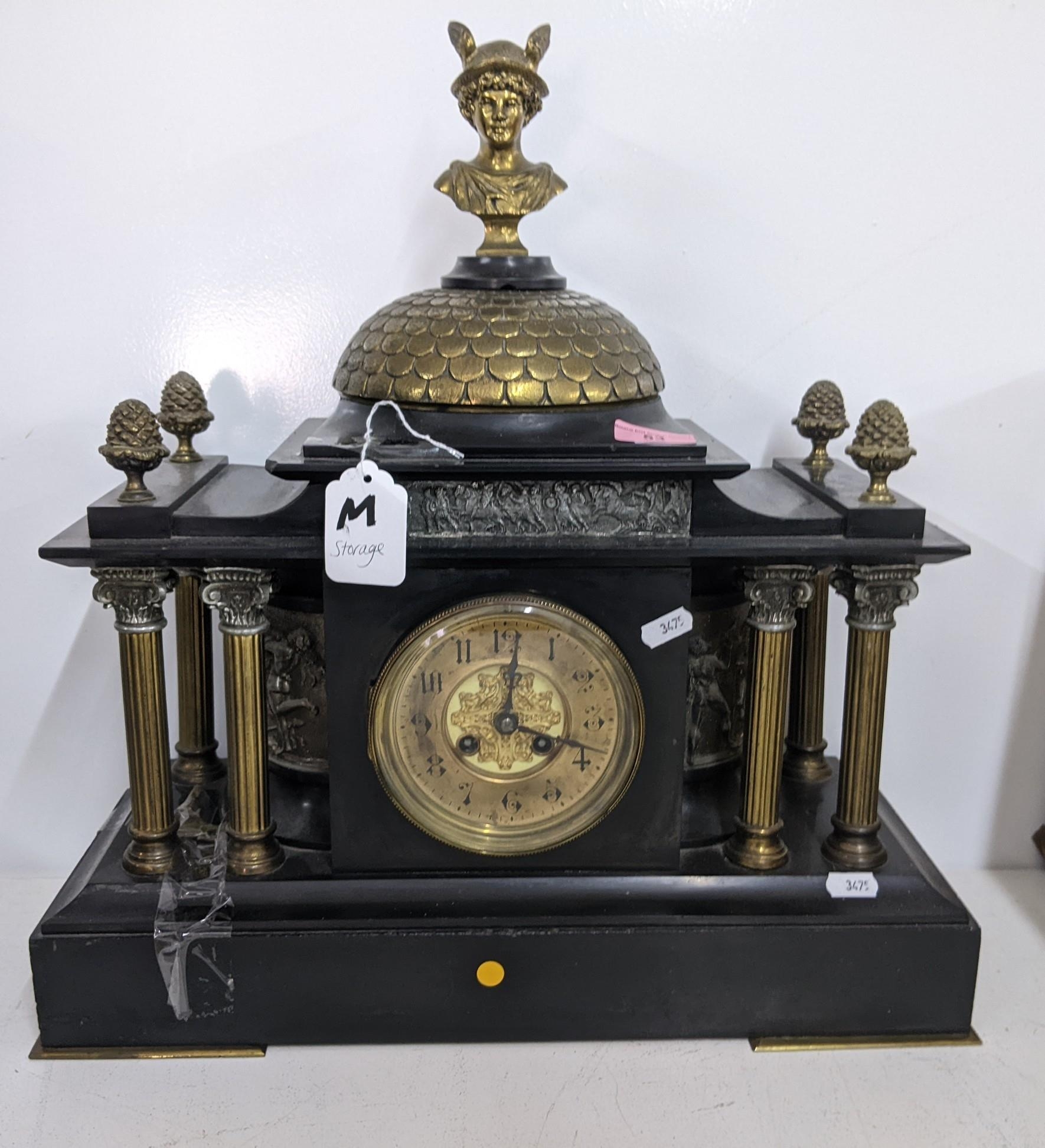 A late Victorian black slate mantle clock of architectural form, surmounted with a bust of Mercury on a domed brass roof with four pine line finials adorning each corner, the Arabic dial and movement supported by a pair of reeded pillars either side supported on plinth