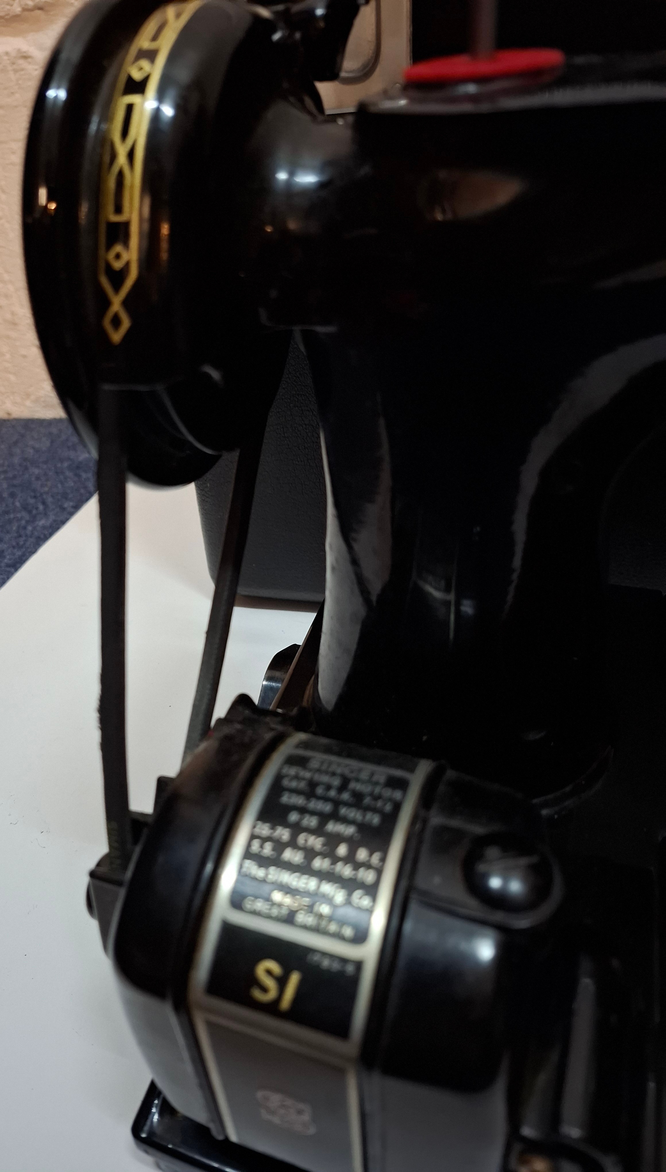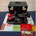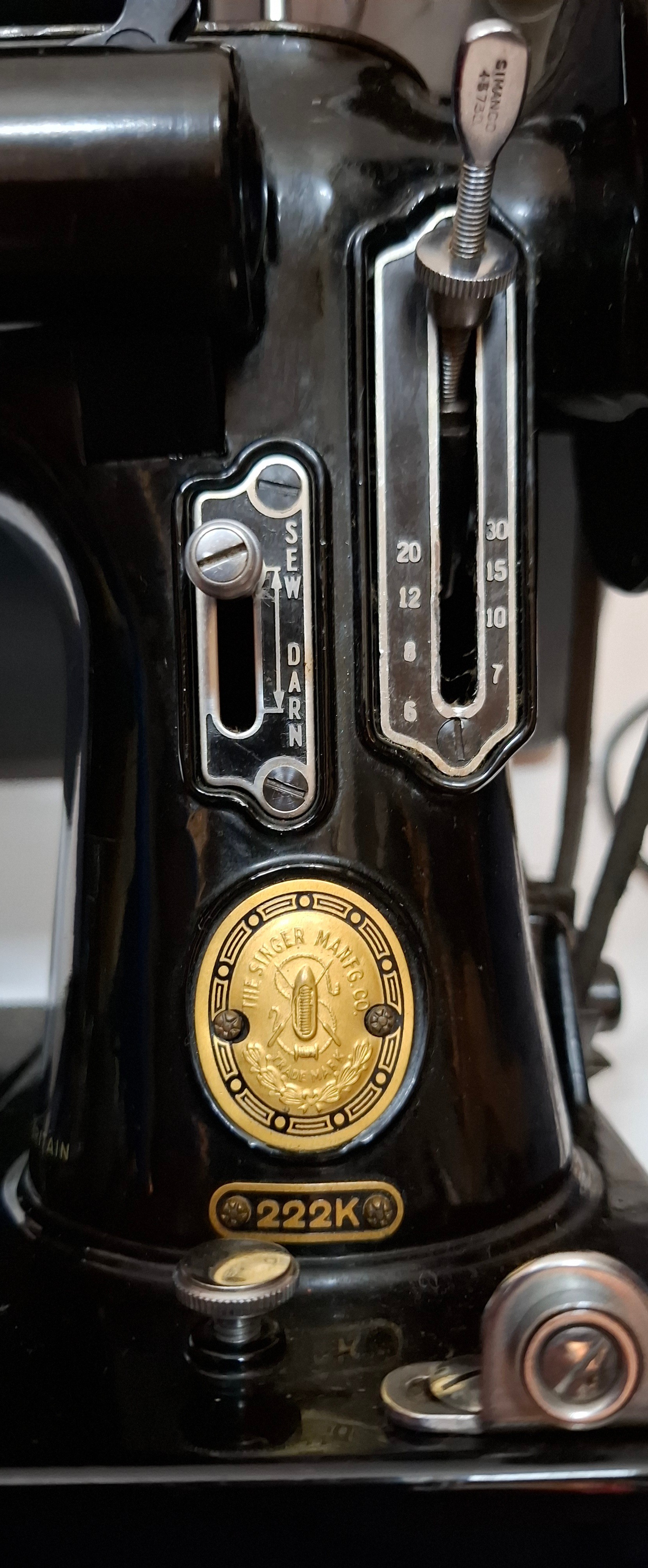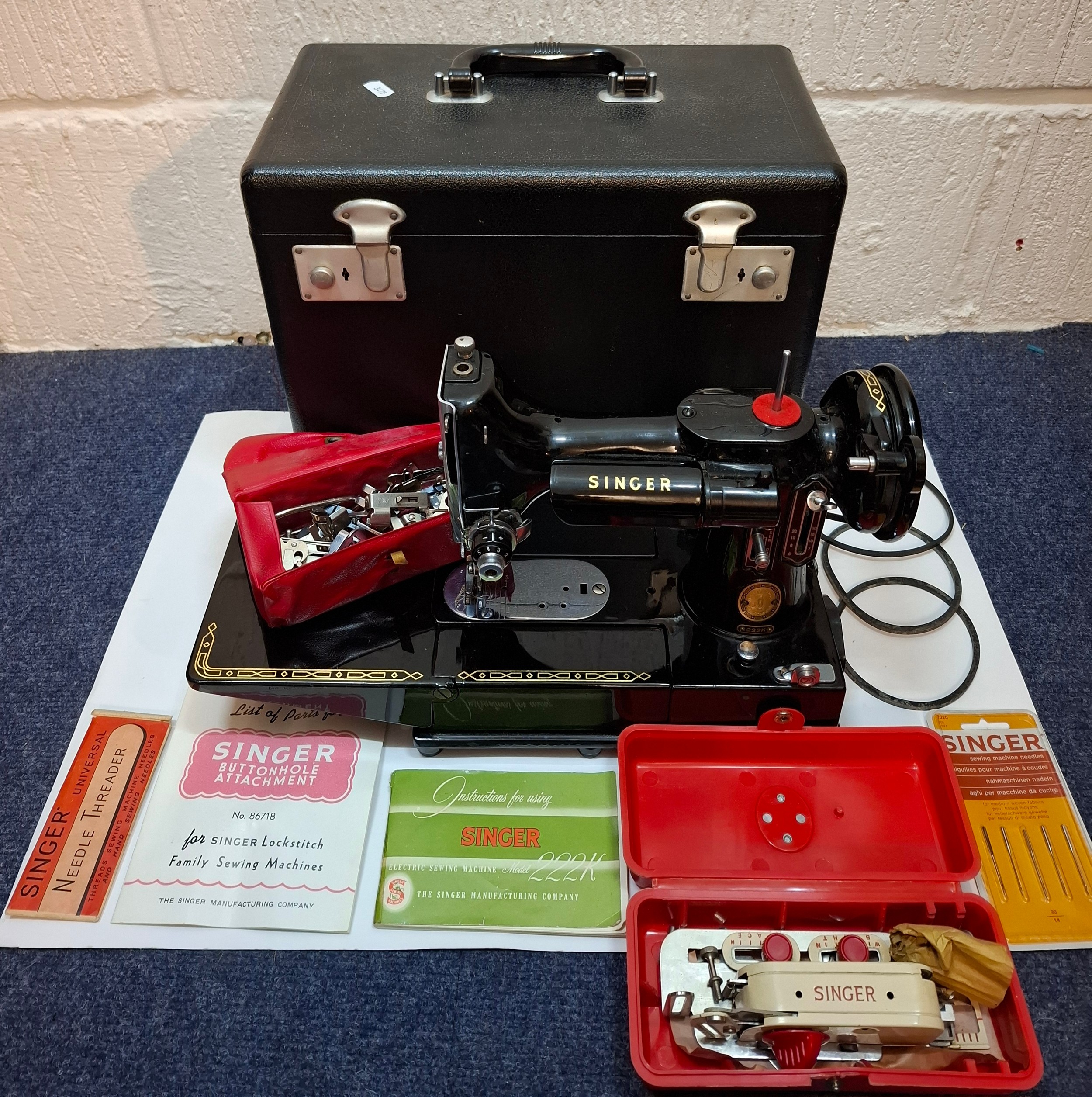 A 1957 Singer Featherweight 222K electric sewing machine having a black travel case together with a Singer 222k manual, a Singer buttonhole attachment in red case, 3 additional rubbers and accessories, spool intact, serial number EM603266. Location:1.2