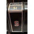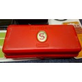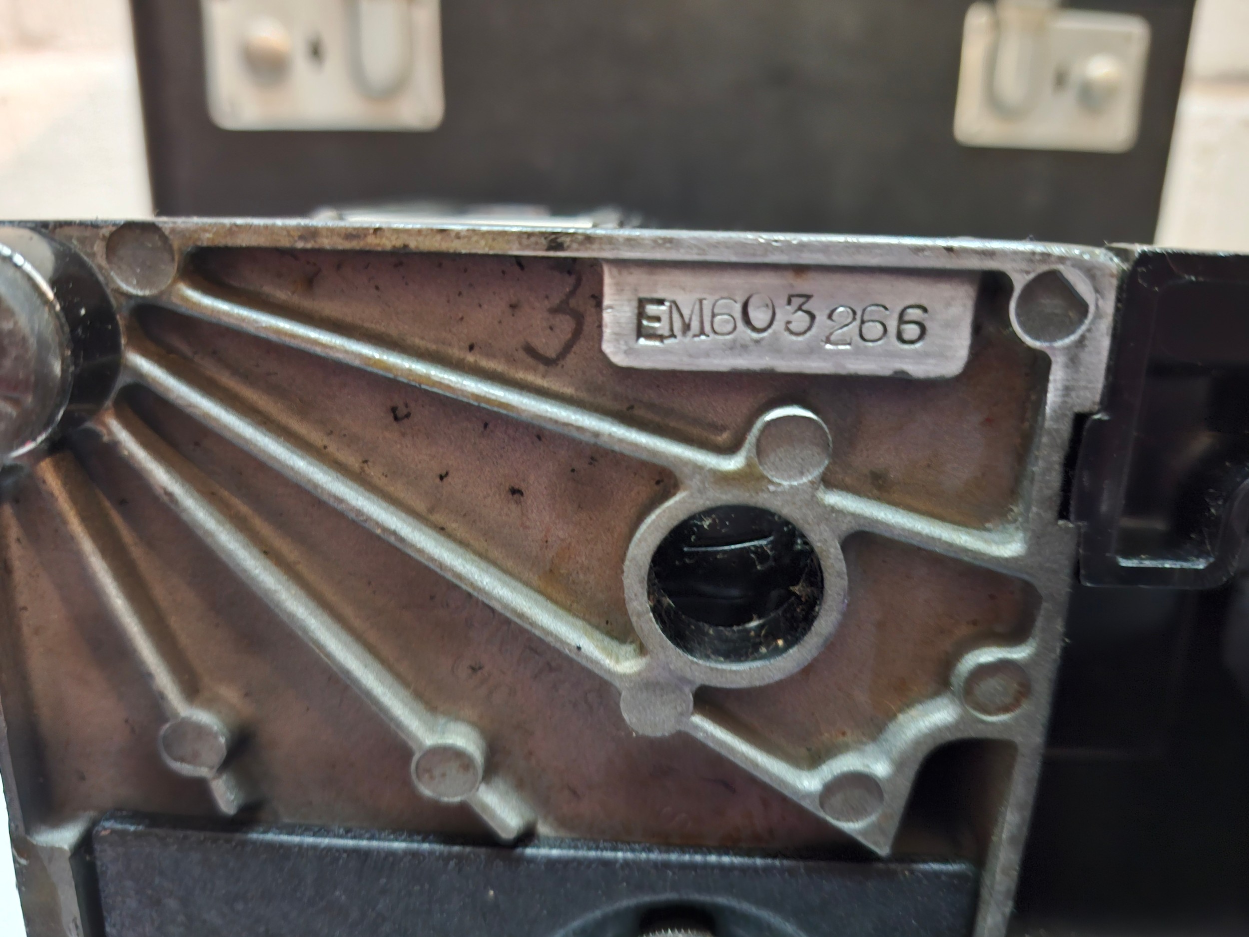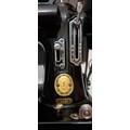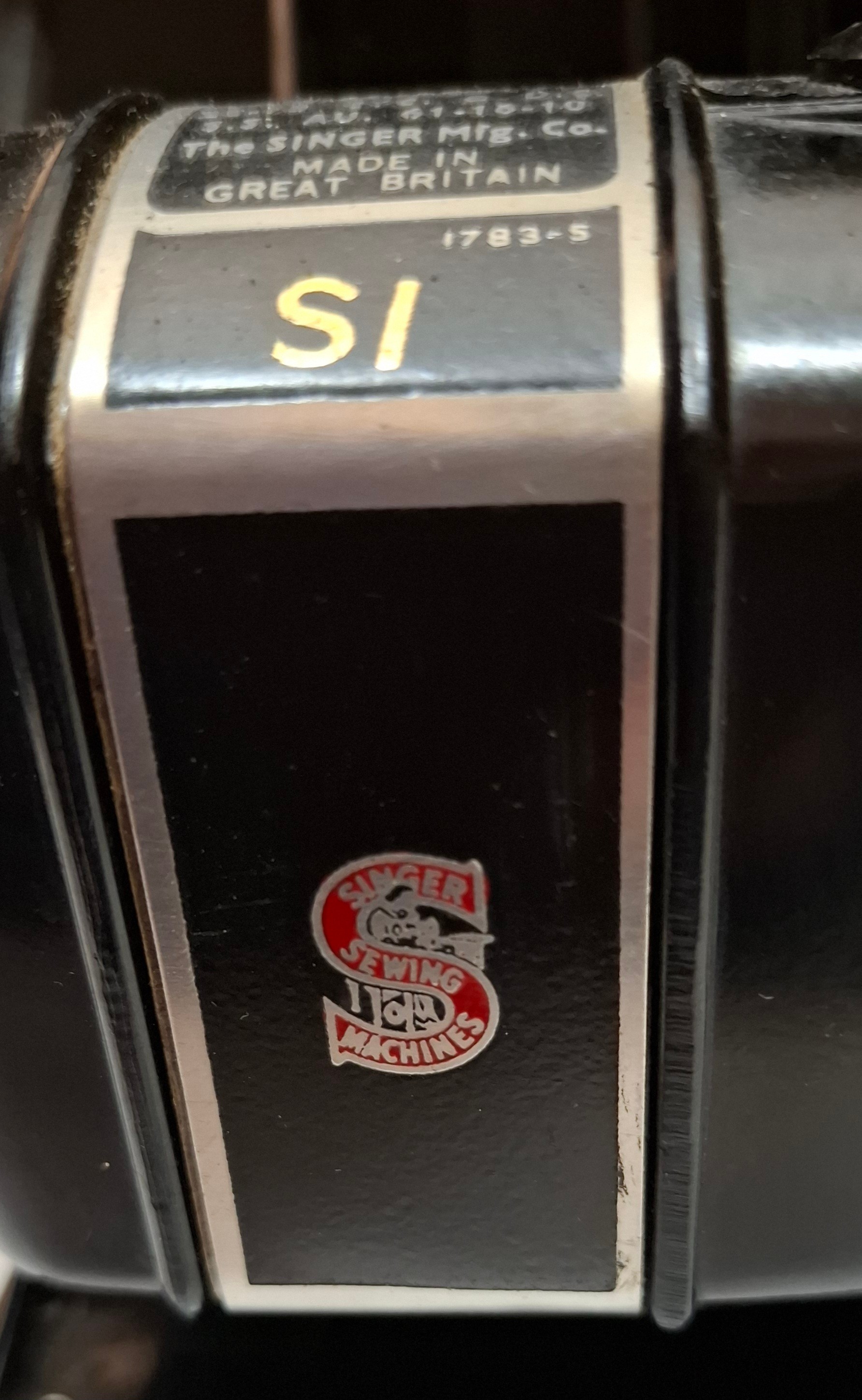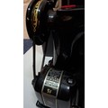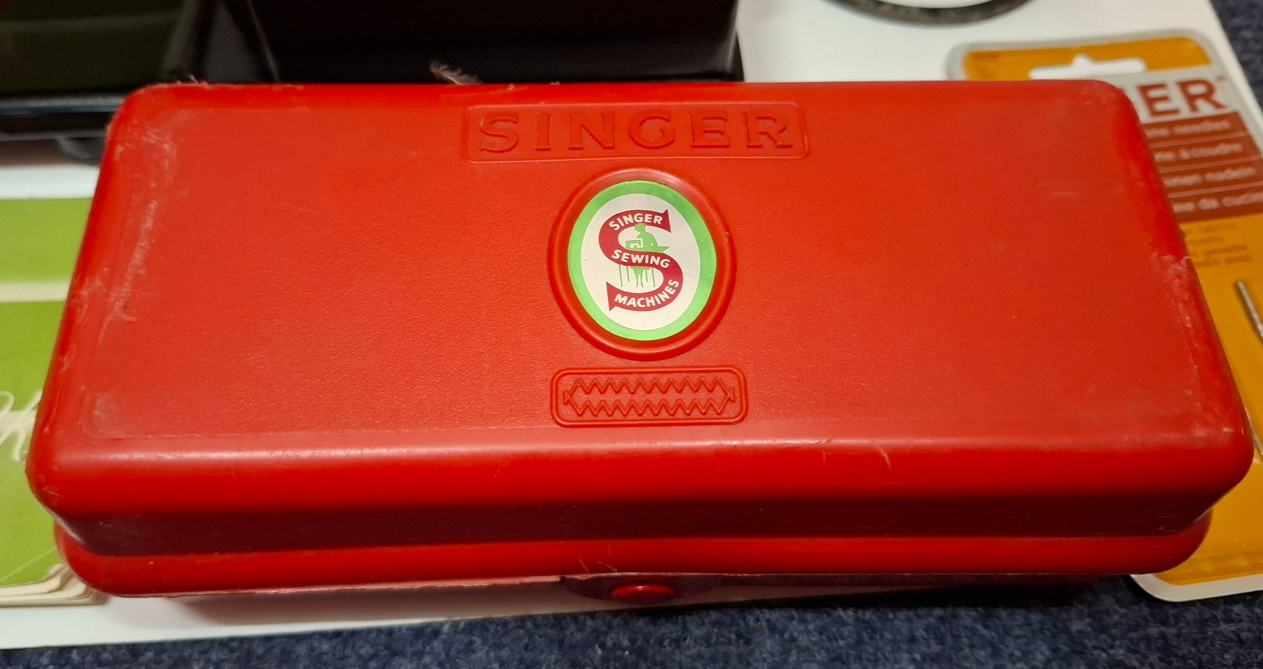 A 1957 Singer Featherweight 222K electric sewing machine having a black travel case together with a Singer 222k manual, a Singer buttonhole attachment in red case, 3 additional rubbers and accessories, spool intact, serial number EM603266. Location:1.2
