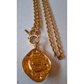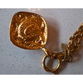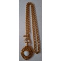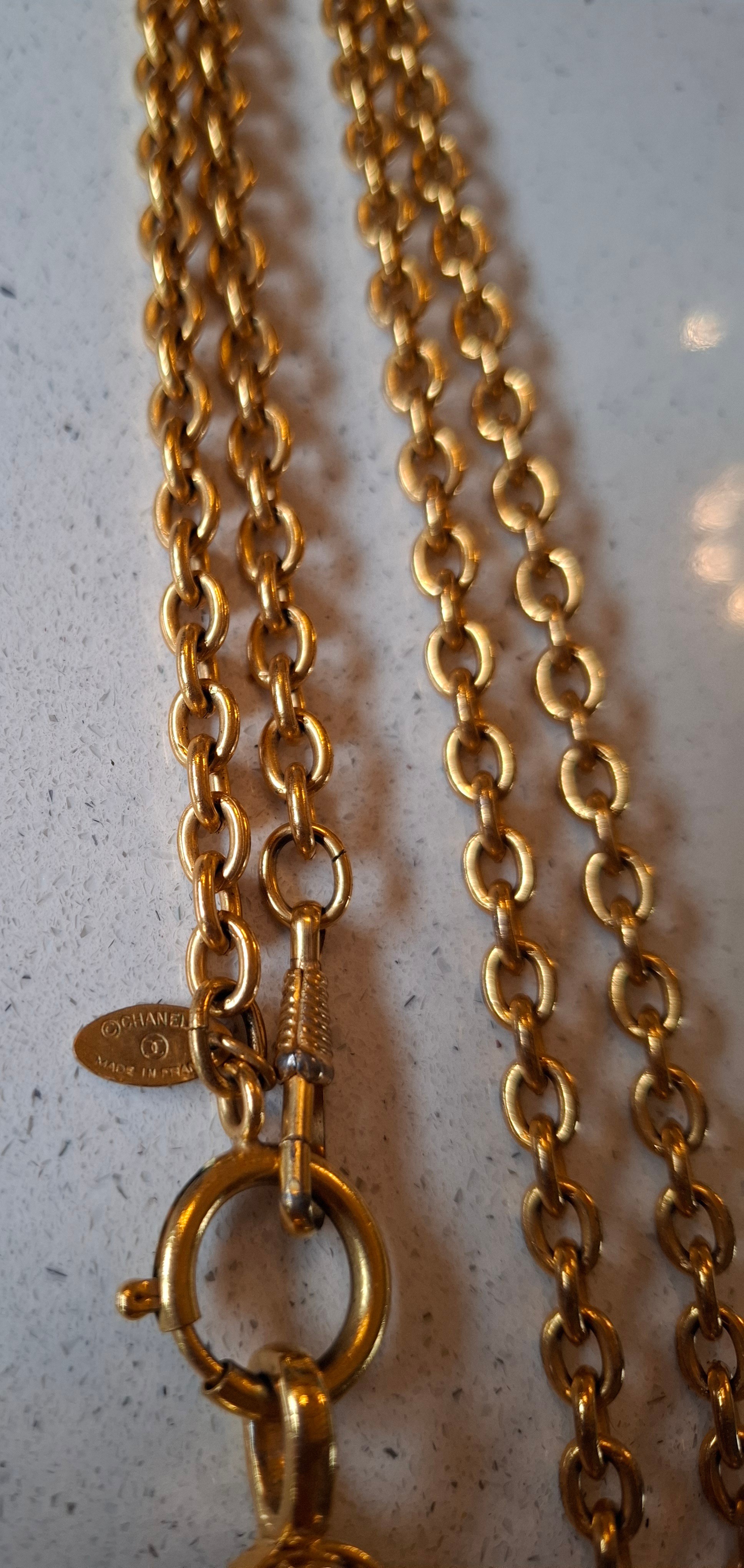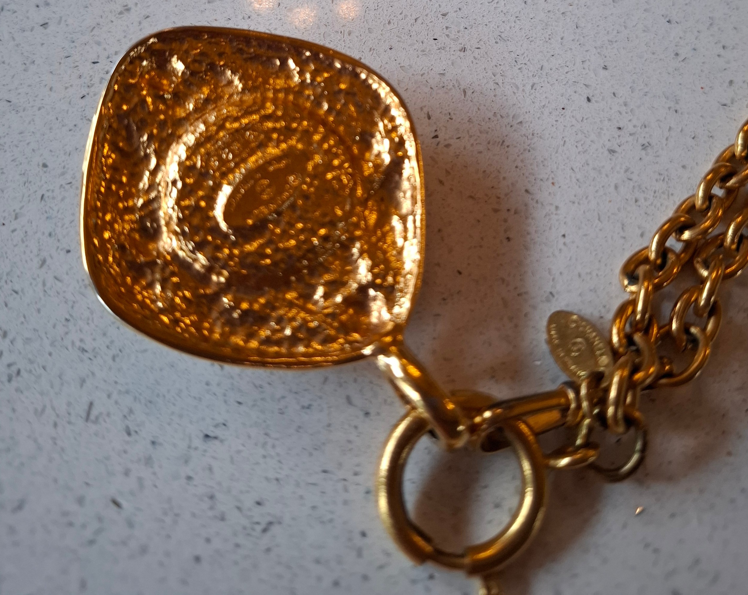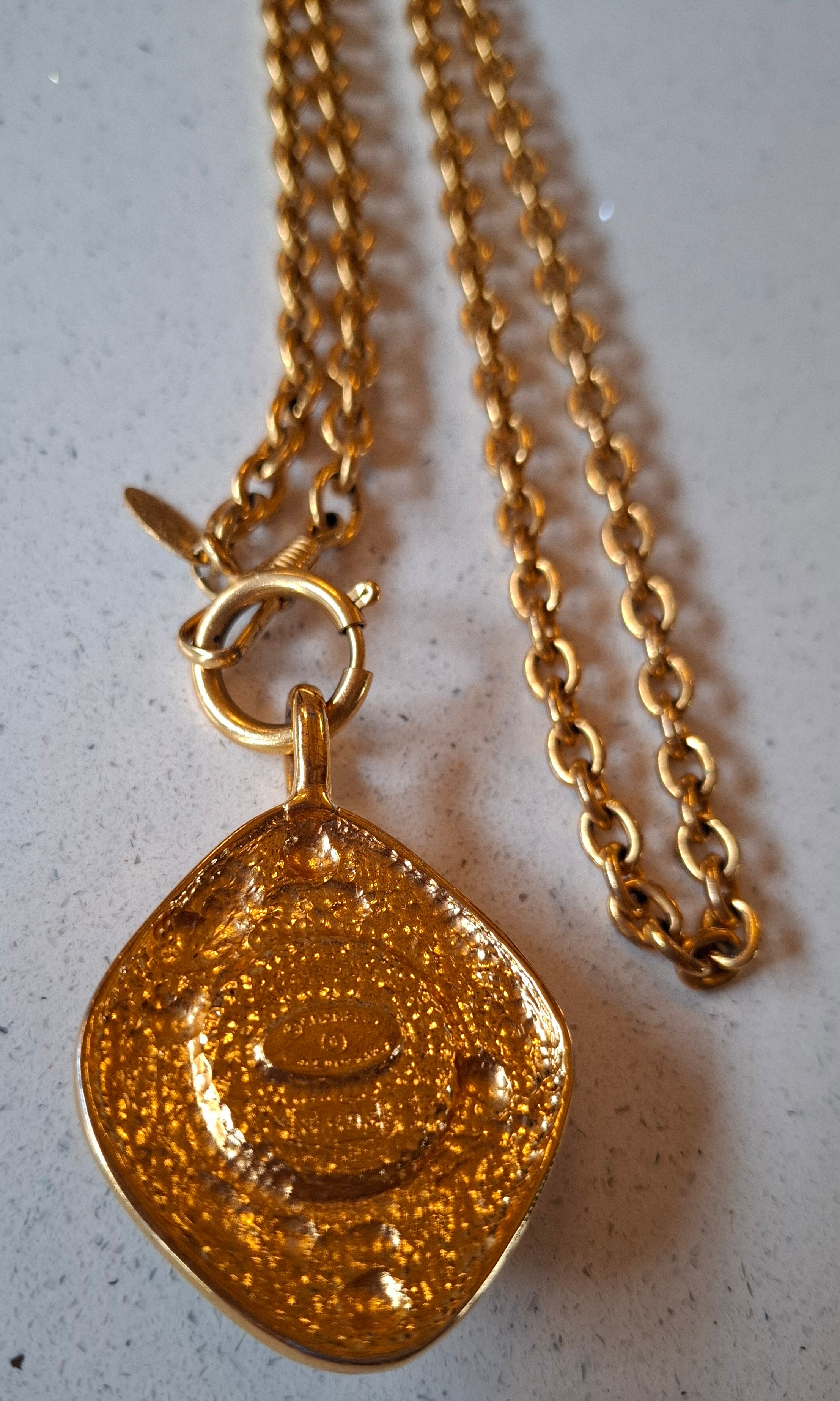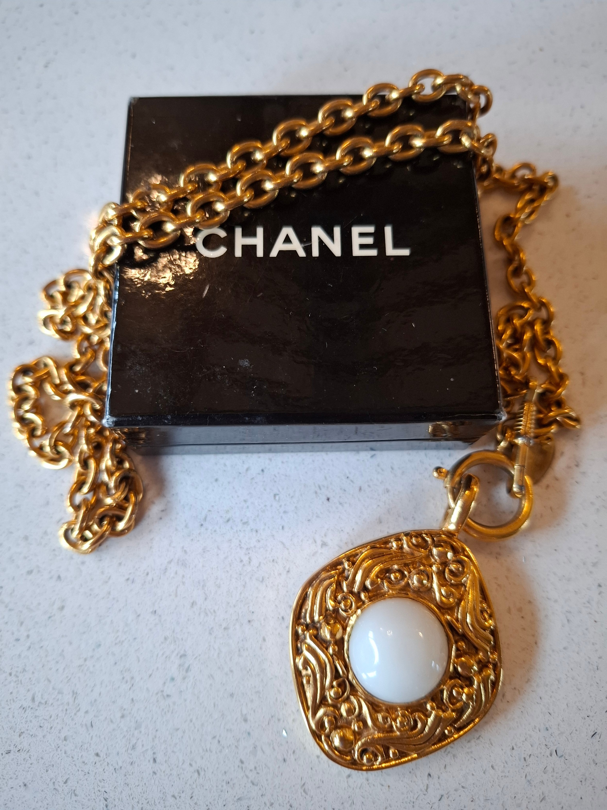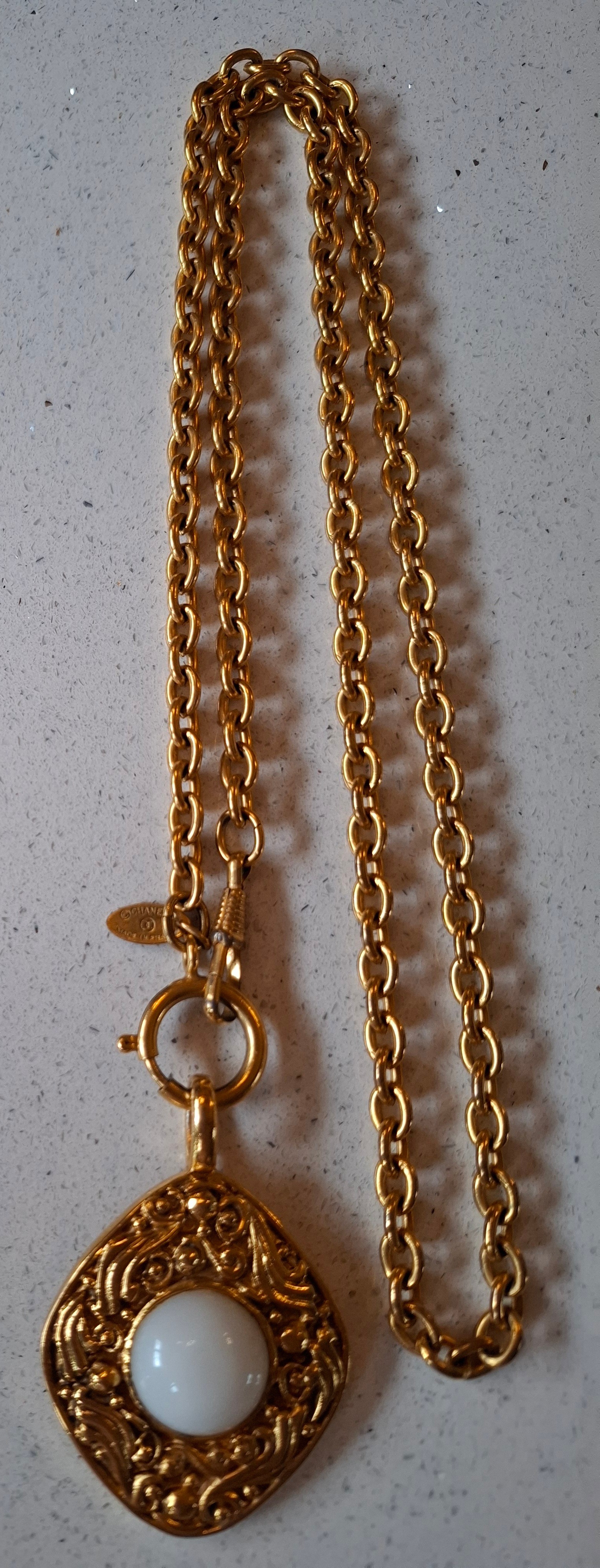 Chanel-A 1980's gold tone necklace having an open link chain and rhombus shaped pendant with central white opaque cabochon, both stamped Chanel, Made in France (not inc Chanel display box). Location:Cab 1