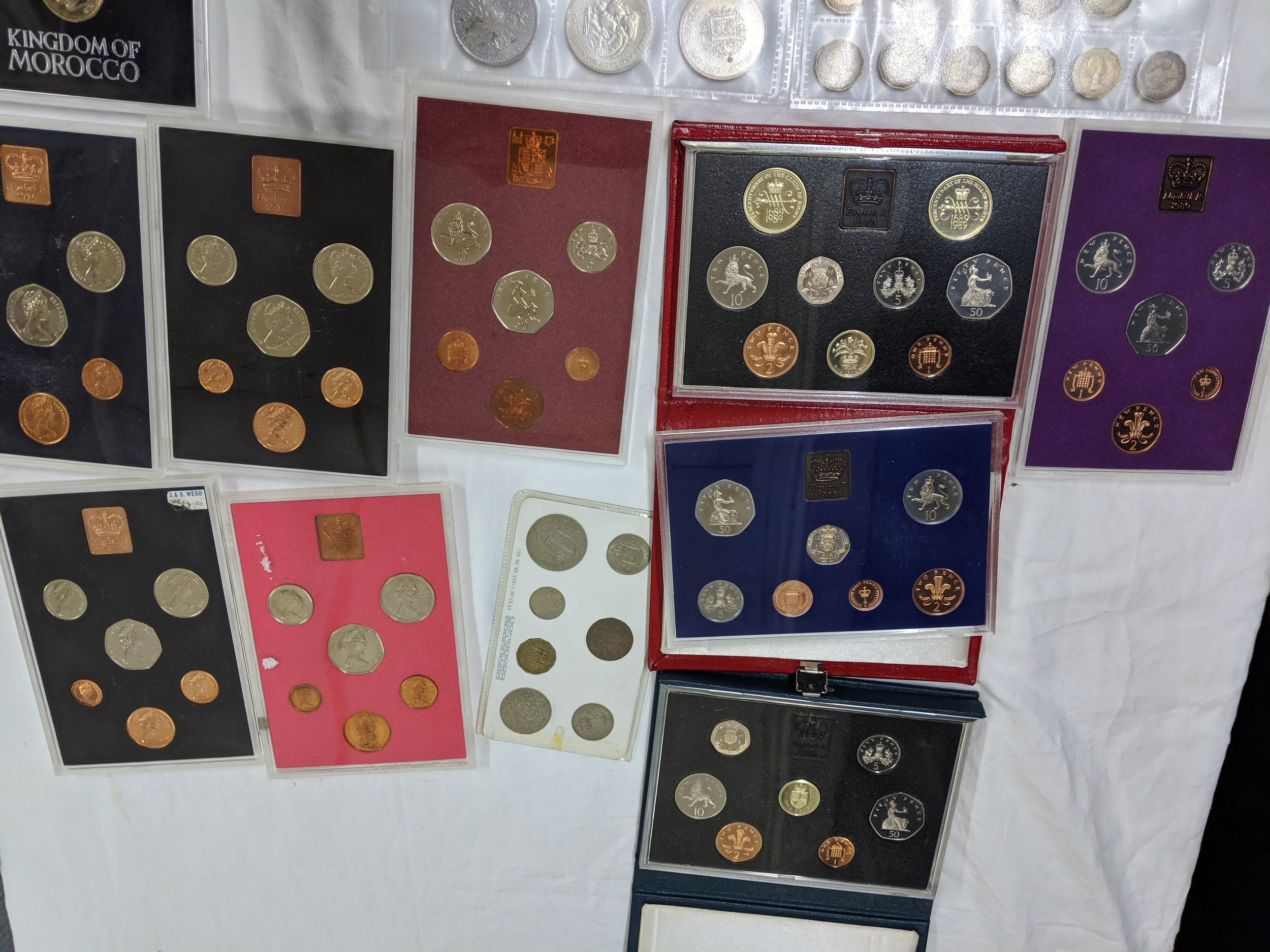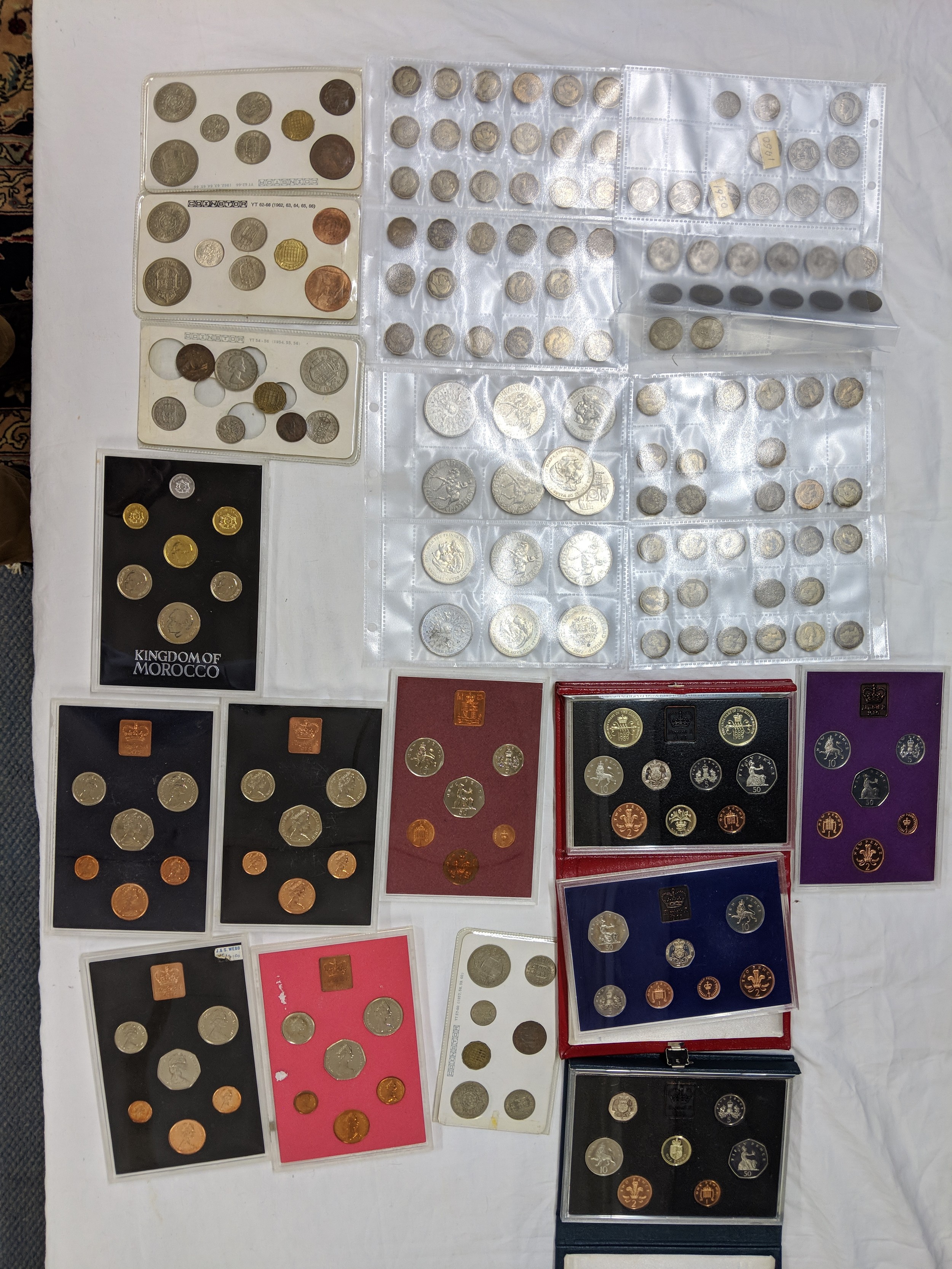 Circulated and uncirculated collectors coins to include year sets, for 1971, 1973, 1976, 1978, 1979, 1980, 1982, 1988, and 1989, a Kingdom of Morocco set, Commemorative coins, circulated 1959, 1965 and 1966 three pences and shillings