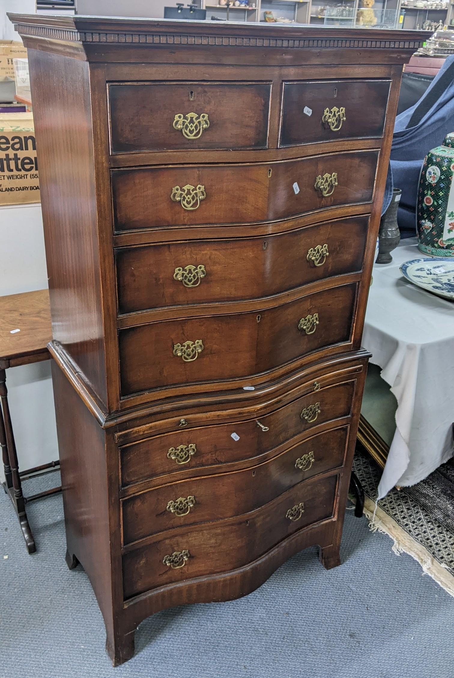 A mid-20th century mahogany Georgian inspired serpentine fronted chest on chest having a dentil moulded cornice and eight drawers 151.5cm h x 77.5cm w Location:LWB