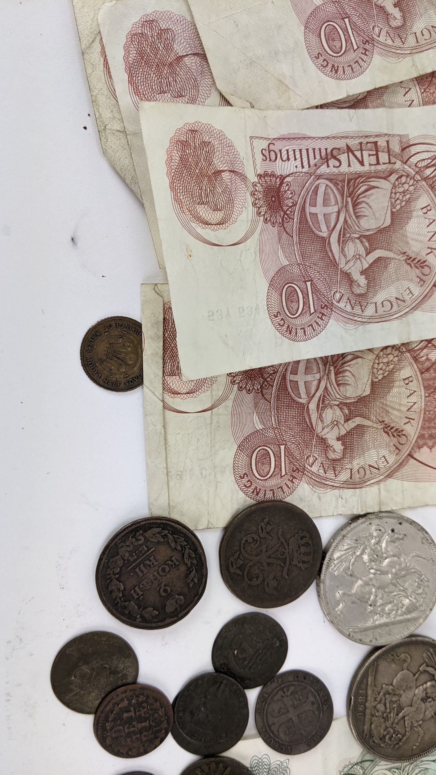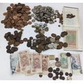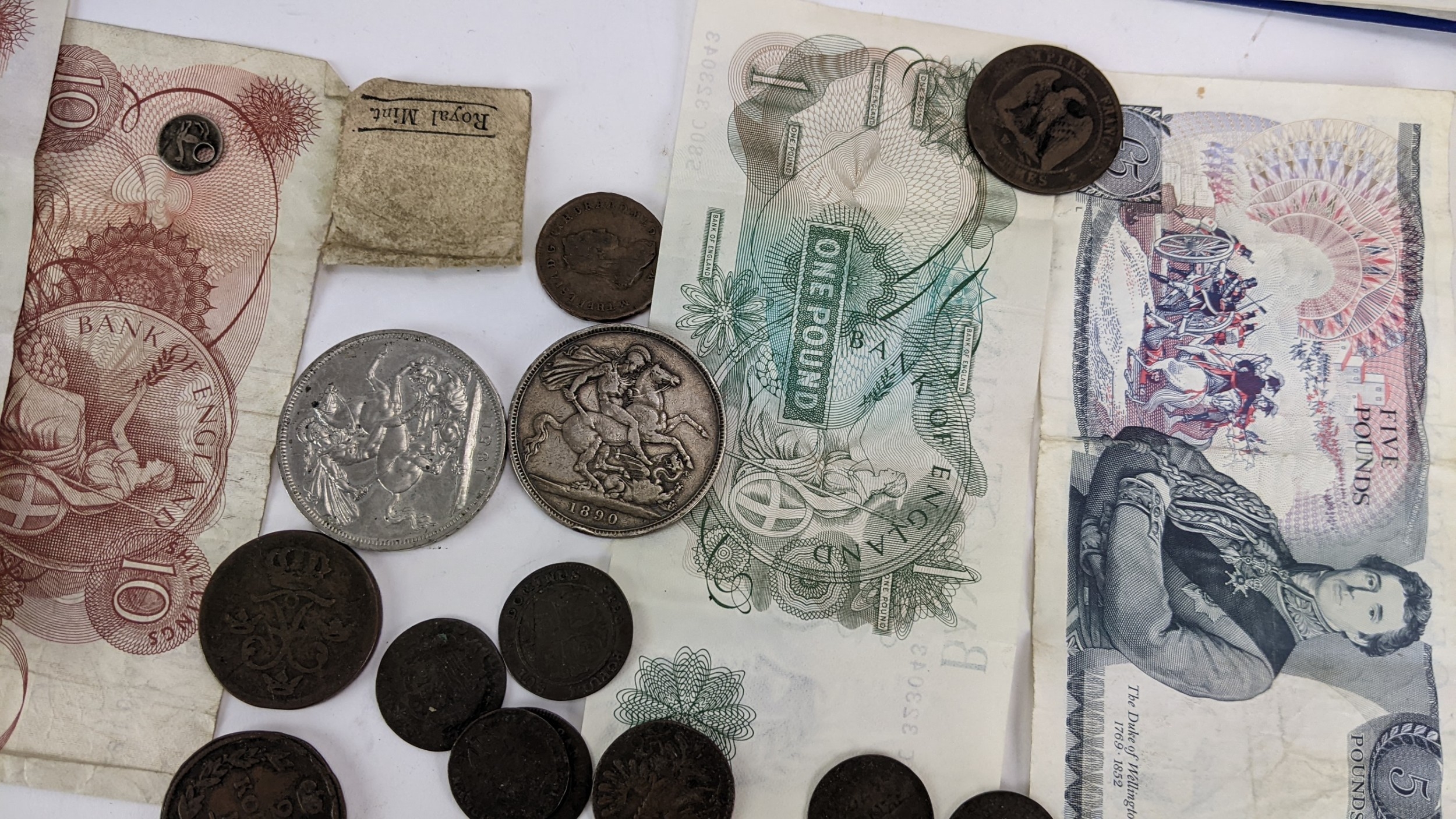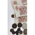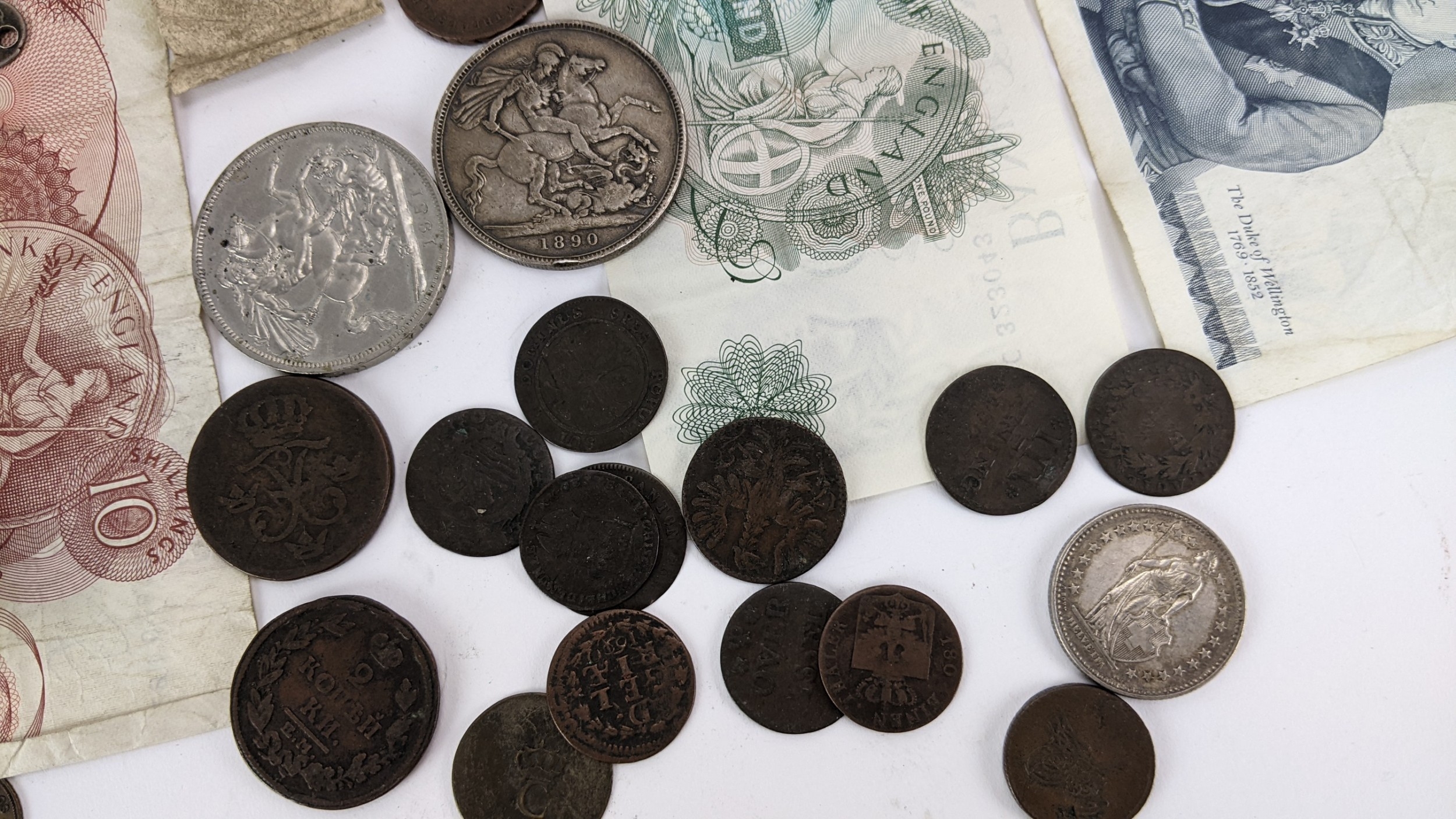 British and World coins to include, 1890 Crown, 1951 Crowns and other commemorative examples, Victoria Diamond Jubilee Coin Medal, 1846 Peru 1/4 Real (holed), Dutch East Indies, Russia 1815 2 Kopecks and others, Napoleon III, Maria Theresia Dutchy of Milan 1779 1 Soldo, German States examples, and others to include banknotes, mid 20th century British Pennies, Halfpennies, Halfcrowns and Shillings,