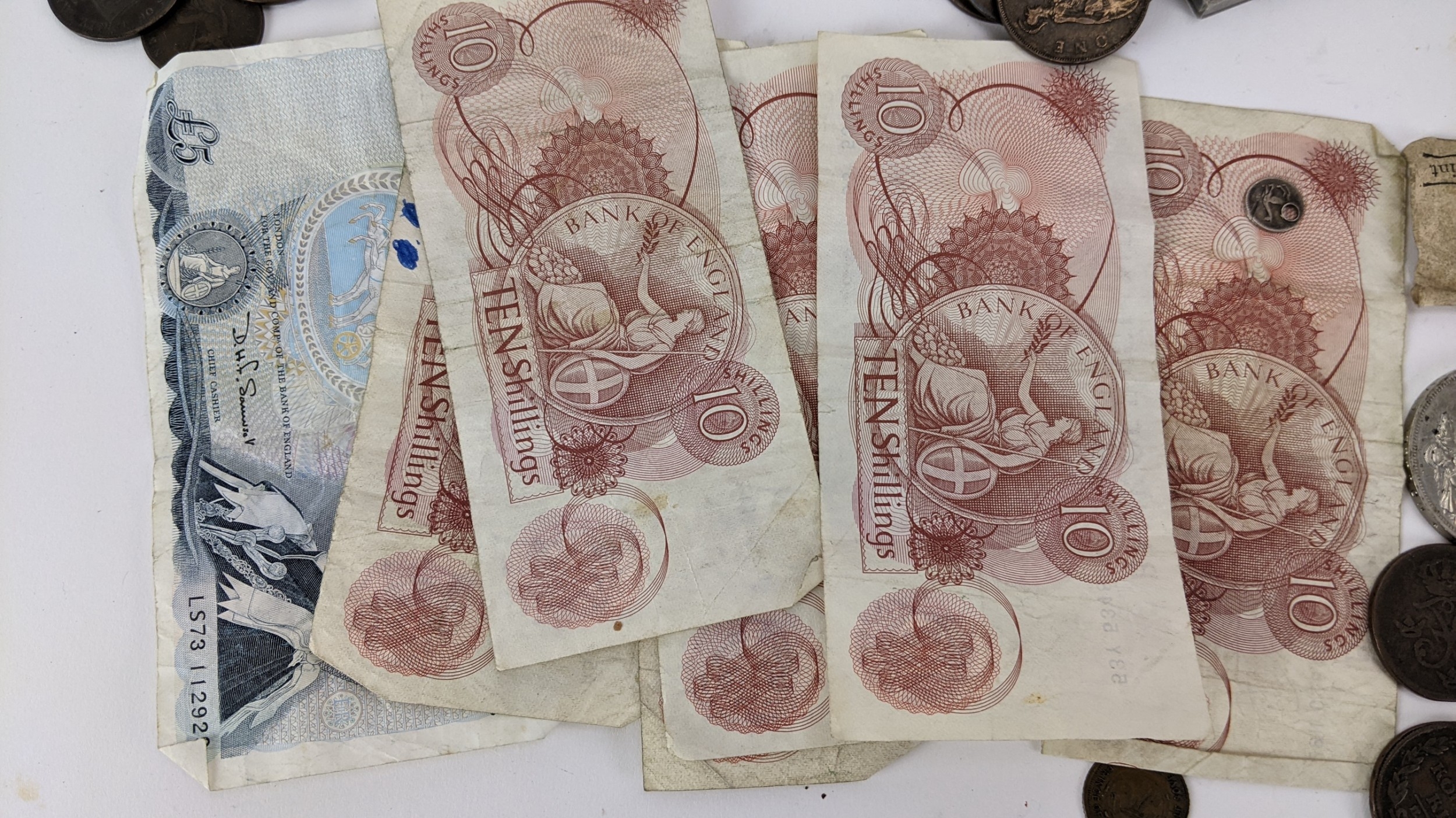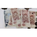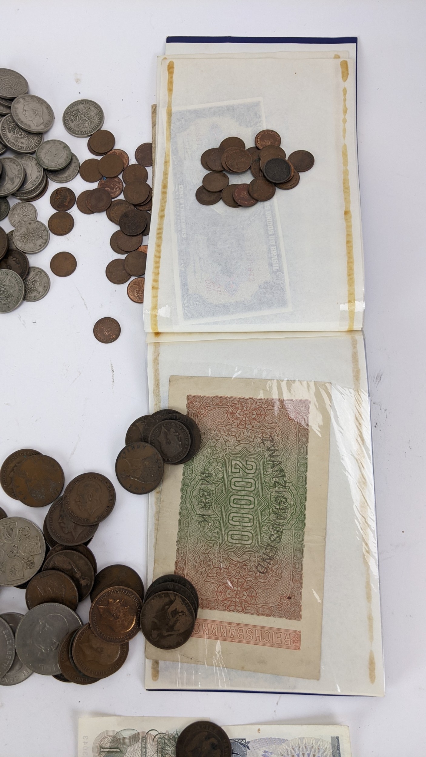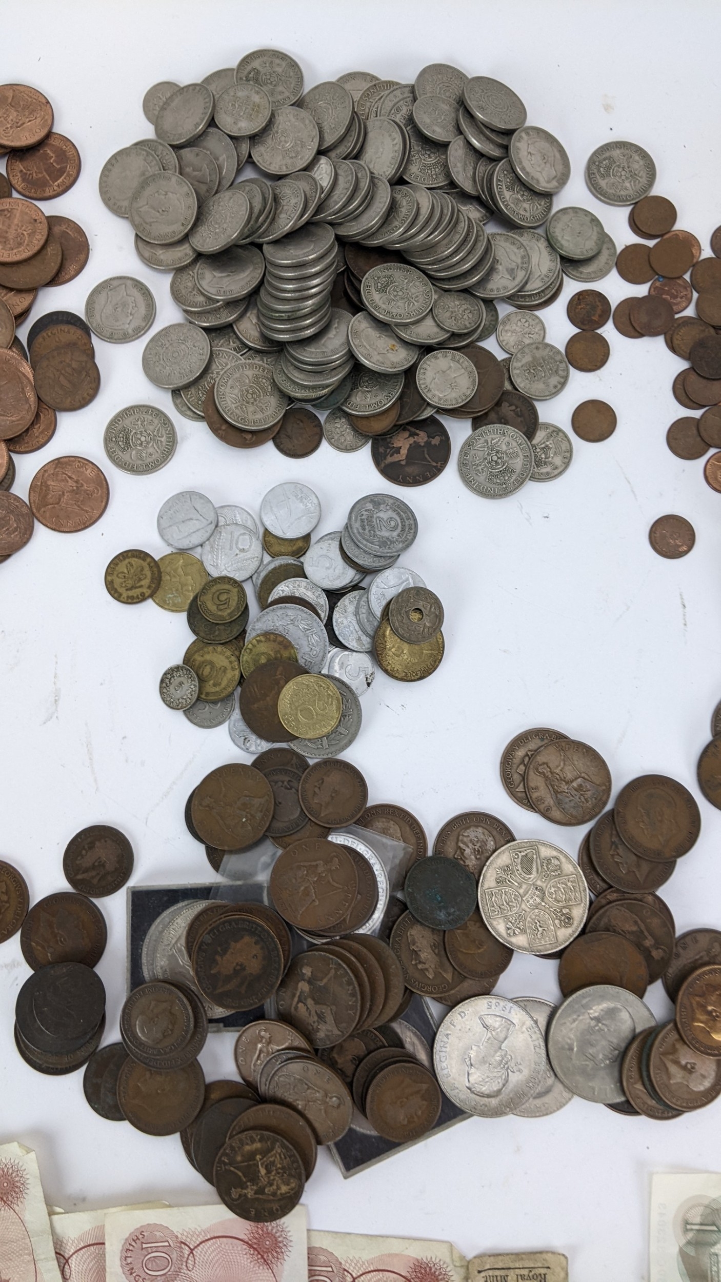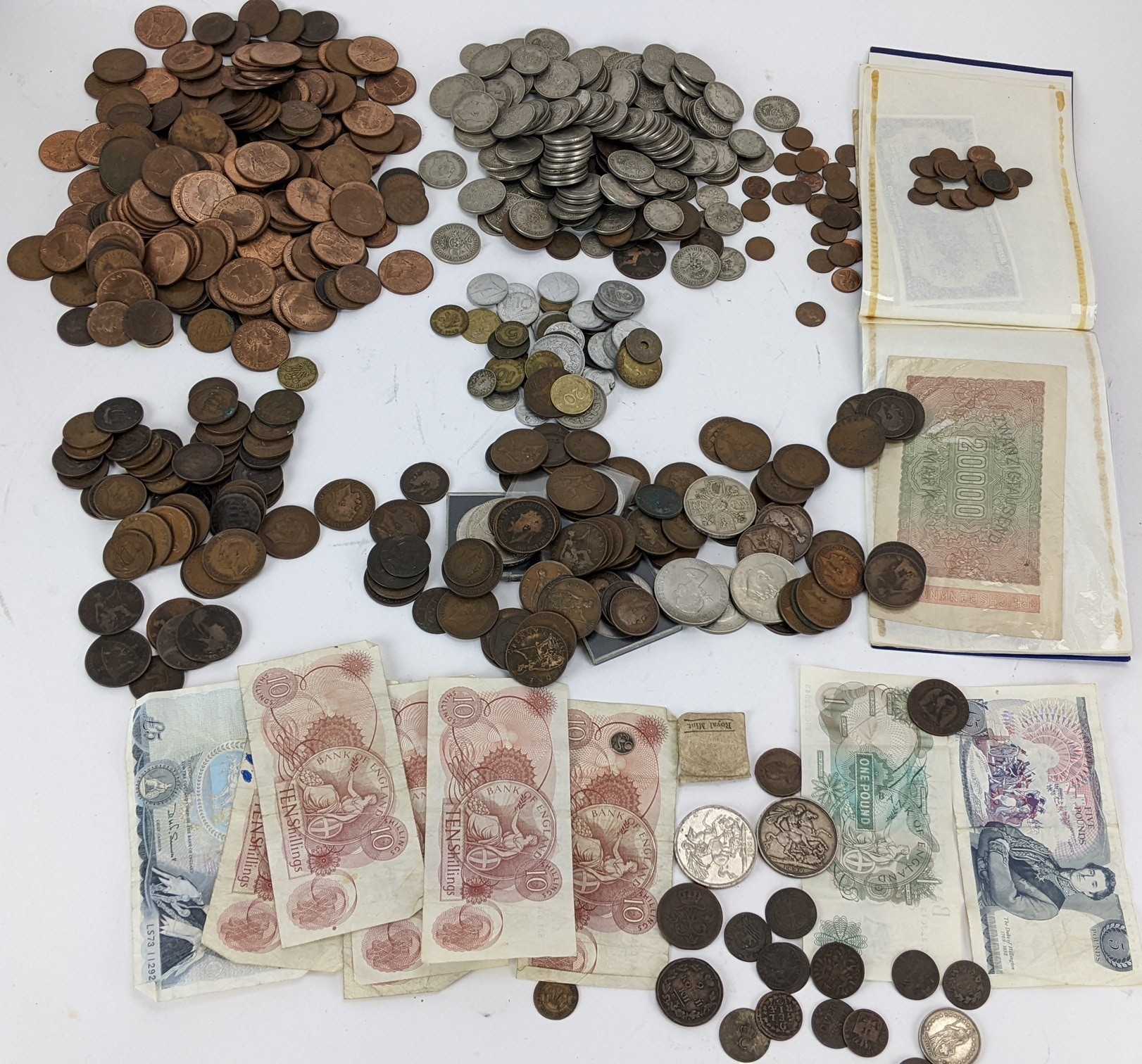 British and World coins to include, 1890 Crown, 1951 Crowns and other commemorative examples, Victoria Diamond Jubilee Coin Medal, 1846 Peru 1/4 Real (holed), Dutch East Indies, Russia 1815 2 Kopecks and others, Napoleon III, Maria Theresia Dutchy of Milan 1779 1 Soldo, German States examples, and others to include banknotes, mid 20th century British Pennies, Halfpennies, Halfcrowns and Shillings,