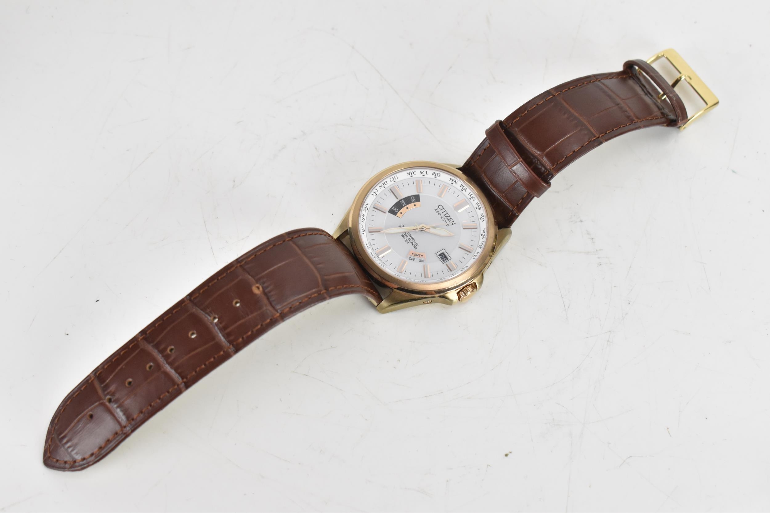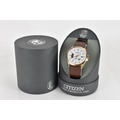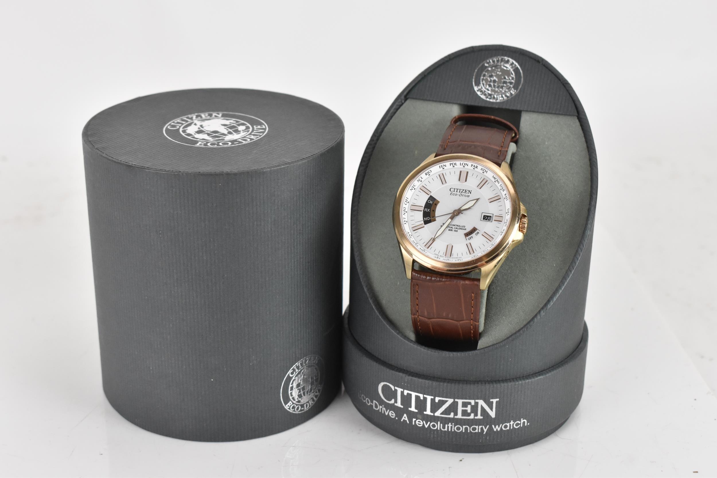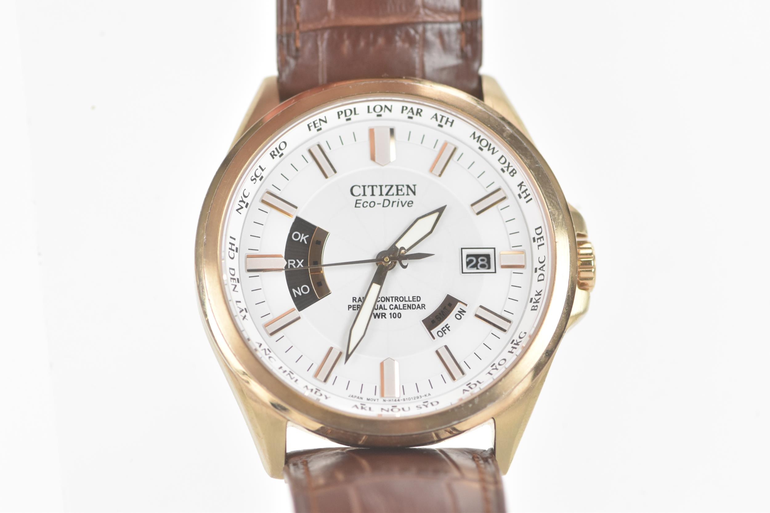 A Citizen Eco-Drive Radio Controlled Perpetual Calender WR100, quartz, gents wristwatch, the white dial having a date aperture at 3, synchronised time adjustment in 26 time zones, on a brown leather strap, with original box, 43mm
