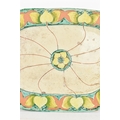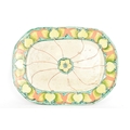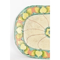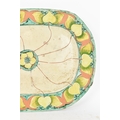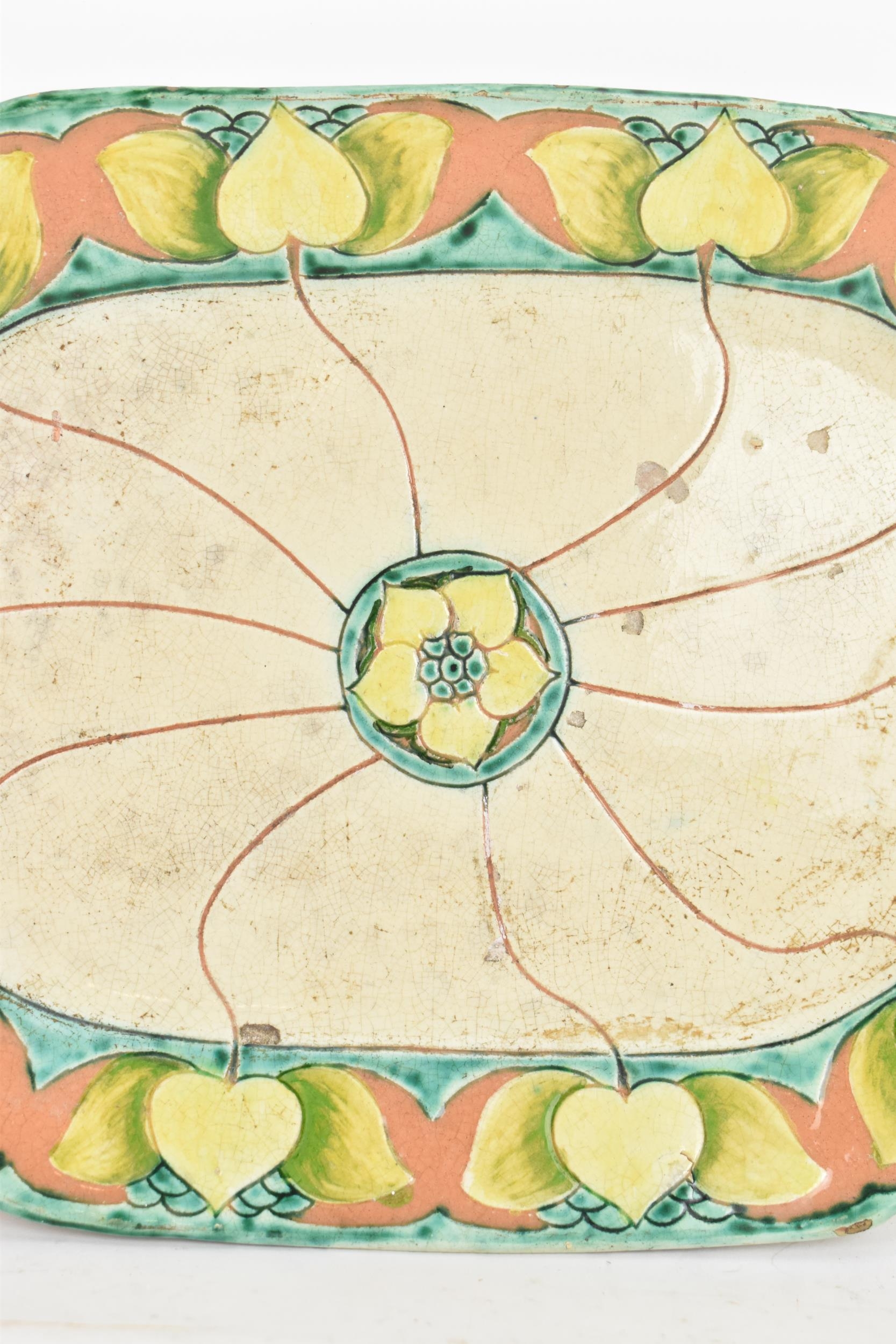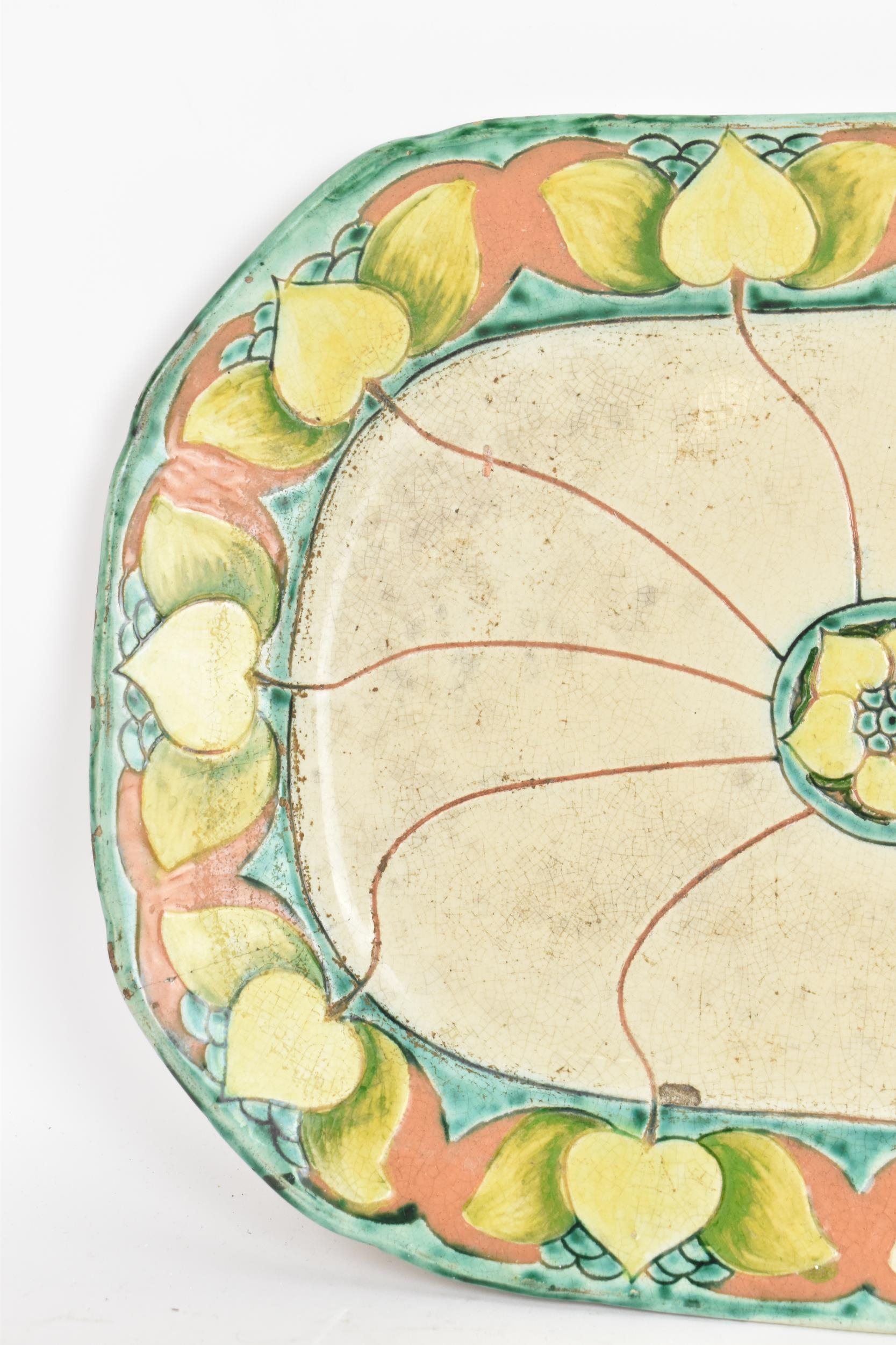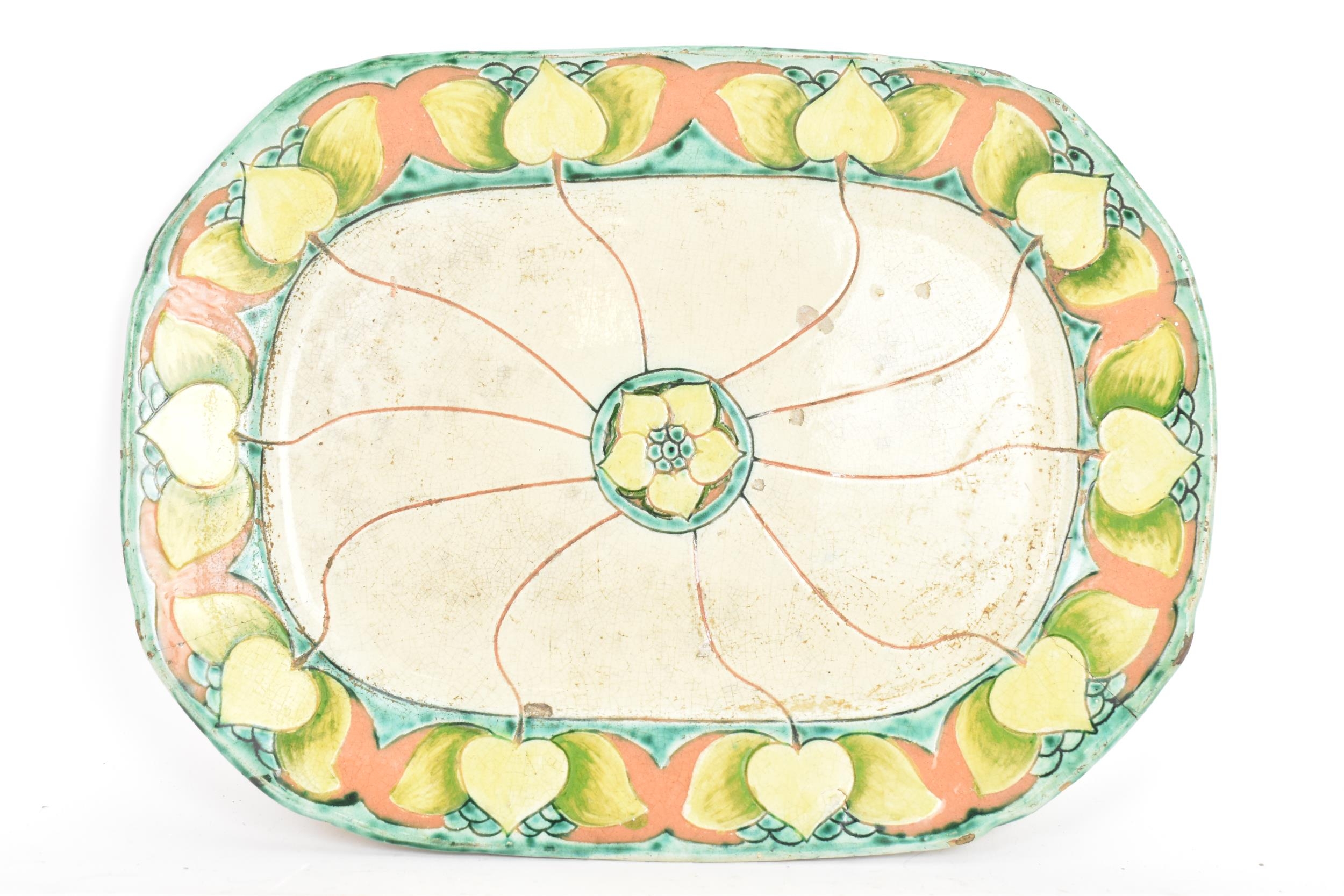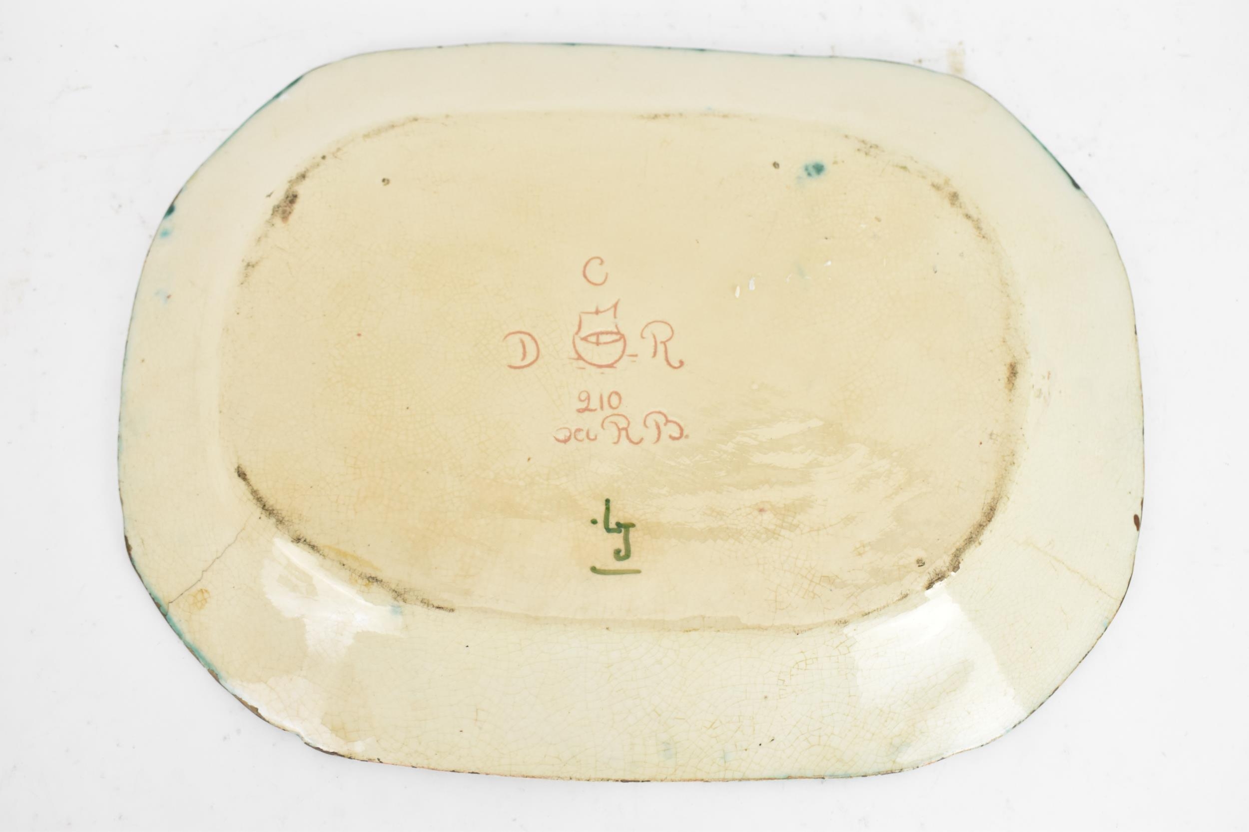 A circa 1900 Della Robbia pottery meat plate, having a central flower head motif with branches terminating to the turquoise glazed border with overlapping leaves, incised and painted marks to the base, 33cm x 24.5cm
