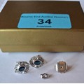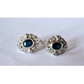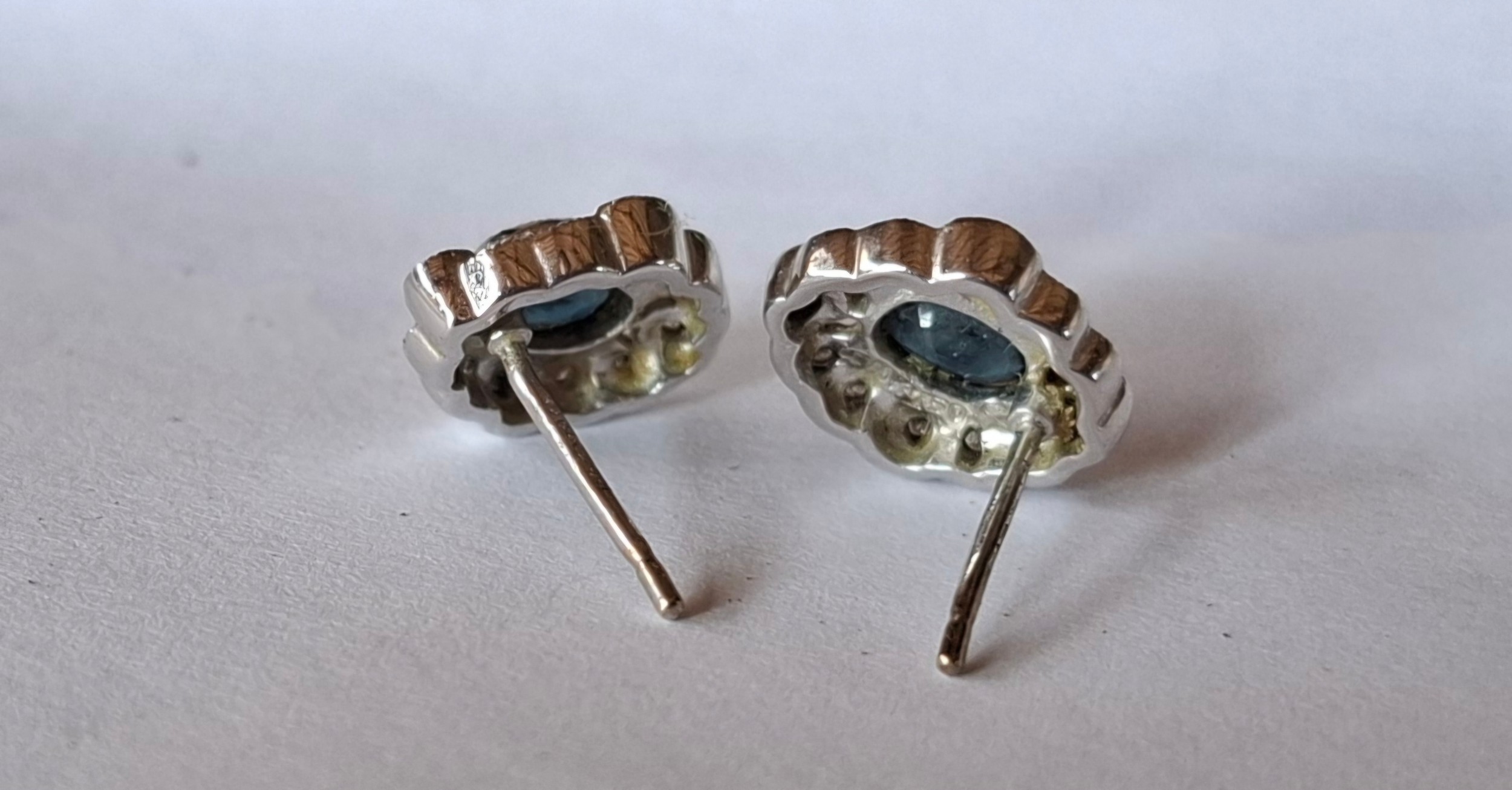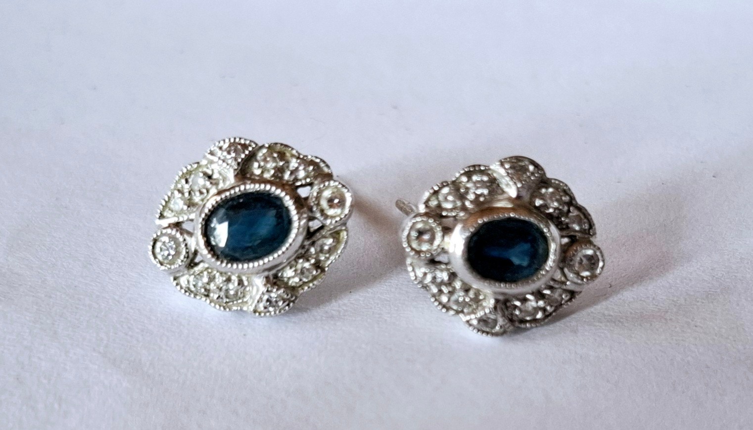 A pair of 18ct white gold earrings stamped 750 having a central blue sapphire surrounded by illusion set diamonds, total weight 3.37g having a silver earring back and a silver tone earring back. Location:Cab 1