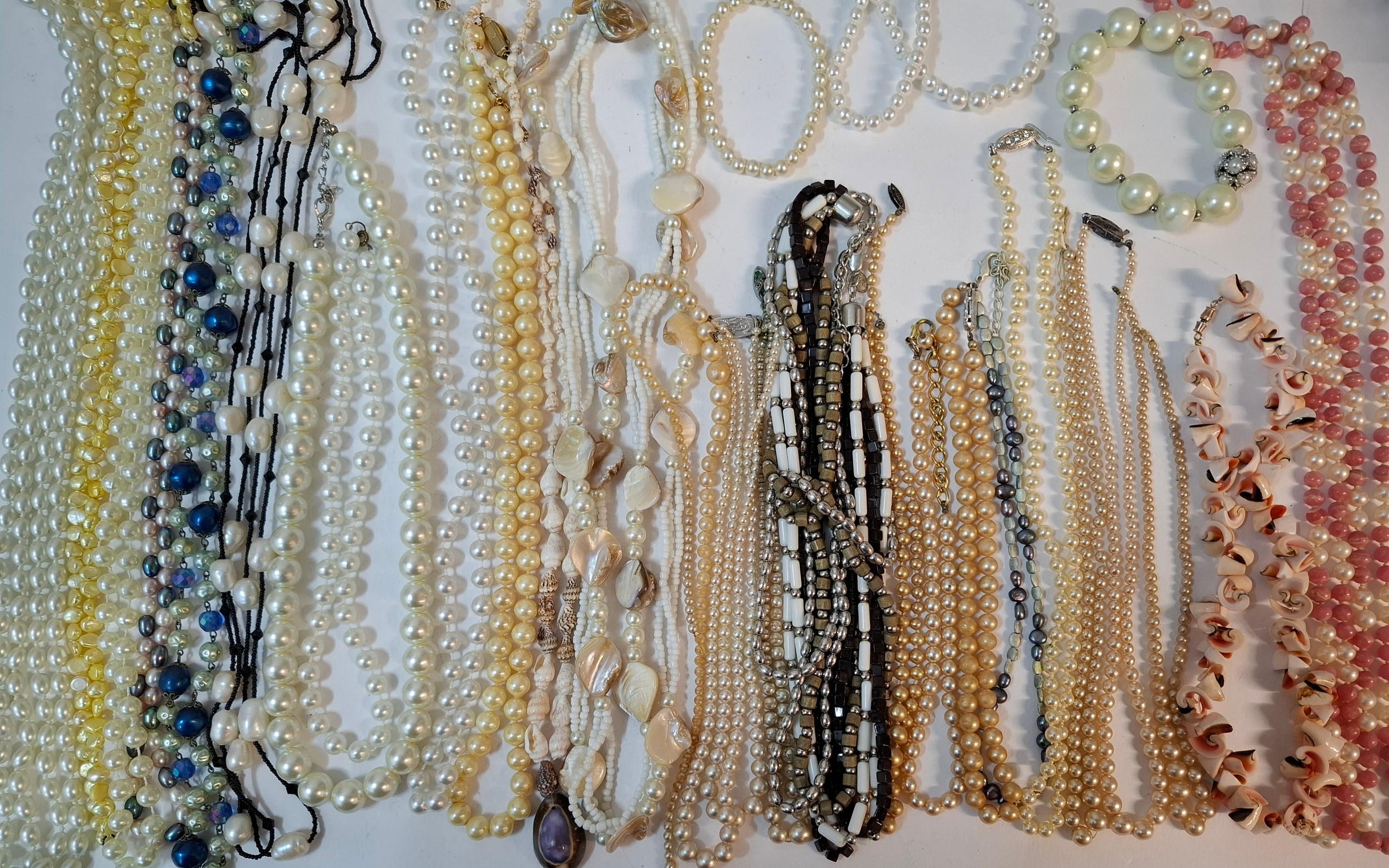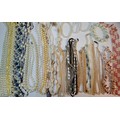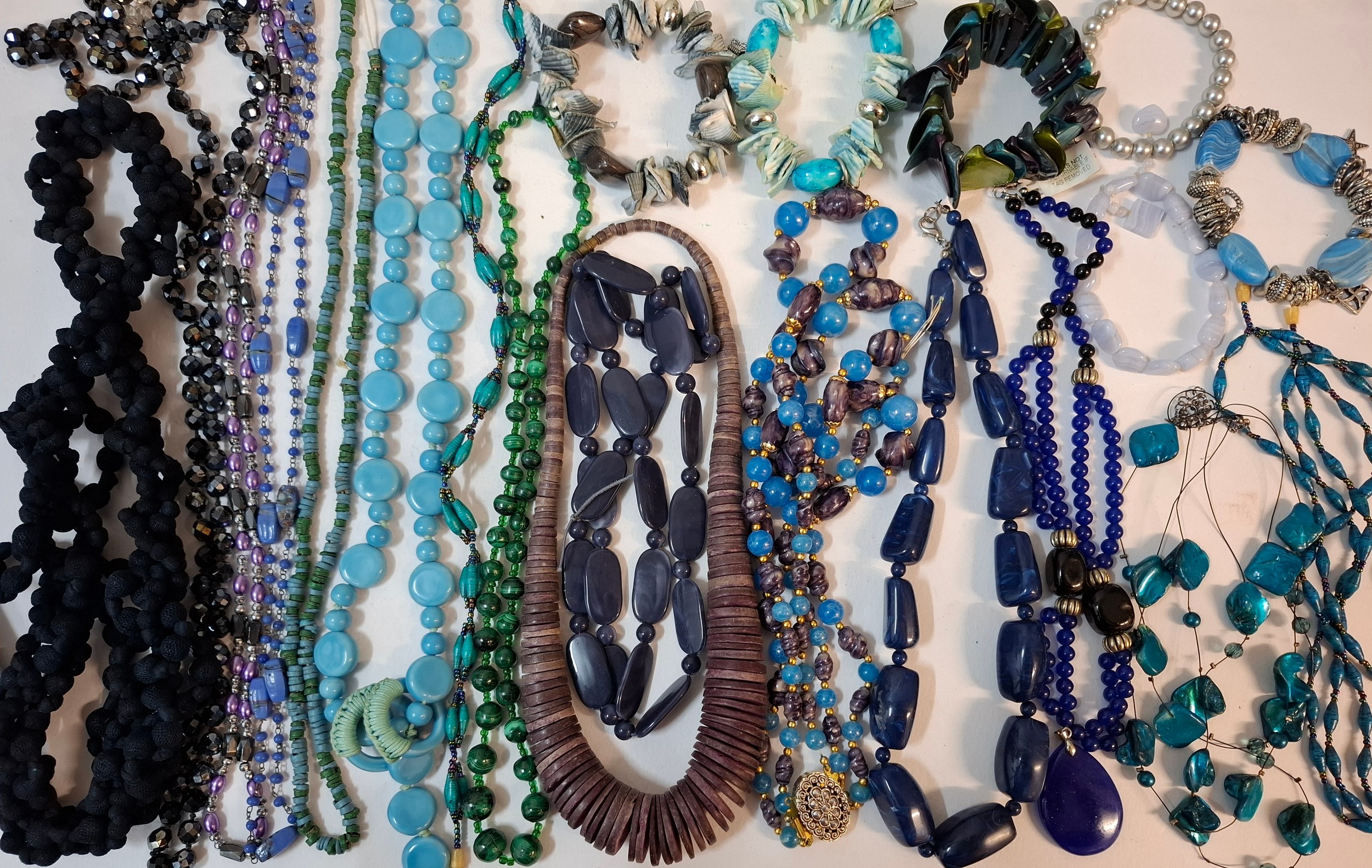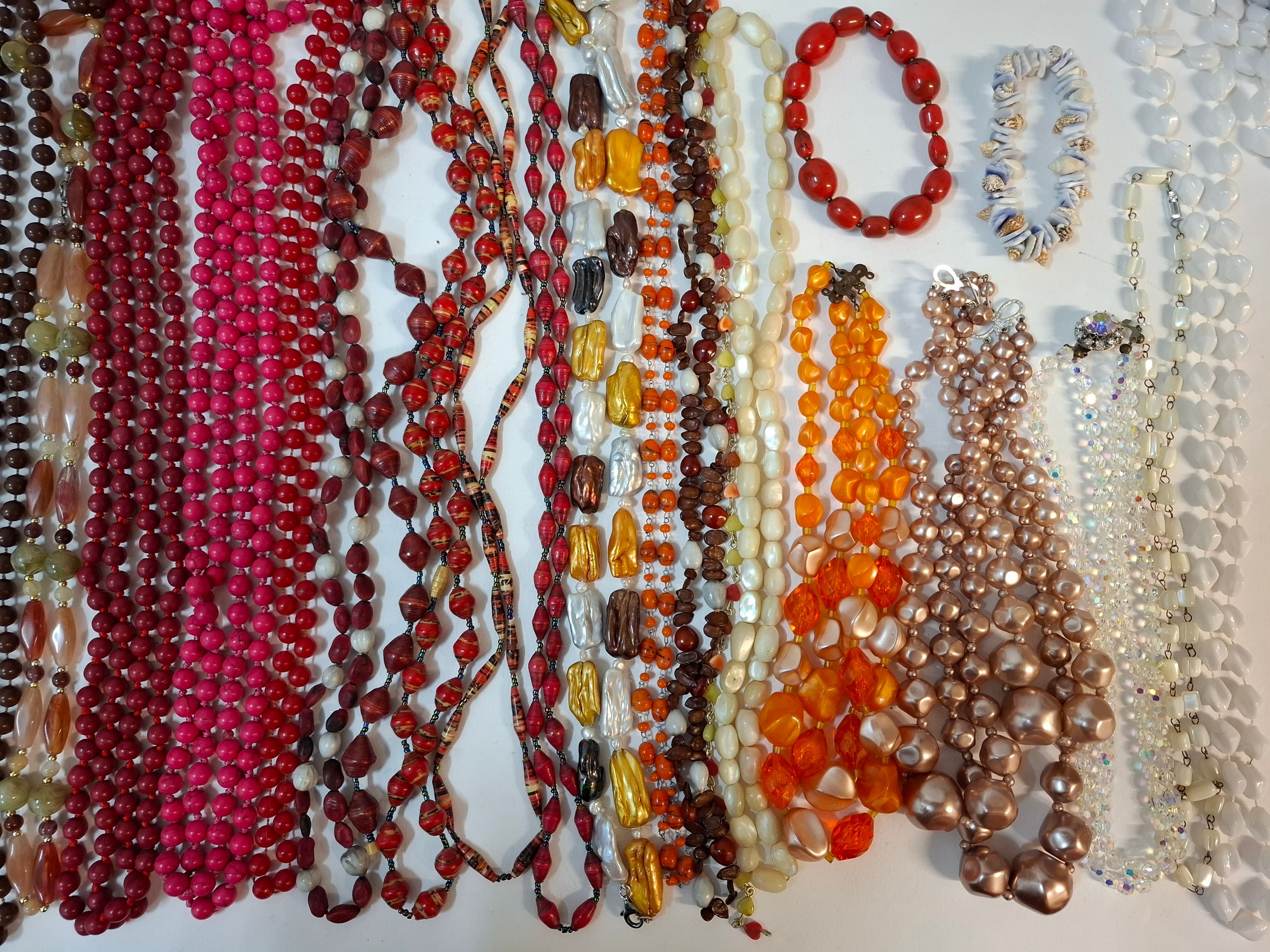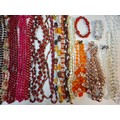 A quantity of 1970's and later bead necklaces and bracelets to include Aurora Borealis necklaces, faux pearls A/F, extra long necklaces and a string of malachite beads. Location: R1.2