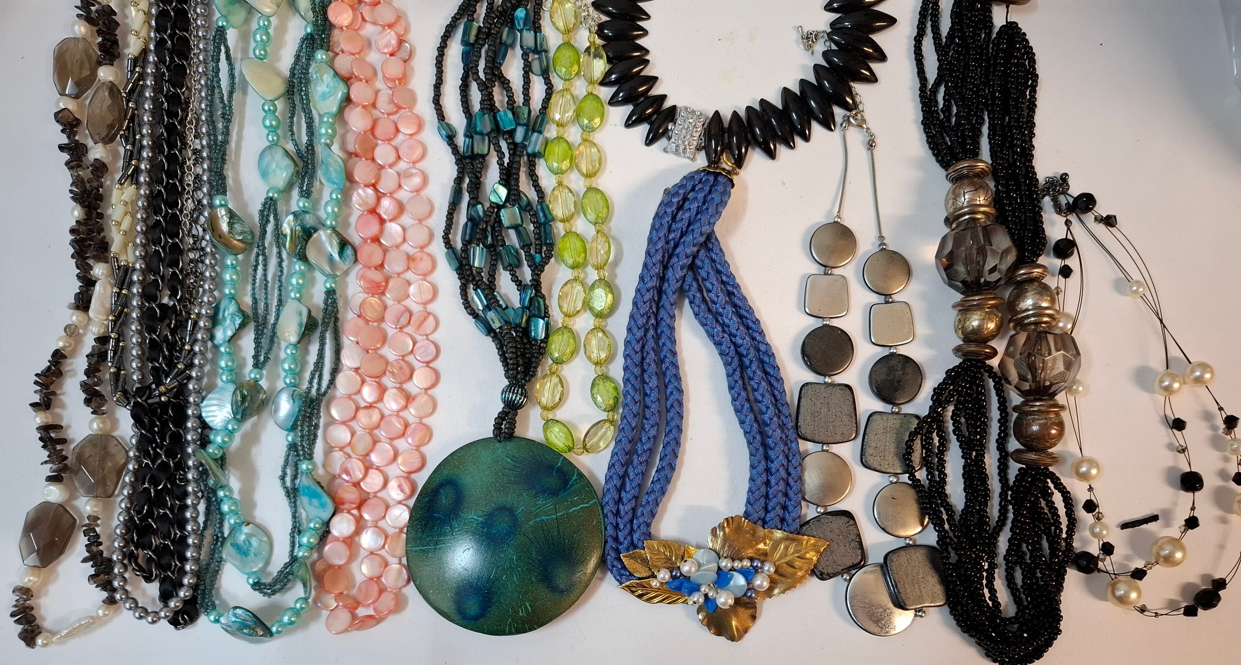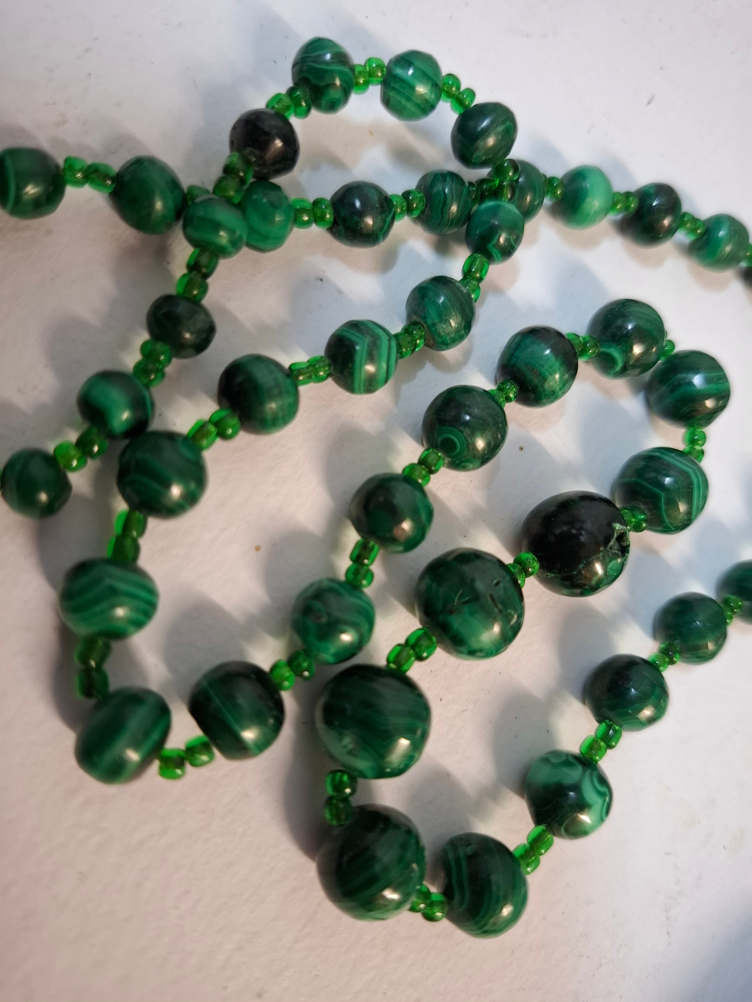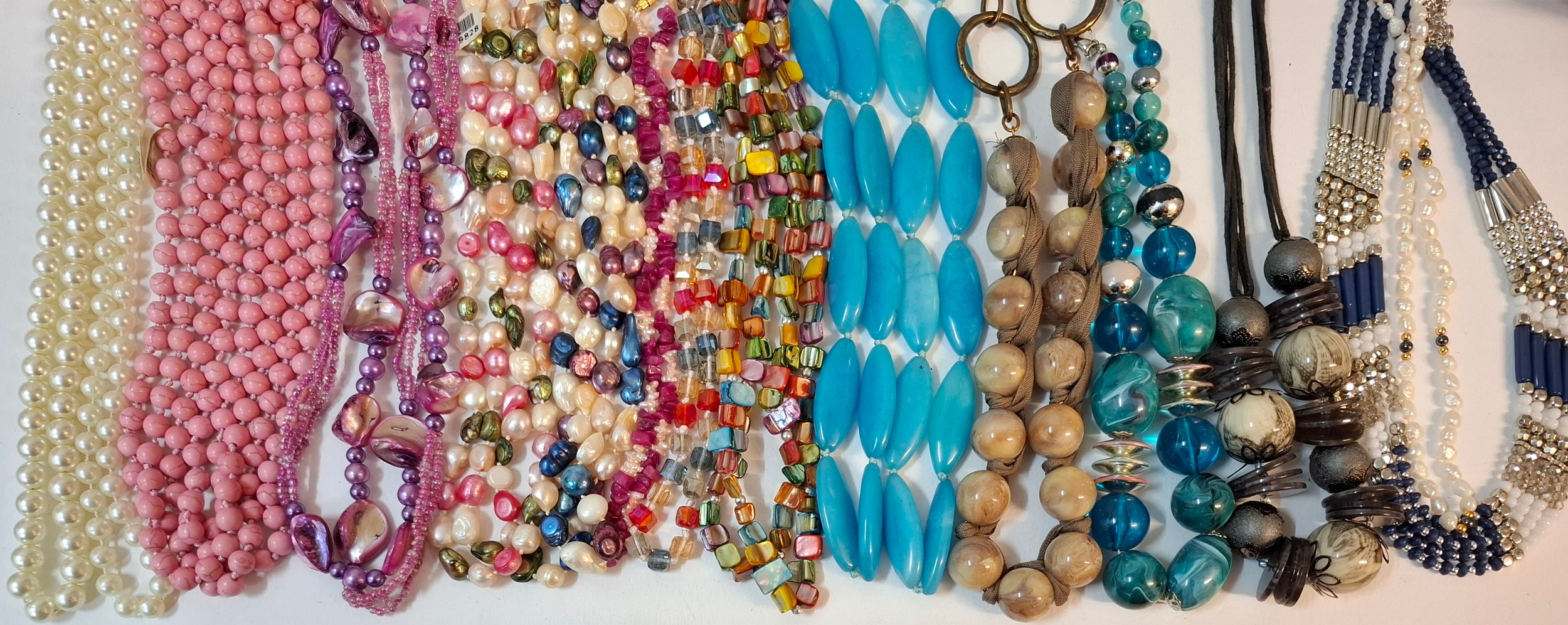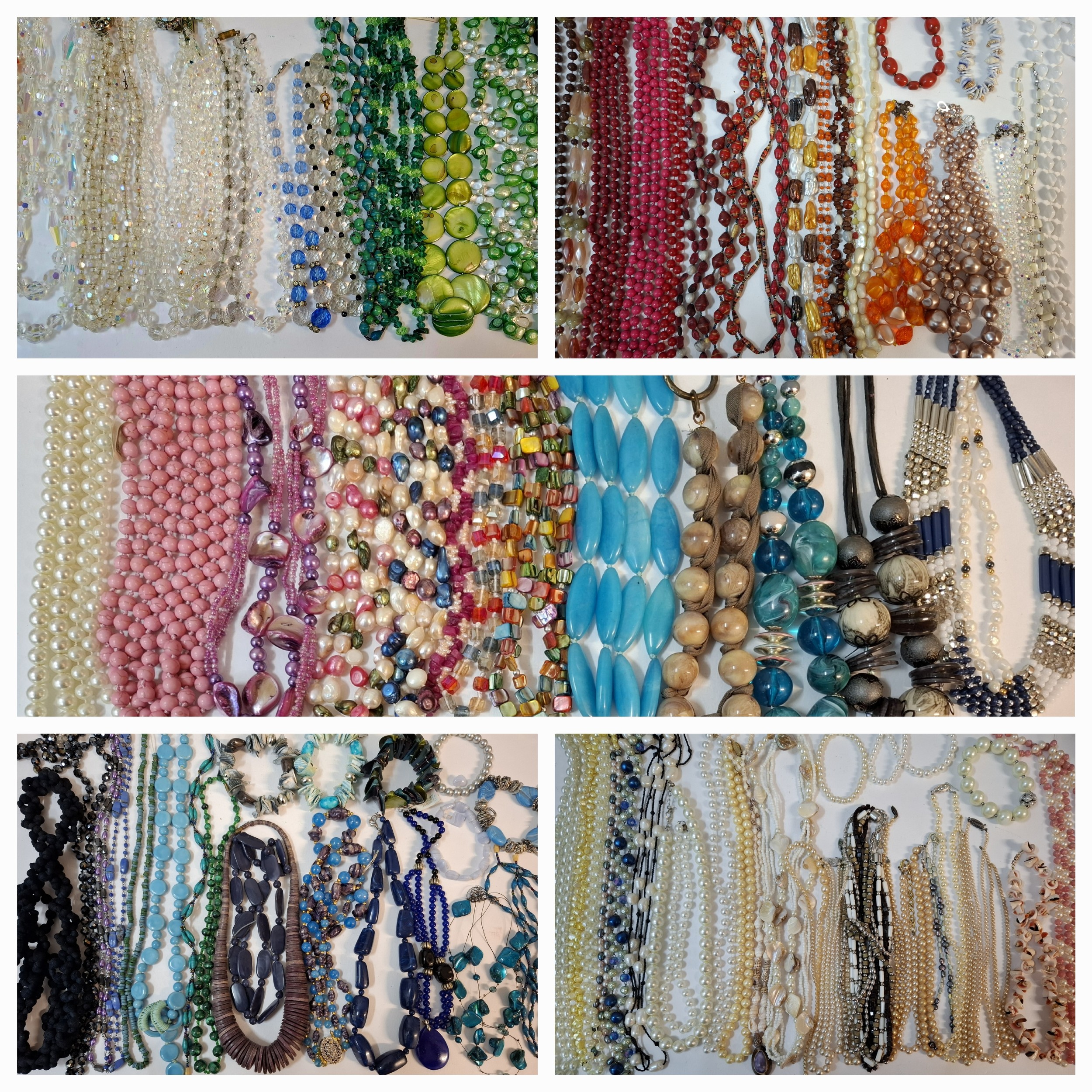 A quantity of 1970's and later bead necklaces and bracelets to include Aurora Borealis necklaces, faux pearls A/F, extra long necklaces and a string of malachite beads. Location: R1.2