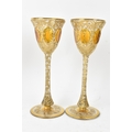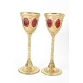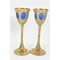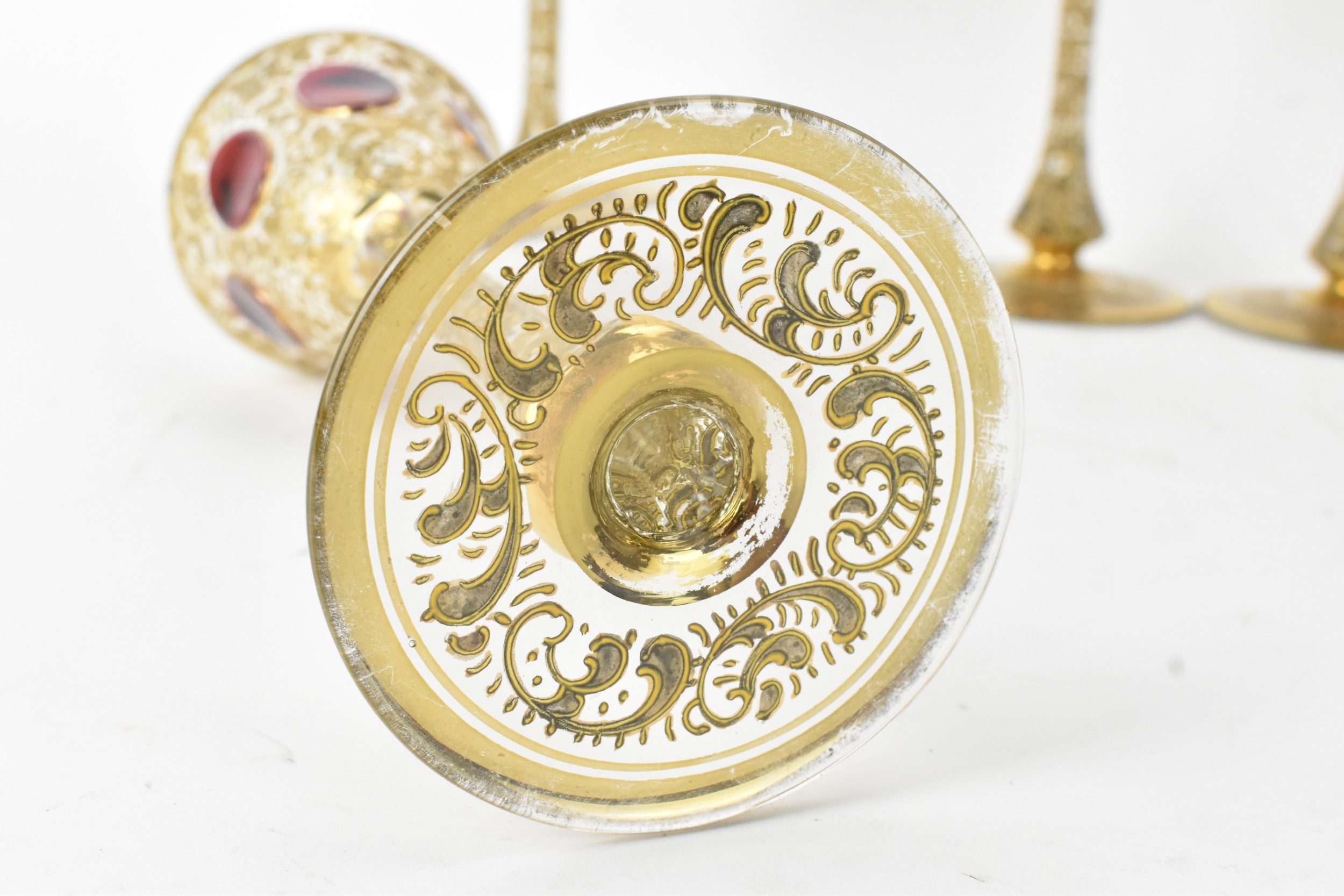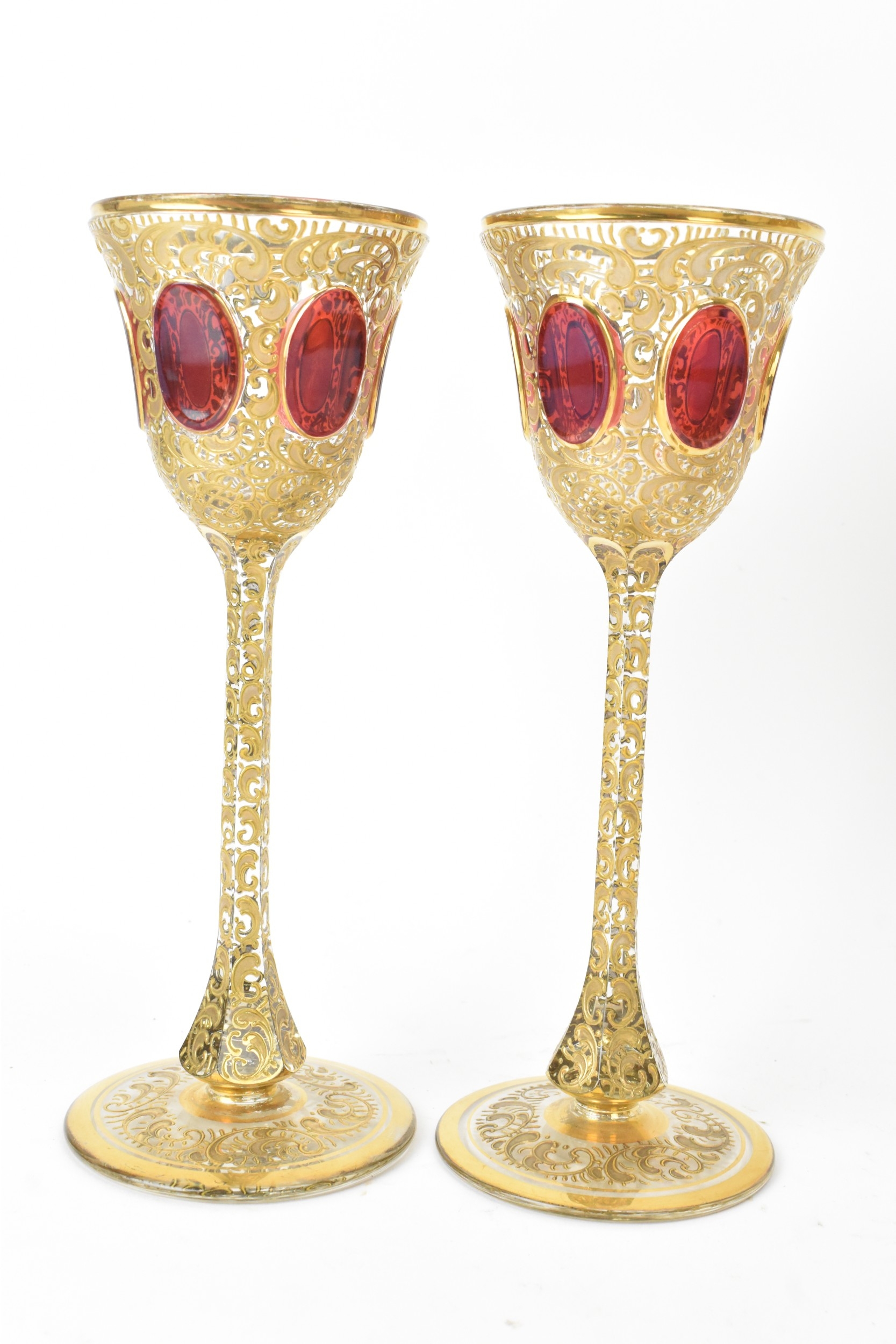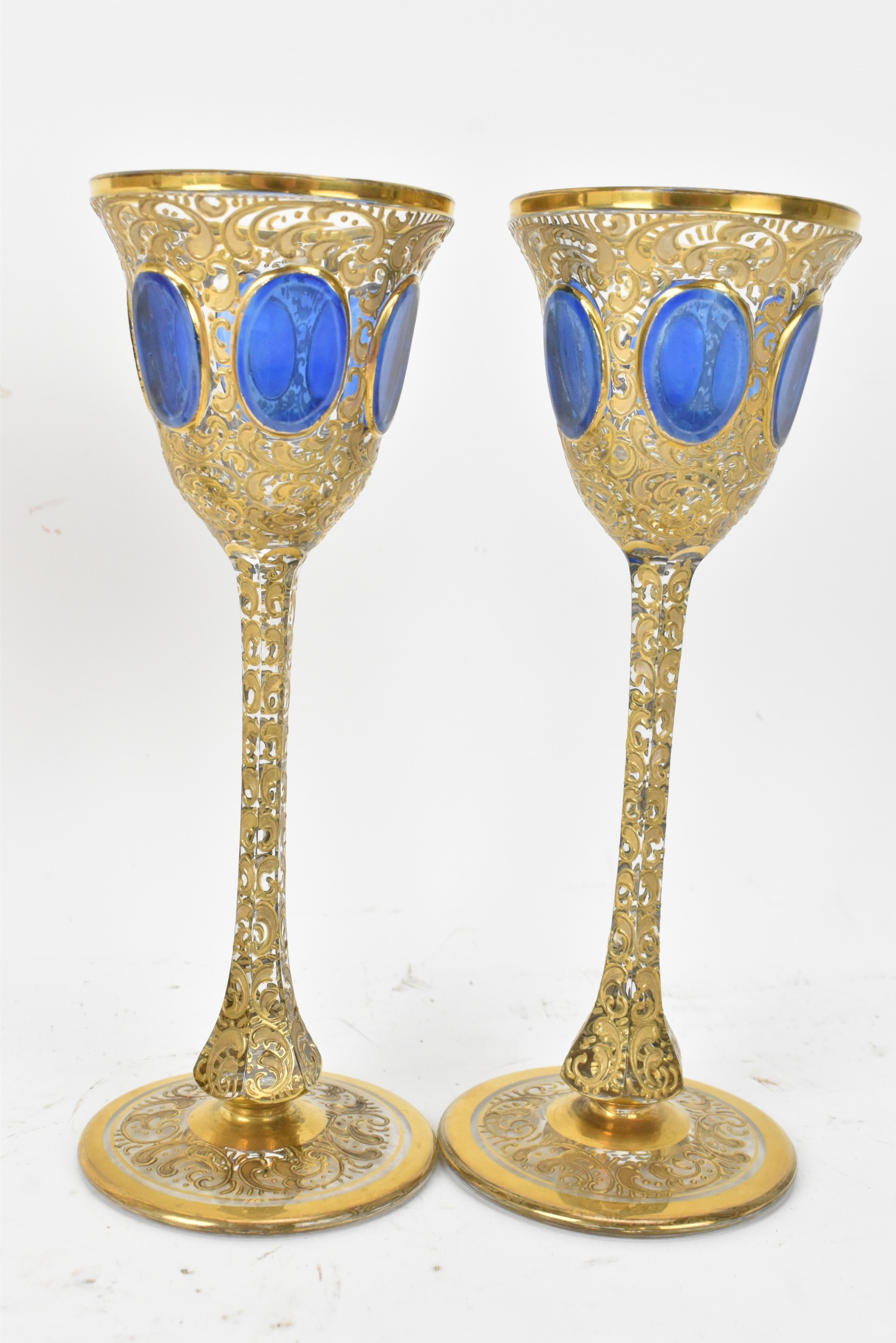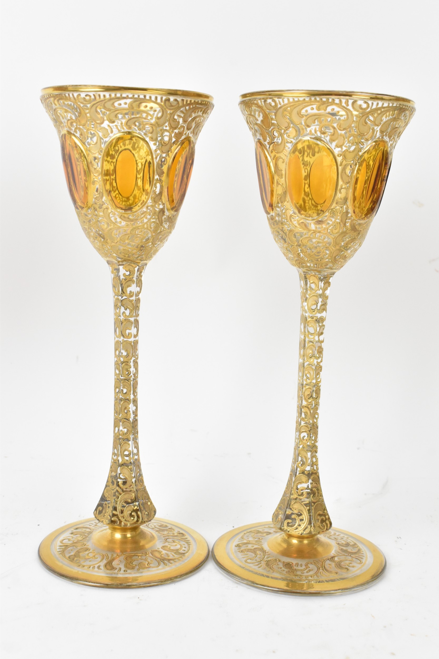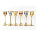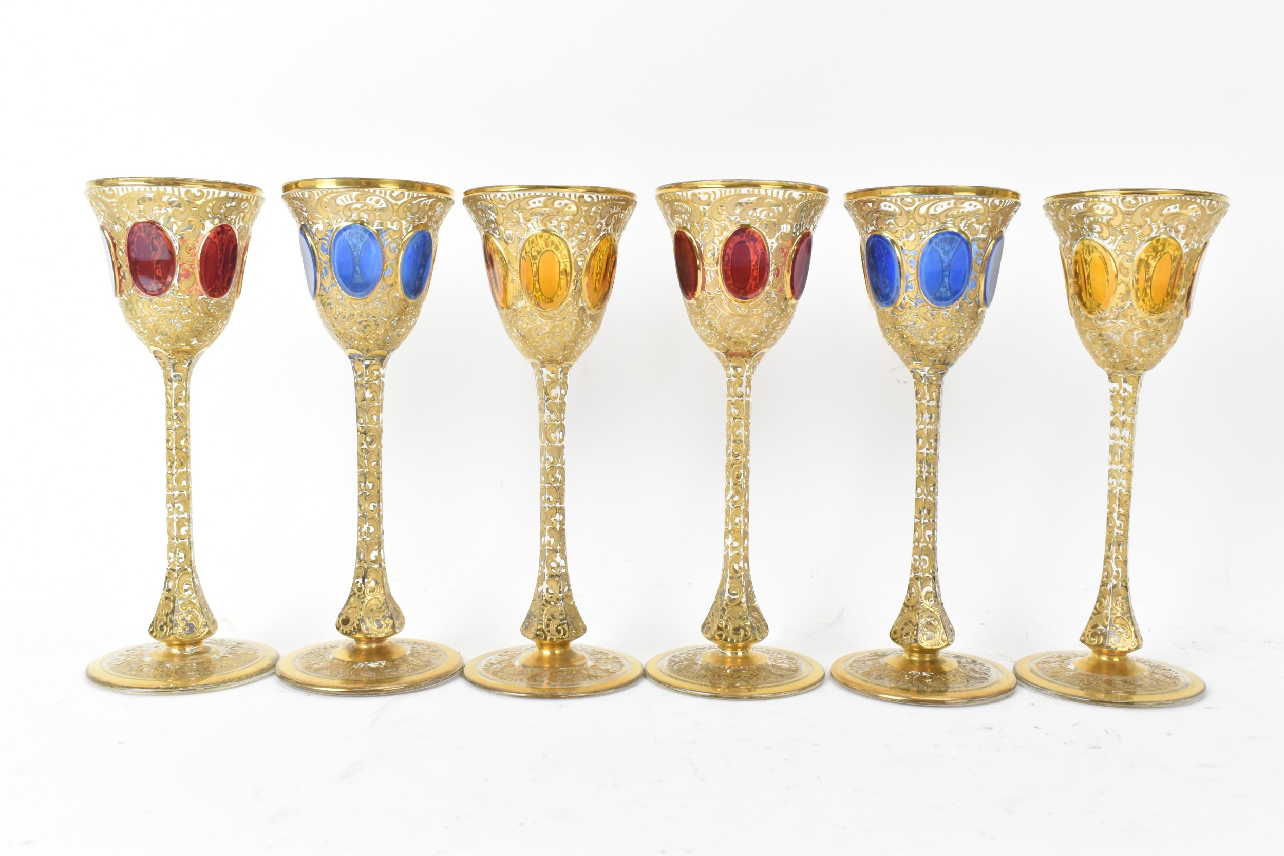 A set of six Bohemian gilt and enamelled wine glasses, possibly by Moser, each with tall slender stem and wide foot gilded with scrolling foliate designs, the bowl overlaid with openwork gilt decoration and inset with oval ruby-red, cobalt-blue, and amber-yellow cabochon-style panels, 21cm high
