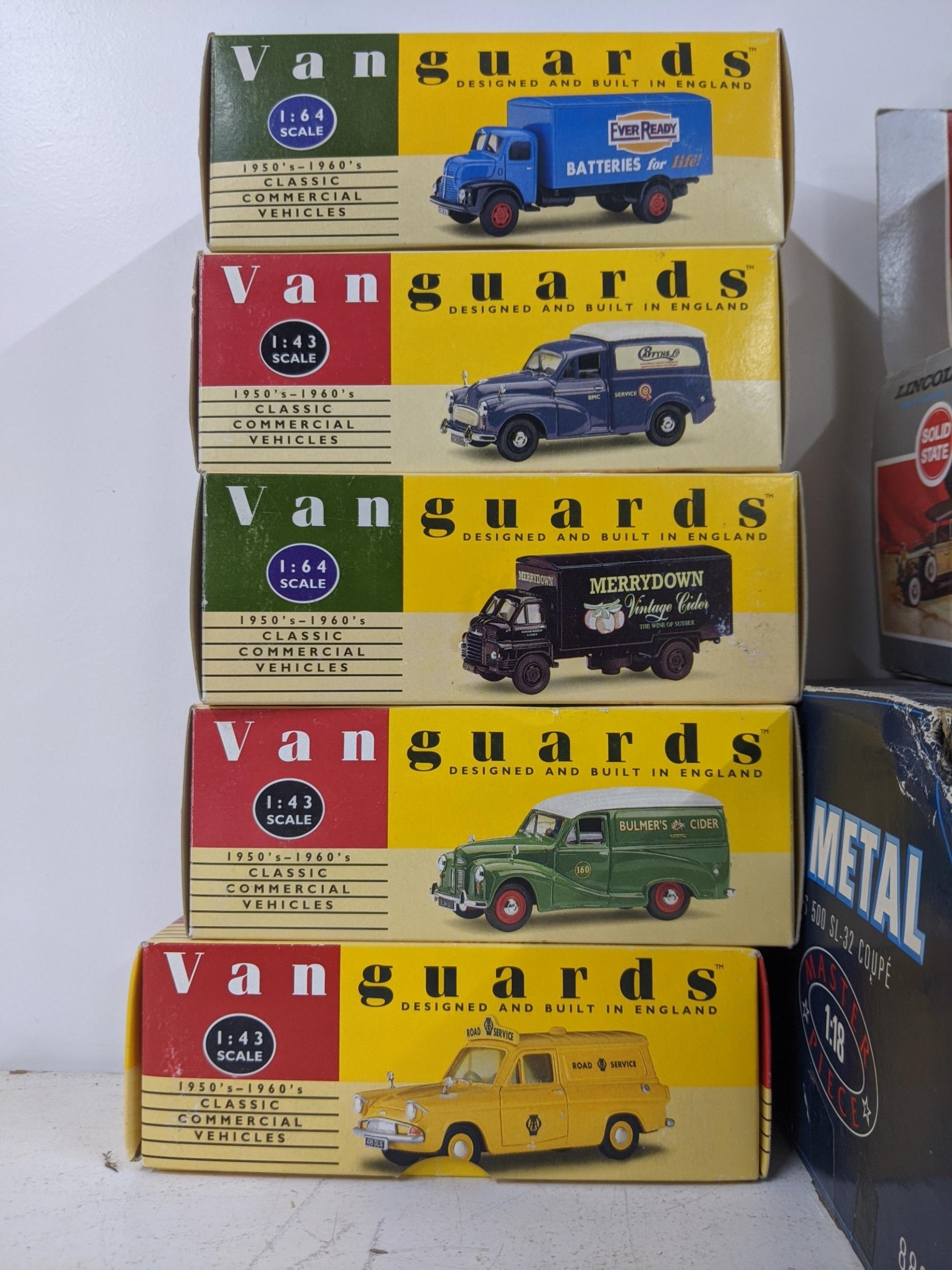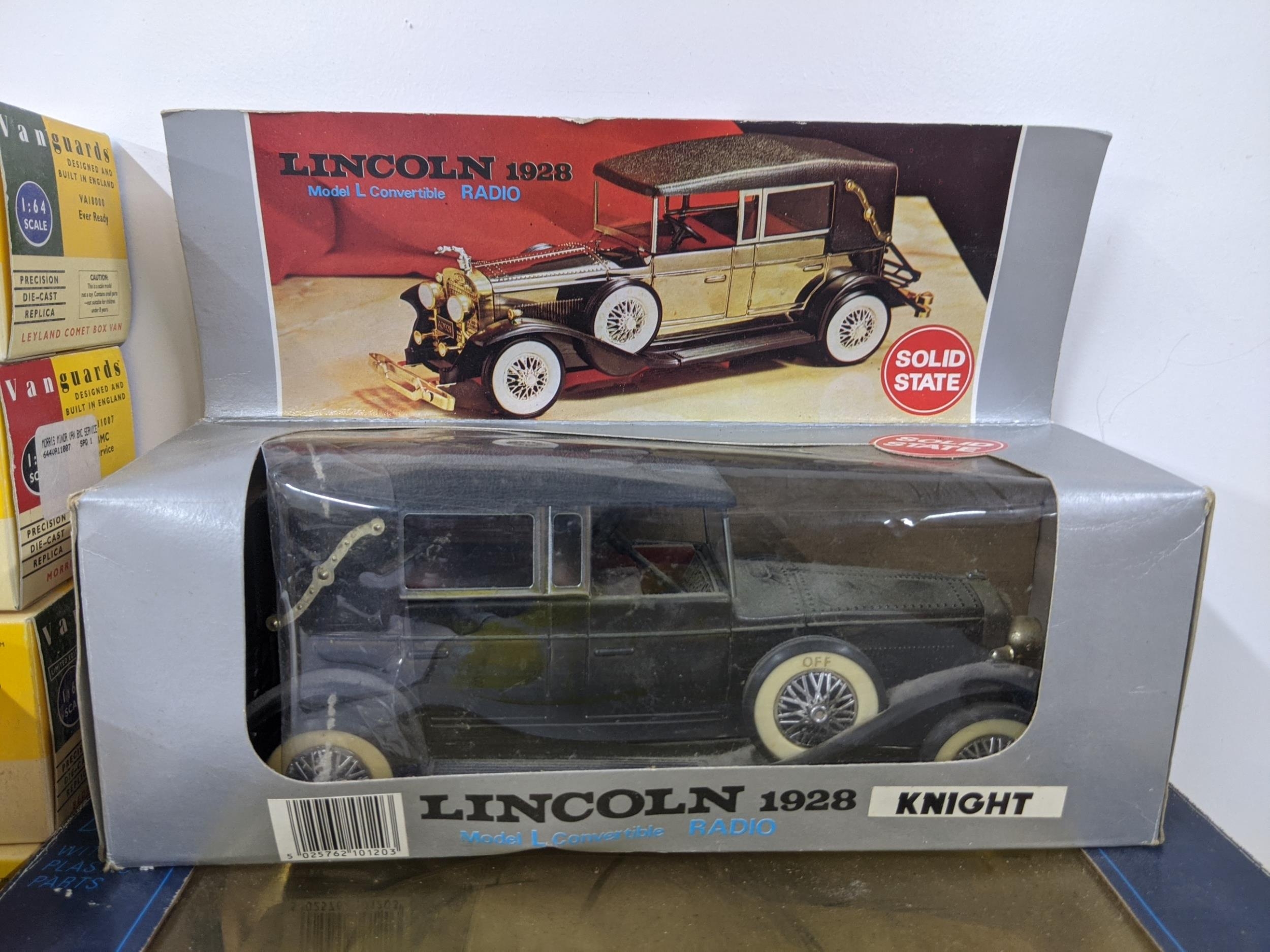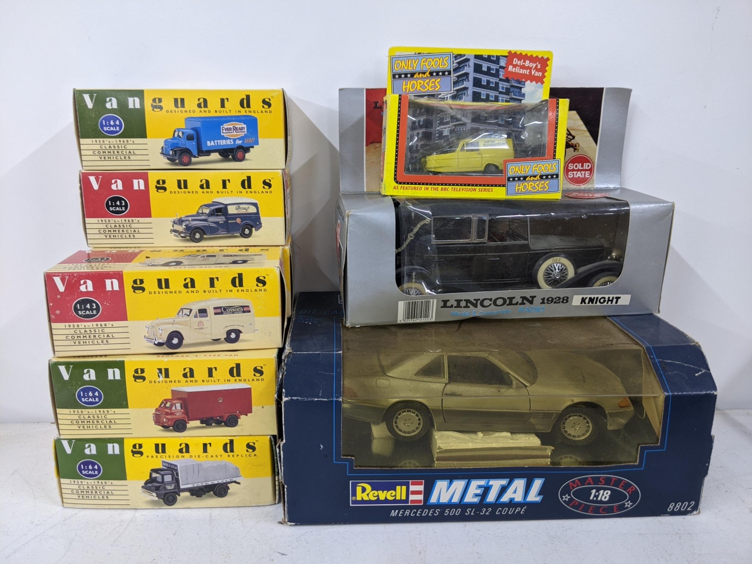 Eight Vanguard boxed models along with a Revell metal model of a Mercedes 500 SL – 32 Coupe 1/18 scale, number 8802, a radio fashioned as a 1928 Lincoln Knight and Del Boy’s Reliant Regal Supervan III as featured in Only Fools & Horses, all boxed