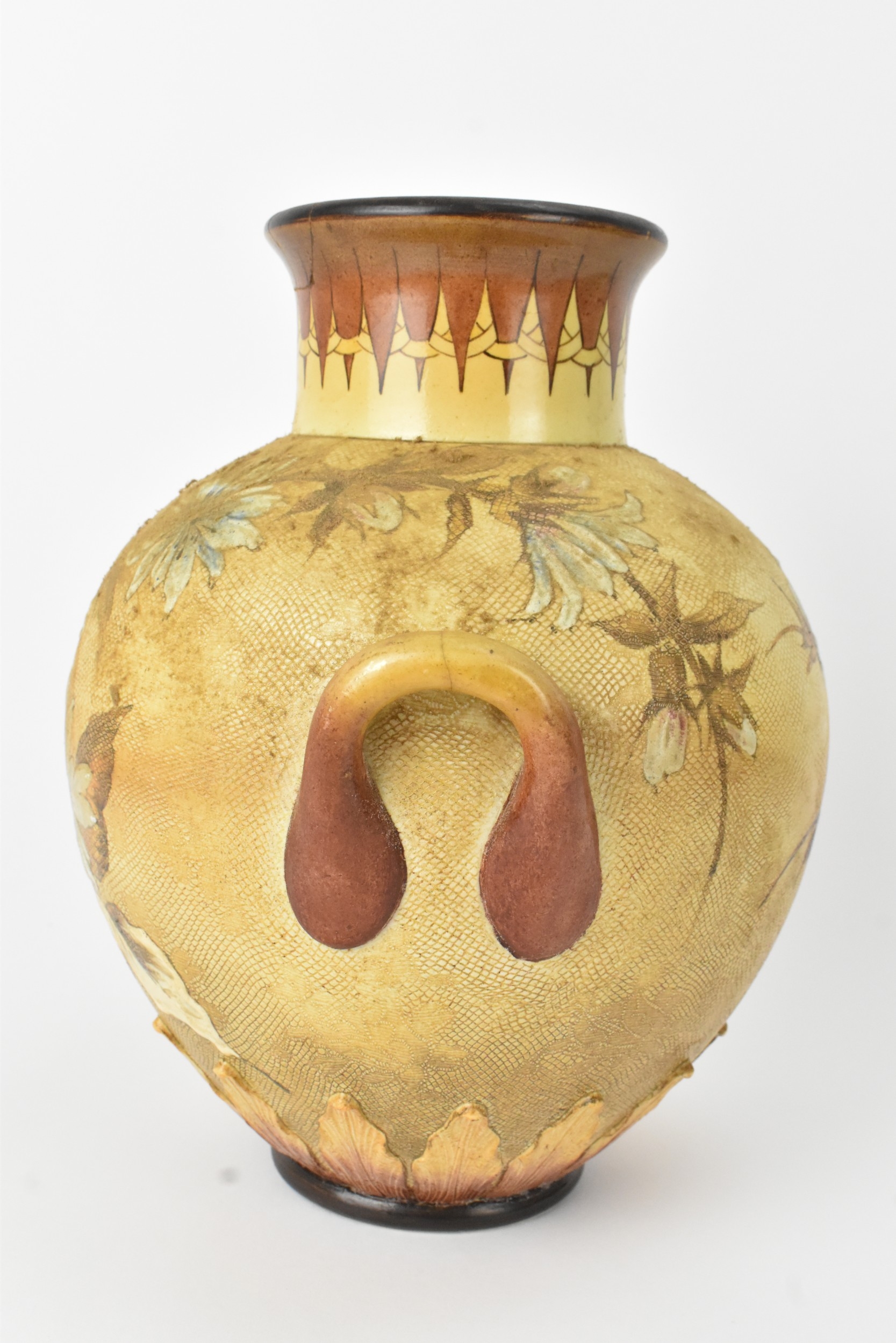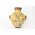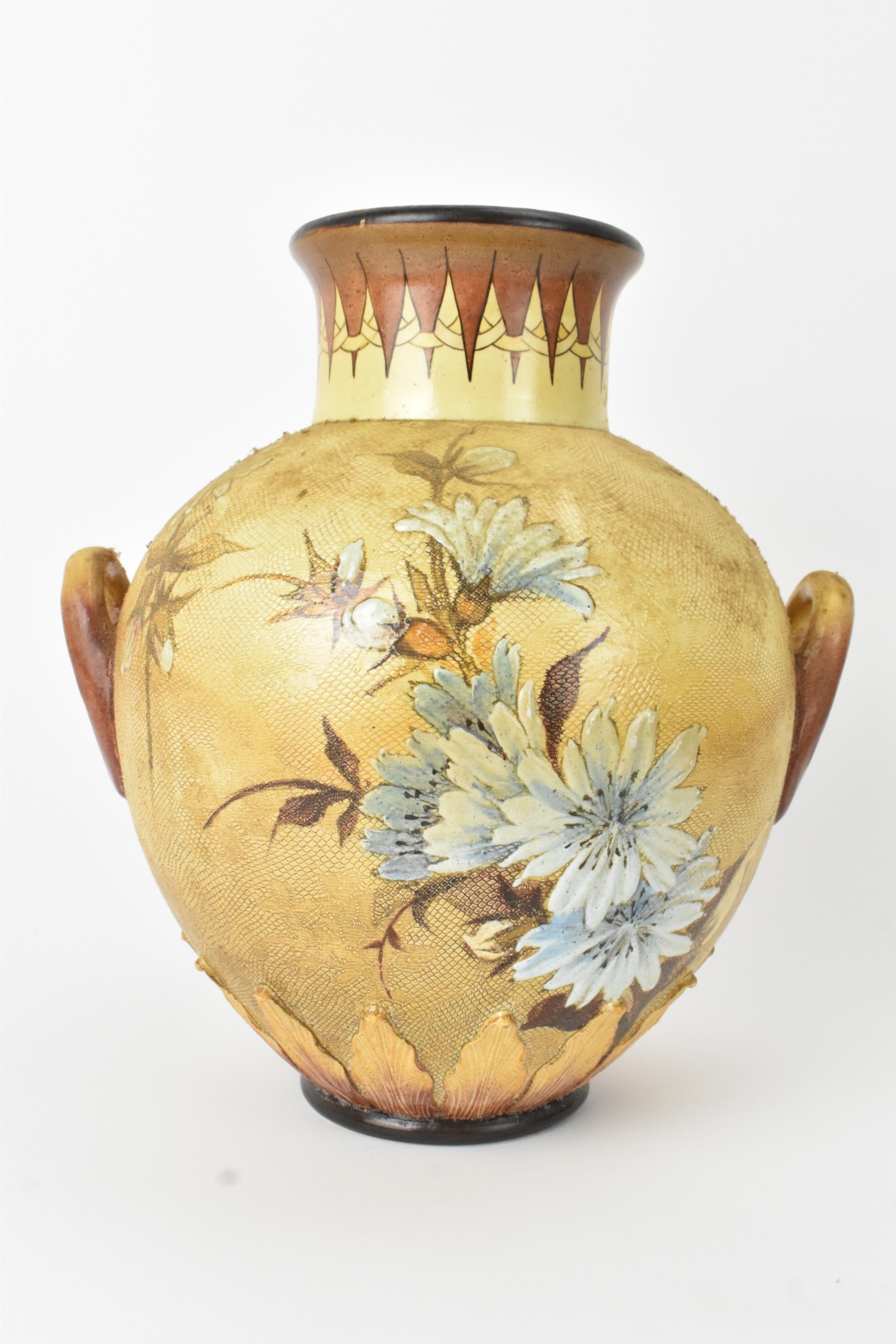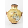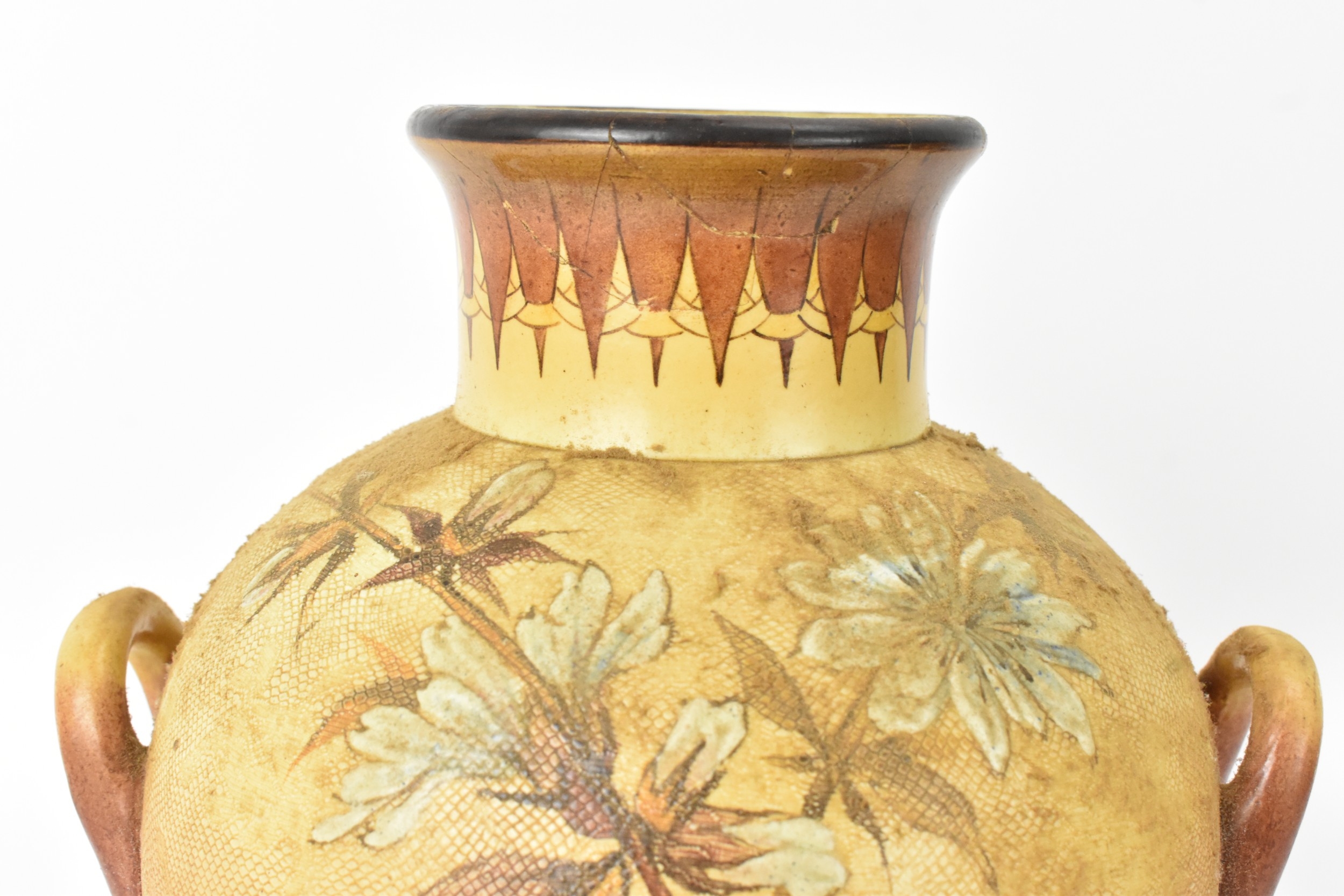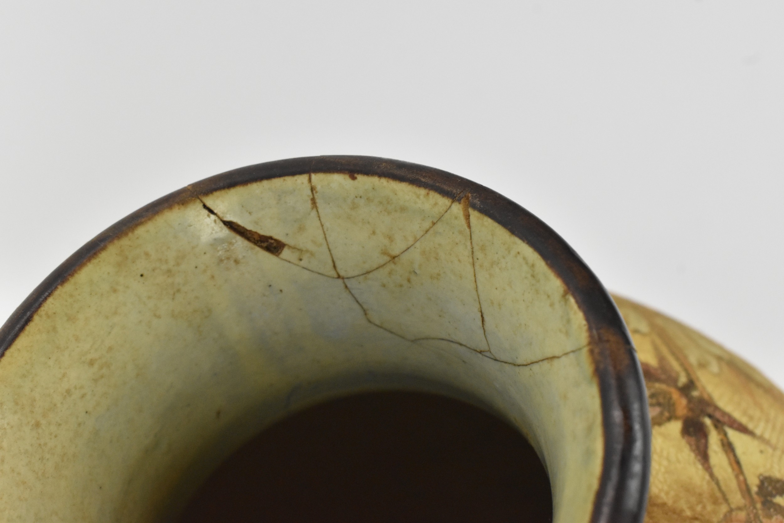 A late 19th century Doulton Lambeth Faience stoneware baluster vase by Florence E Lewis, in the Aesthetic taste with a decoration of a bird amongst flowers on a yellow ground, impressed and painted factory marks to the base, 26cm high x 24cm wide, A/F