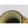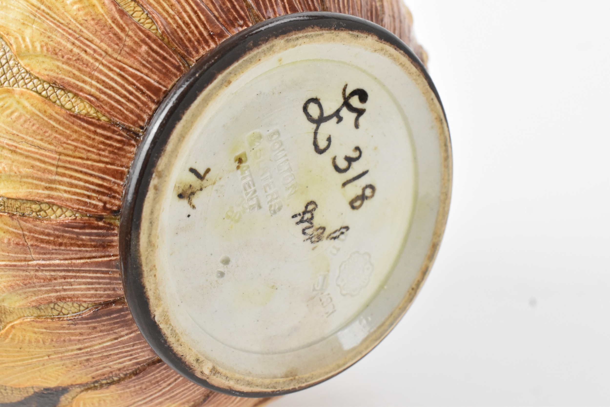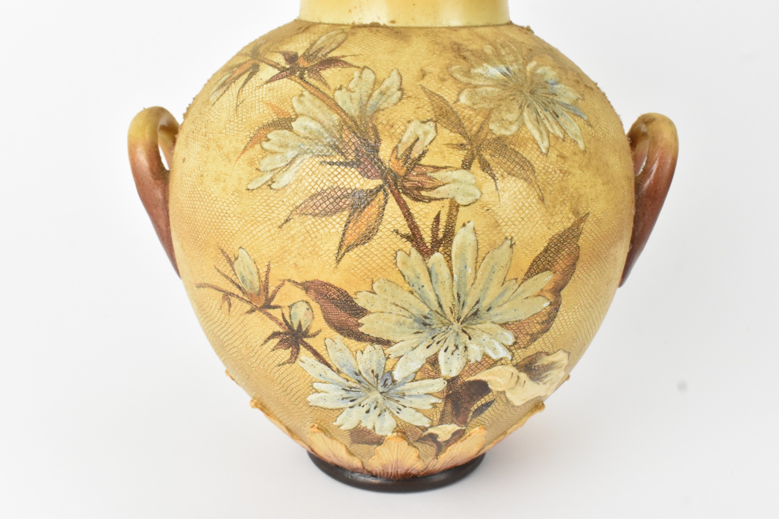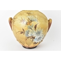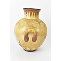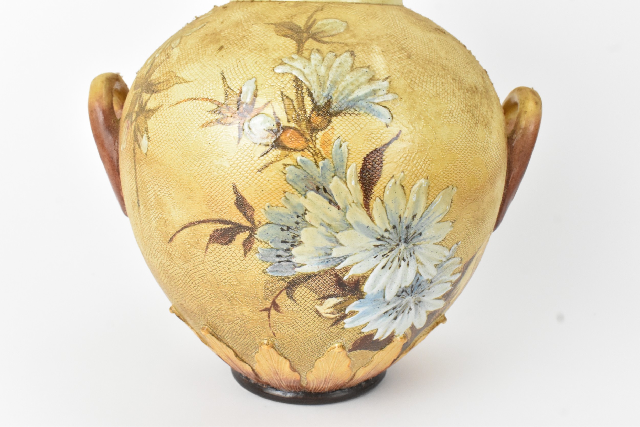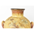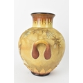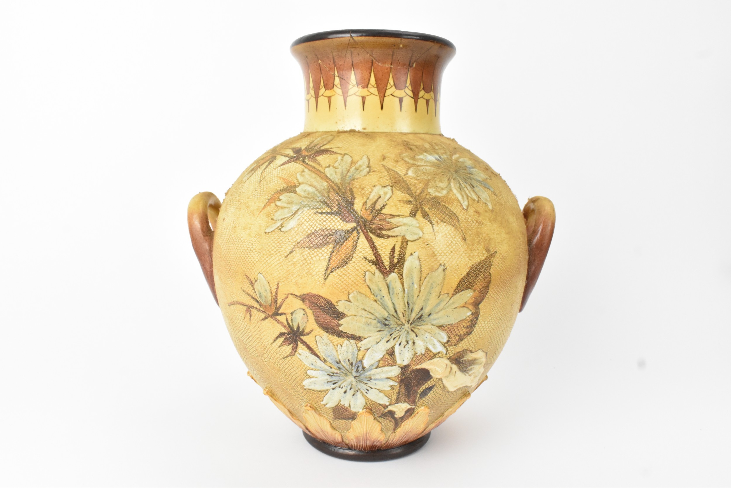 A late 19th century Doulton Lambeth Faience stoneware baluster vase by Florence E Lewis, in the Aesthetic taste with a decoration of a bird amongst flowers on a yellow ground, impressed and painted factory marks to the base, 26cm high x 24cm wide, A/F