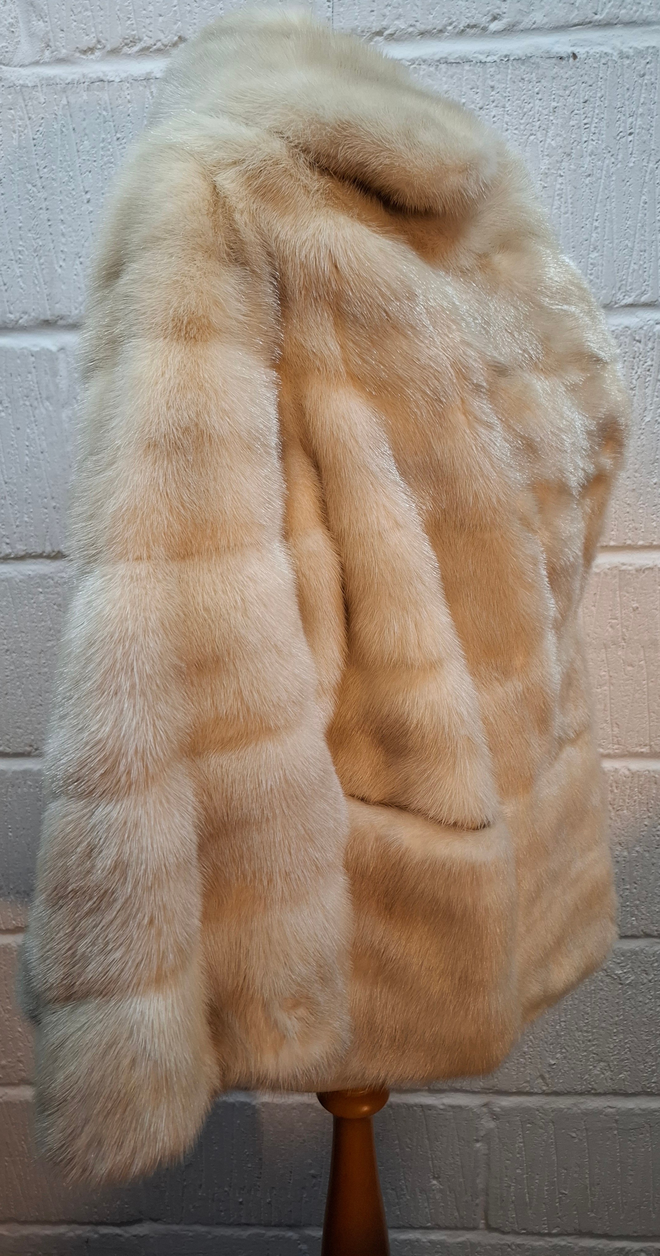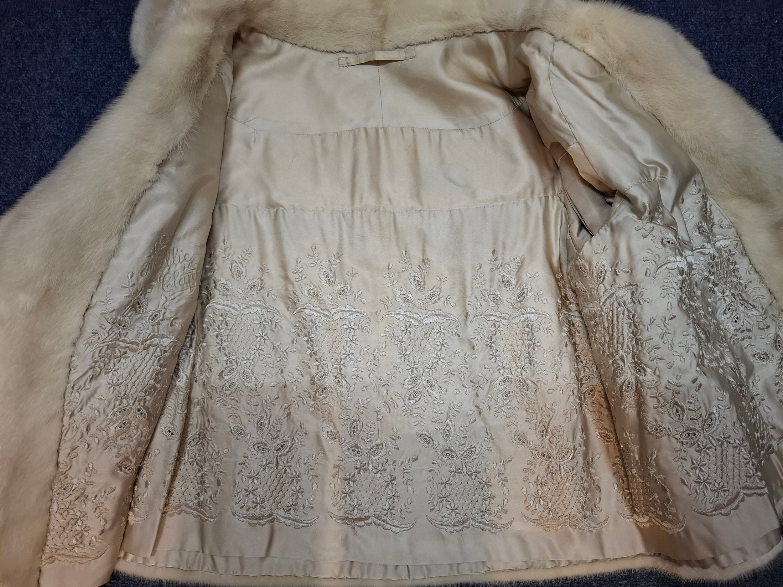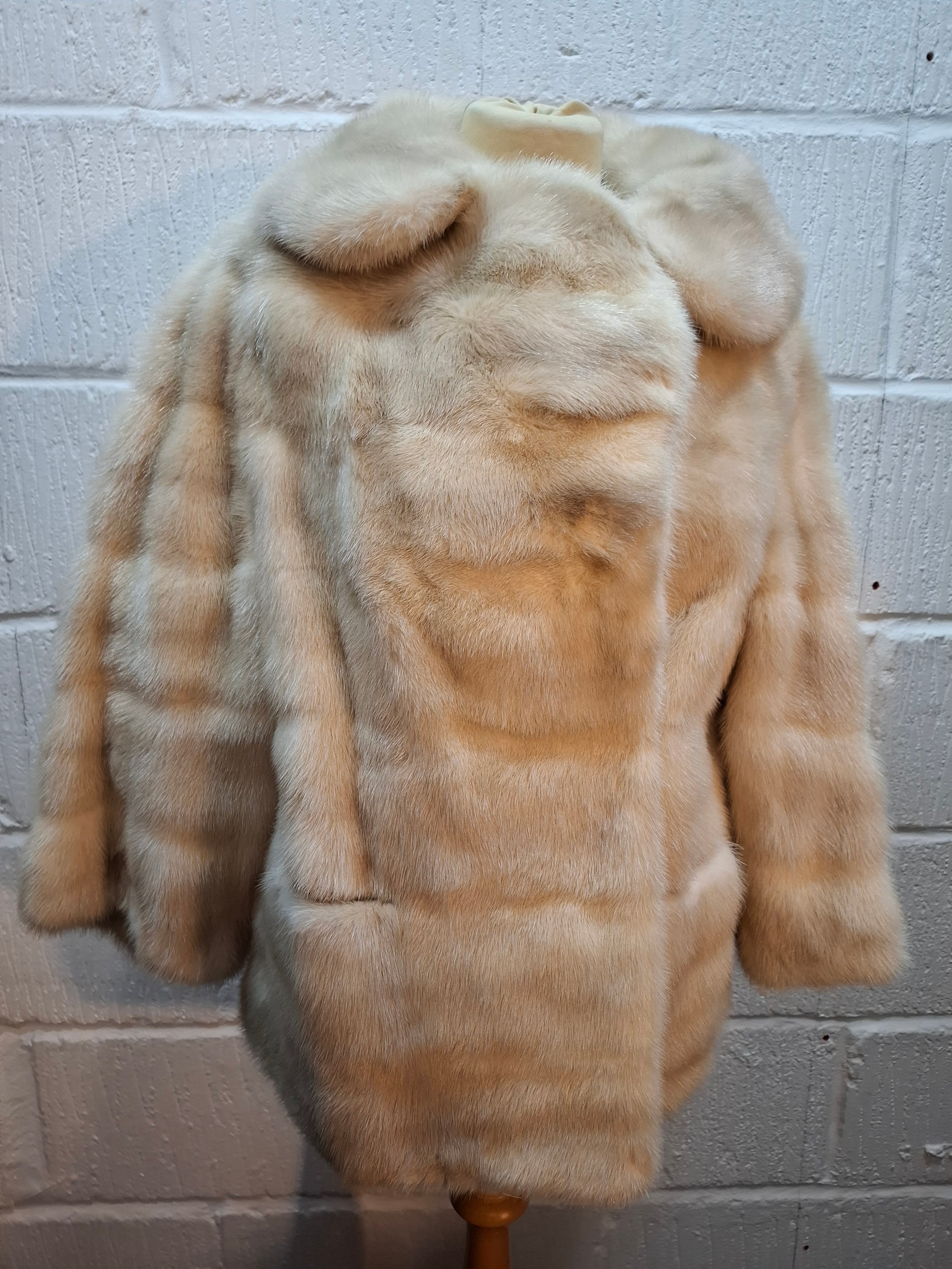 A vintage arctic mink swing jacket with ¾ length flared sleeves, approx 36" chest x 24" long and cream embroidered lining together with an arctic fur collar and cuffs. Location:Rail