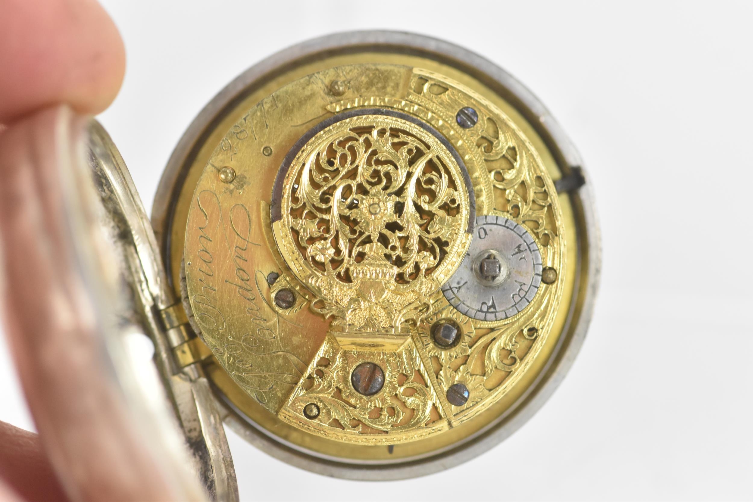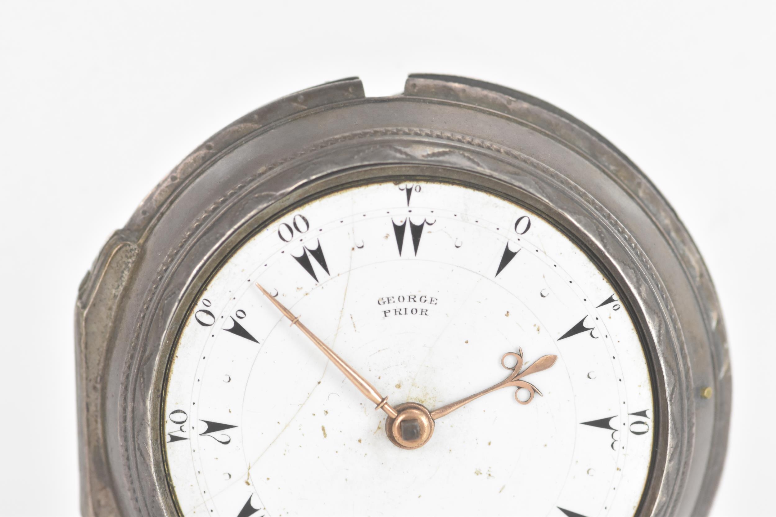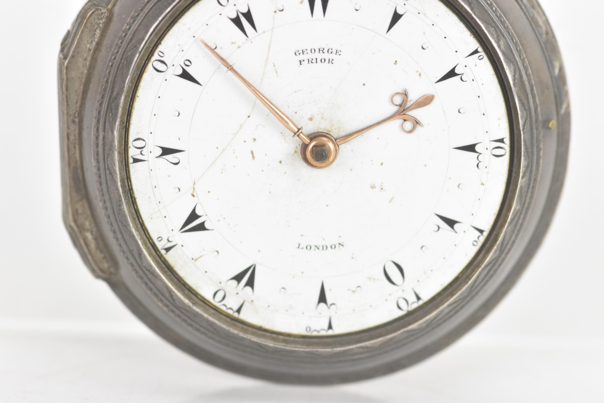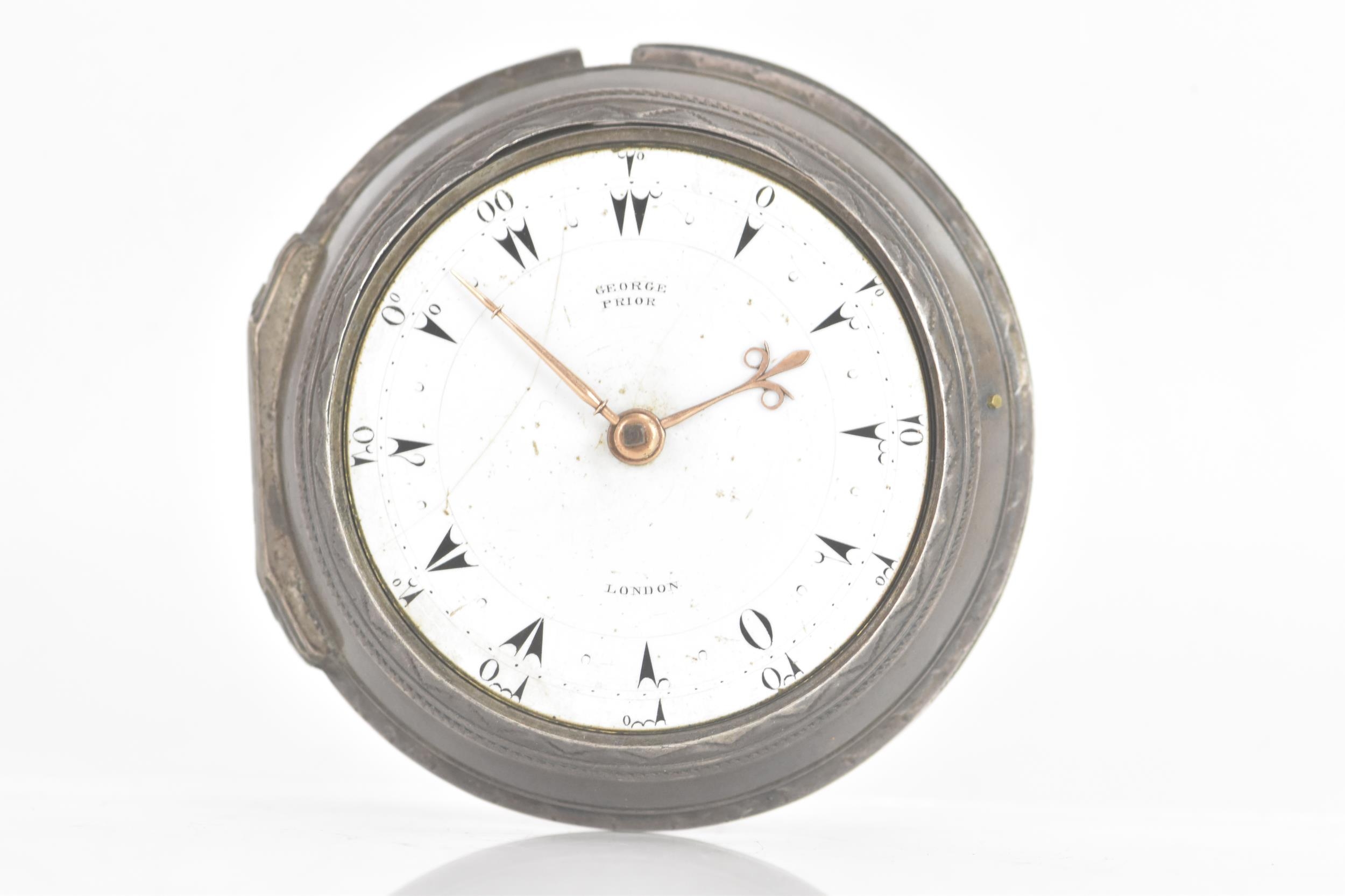 A George III silver pair cased pocket watch by George Prior, the white enamel dial having black markers and gilt hands, the case and outer case by James Richards and hallmarked London 1798, the signed movement numbered 28773 with verge escapement, pierced engraved balance cock, steel three arm balance, silvered regulating disc and four pillars, 59.5mm