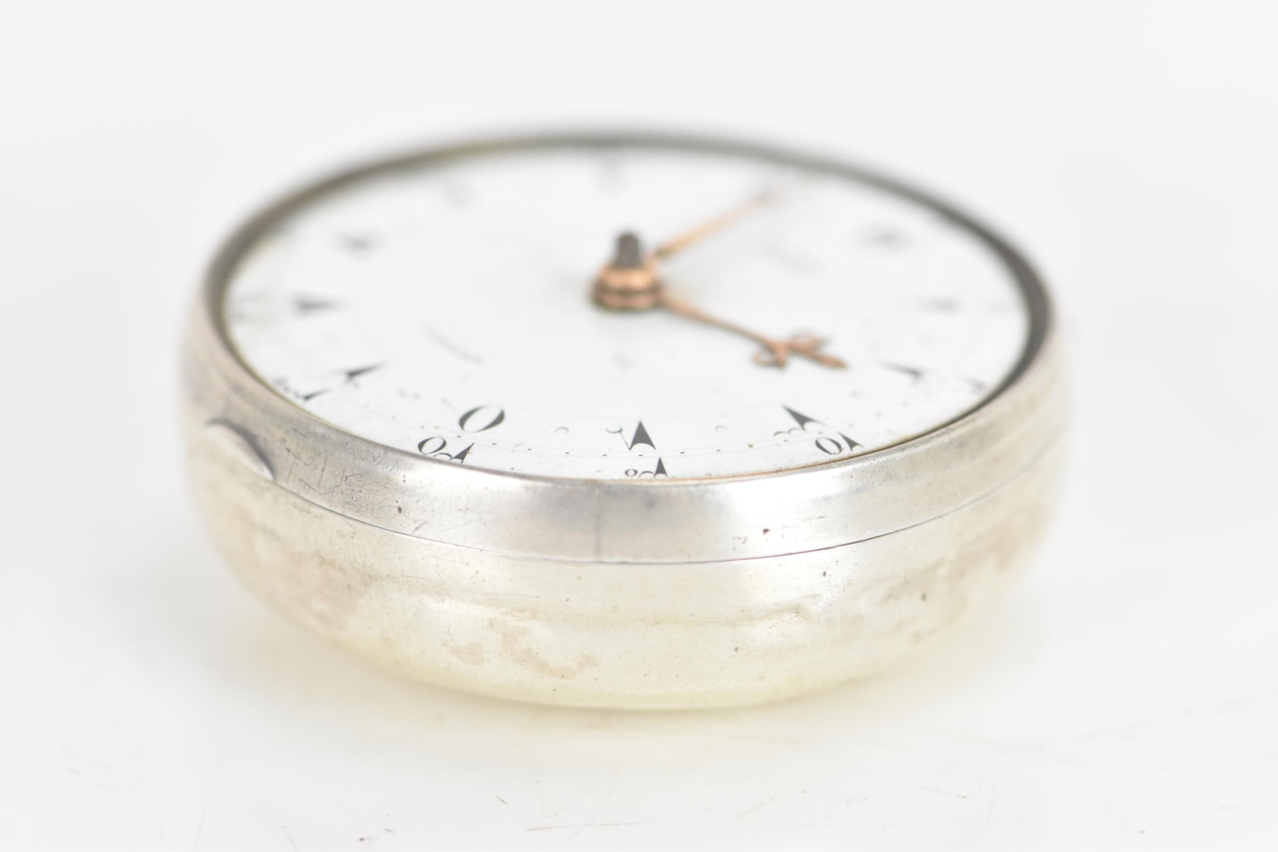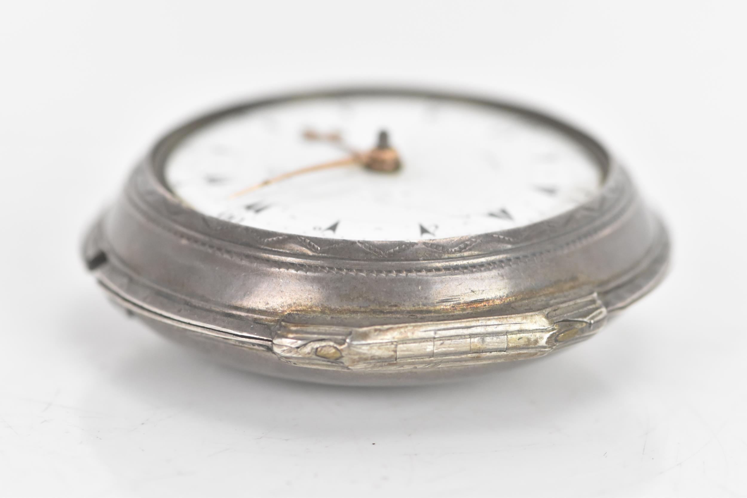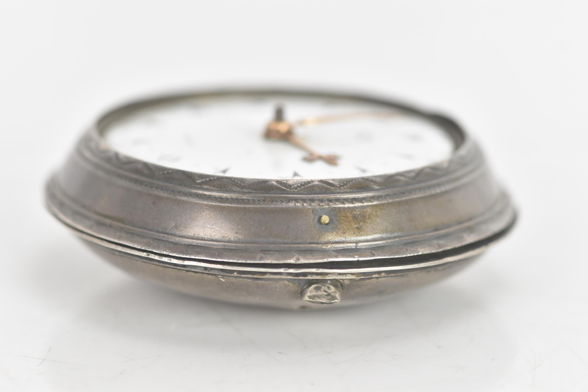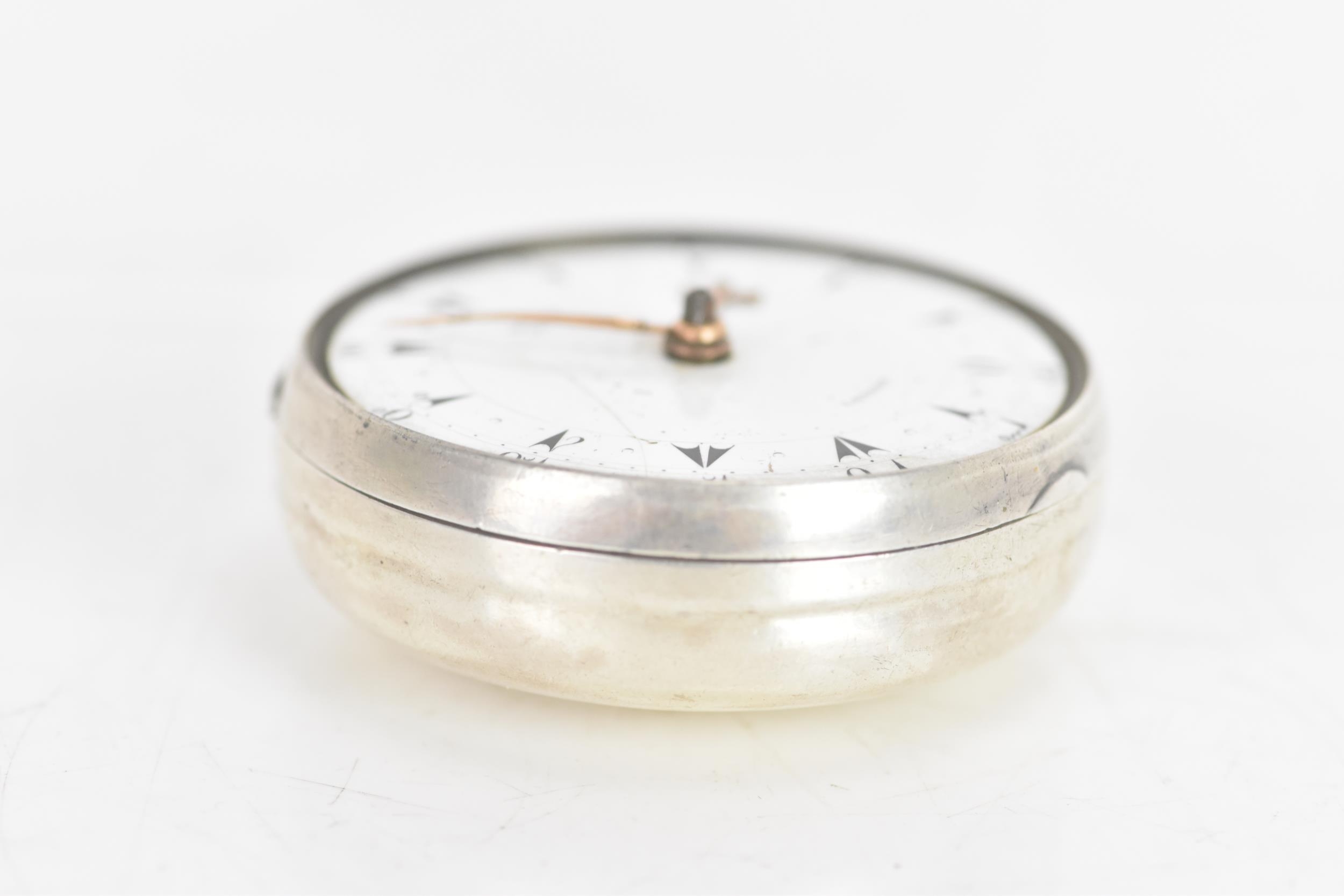 A George III silver pair cased pocket watch by George Prior, the white enamel dial having black markers and gilt hands, the case and outer case by James Richards and hallmarked London 1798, the signed movement numbered 28773 with verge escapement, pierced engraved balance cock, steel three arm balance, silvered regulating disc and four pillars, 59.5mm