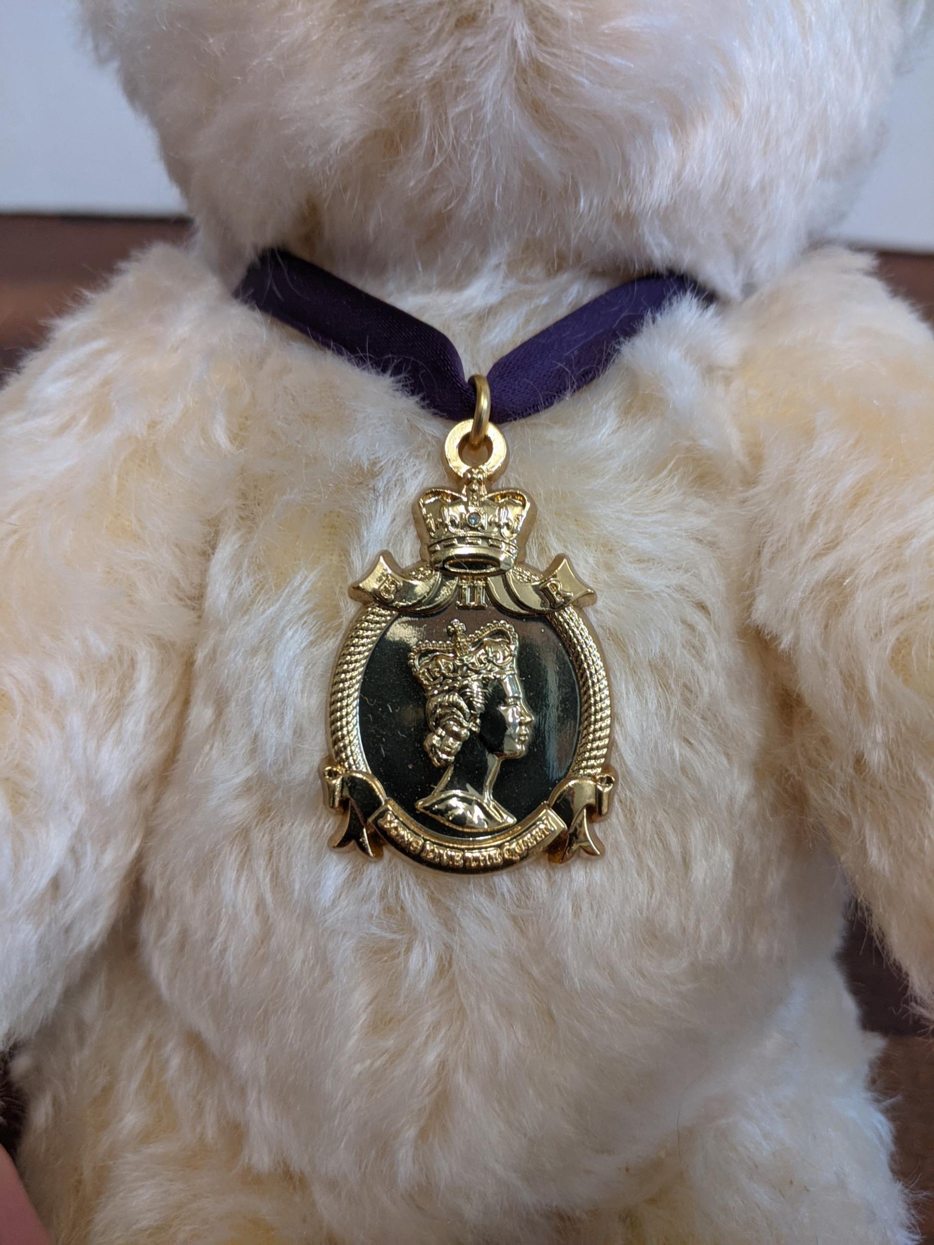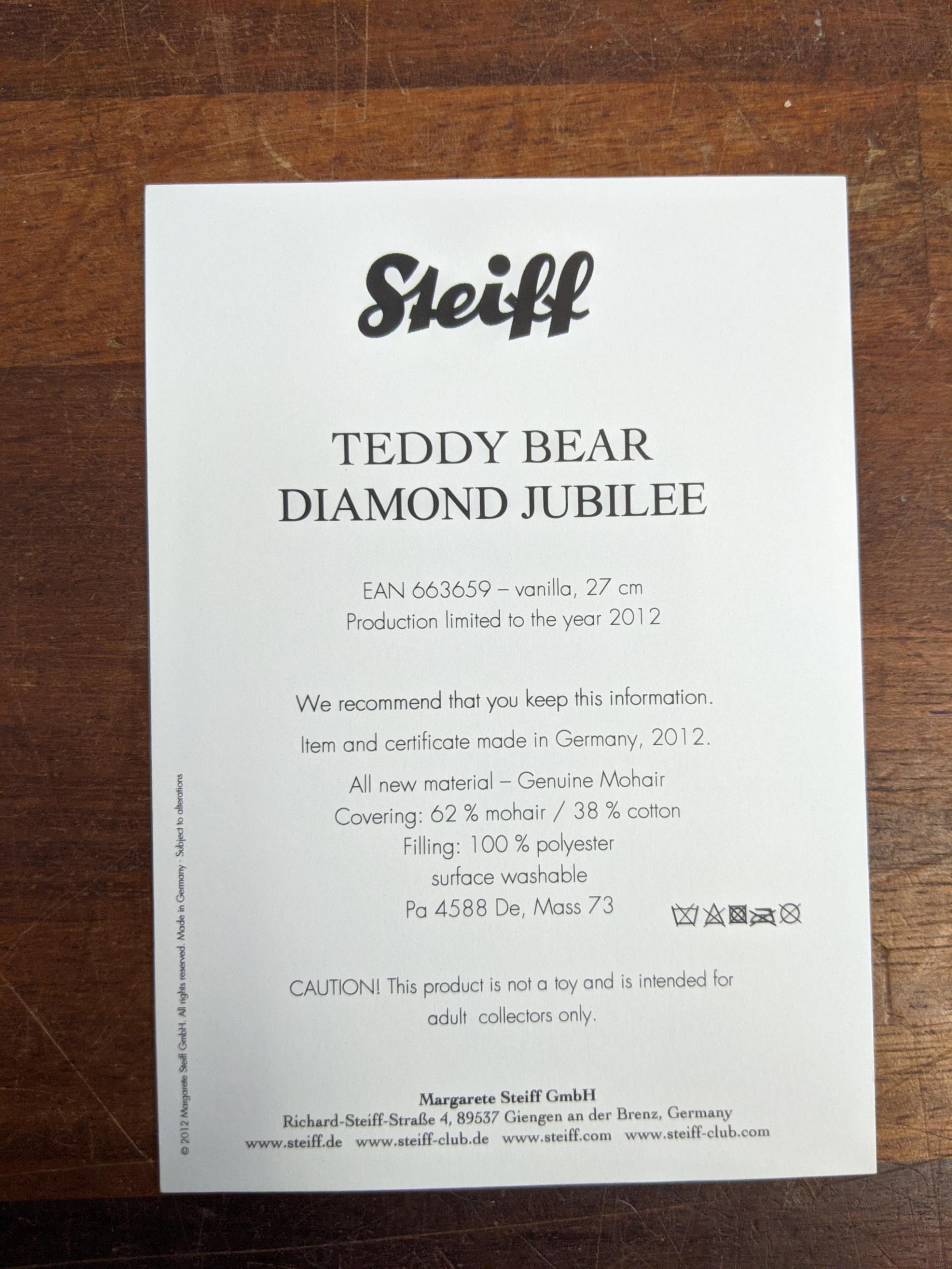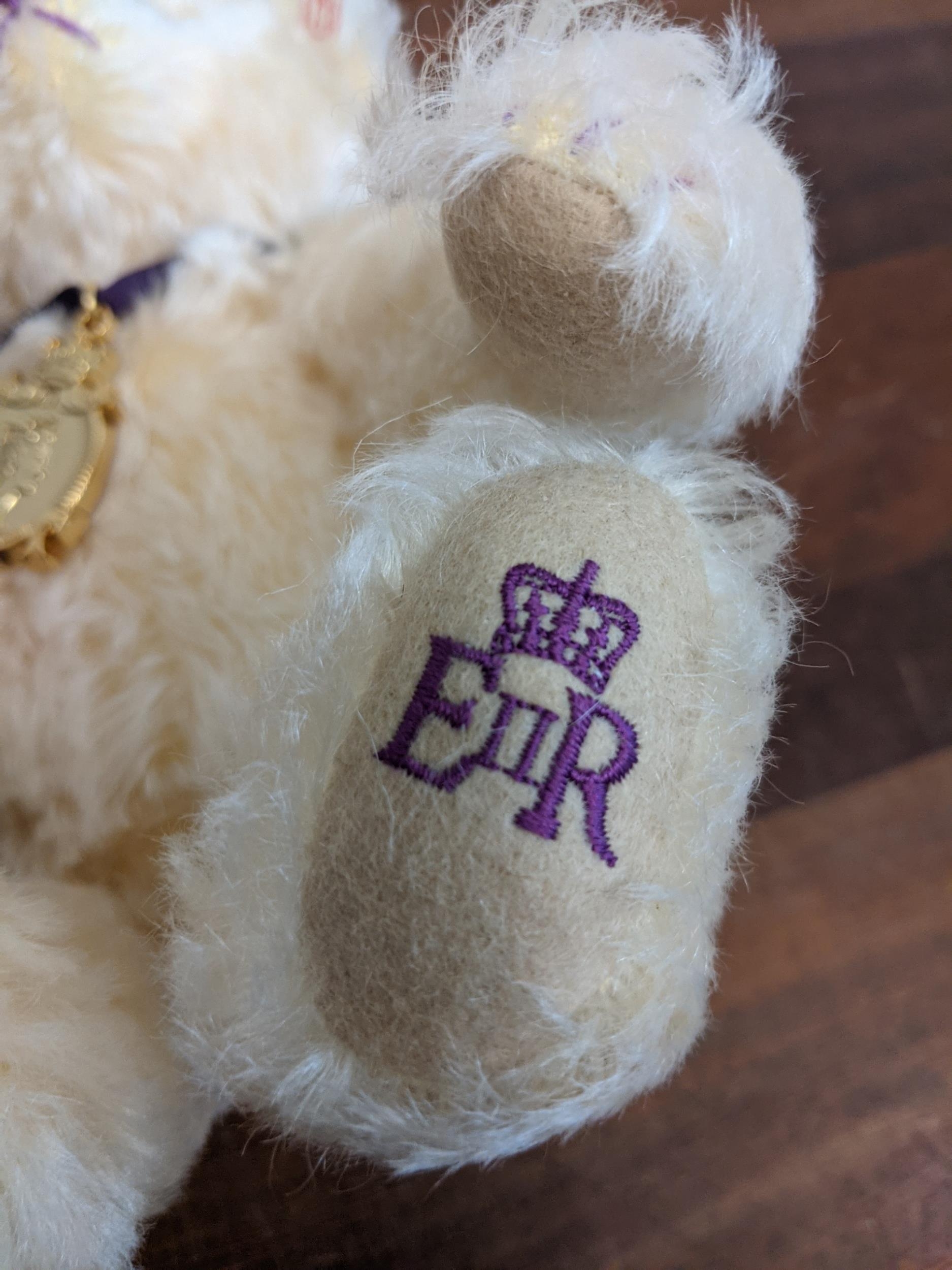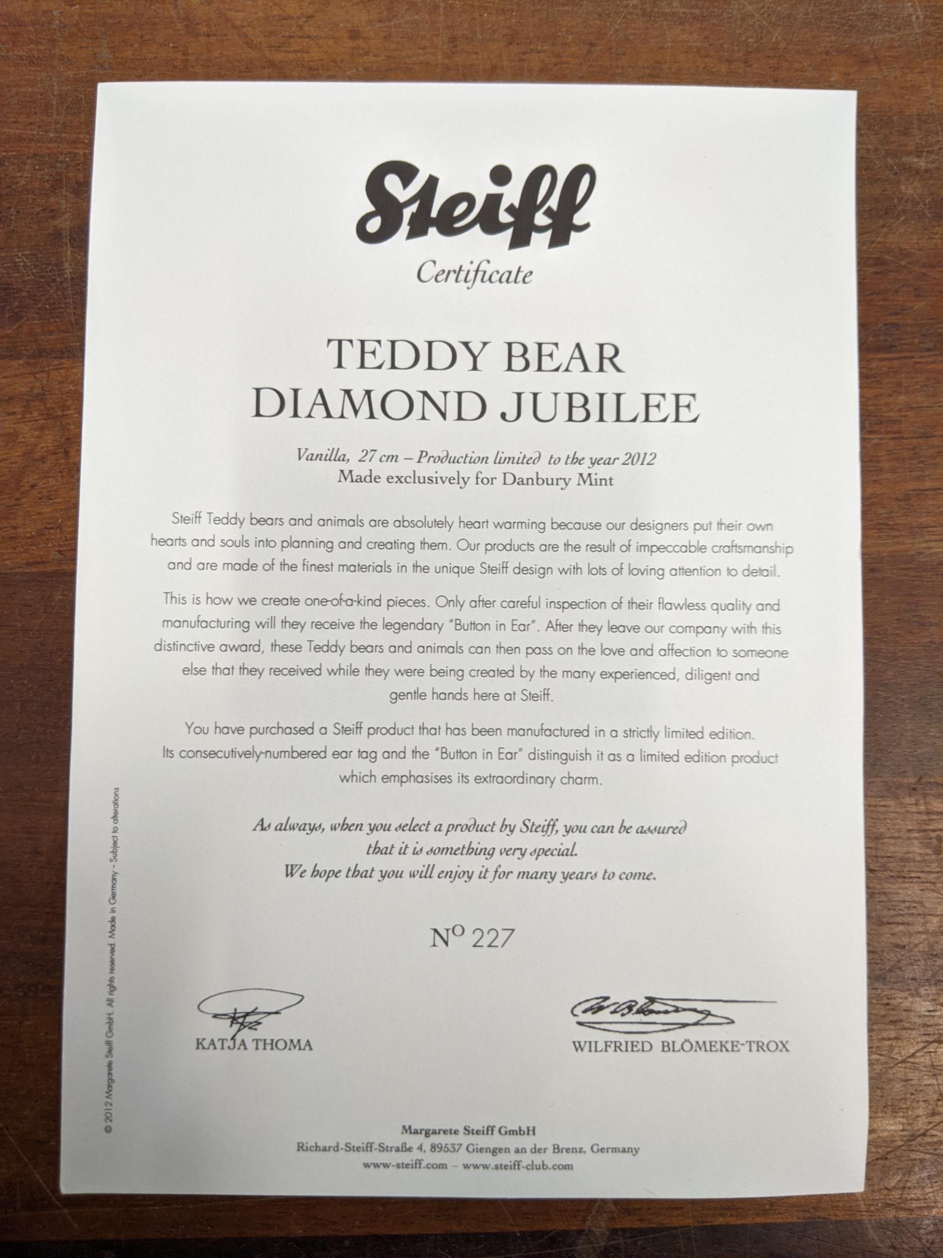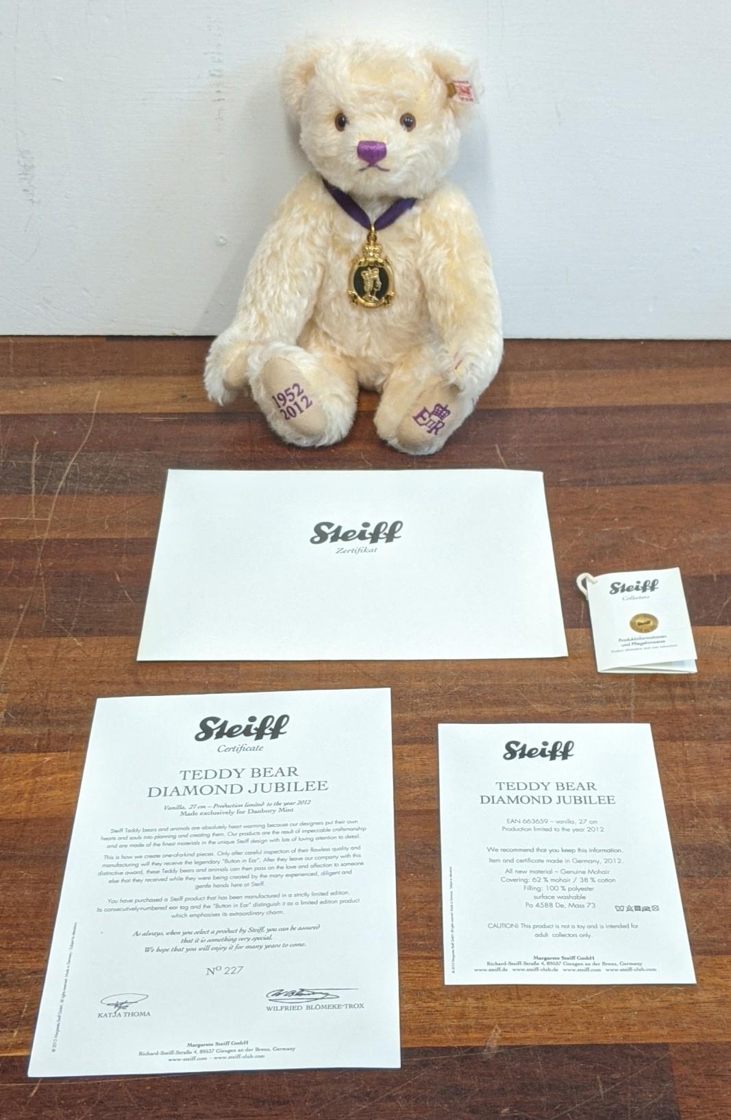 A Steiff Danbury Mint Diamond Jubilee Teddy Bear, with commemorative years on his left foot (1952 – 2012) and ER on the right foot also wearing a Queen Elizabeth pendant (production limited to the year 2012) number 227 with the certificate, booklet and other paperwork