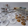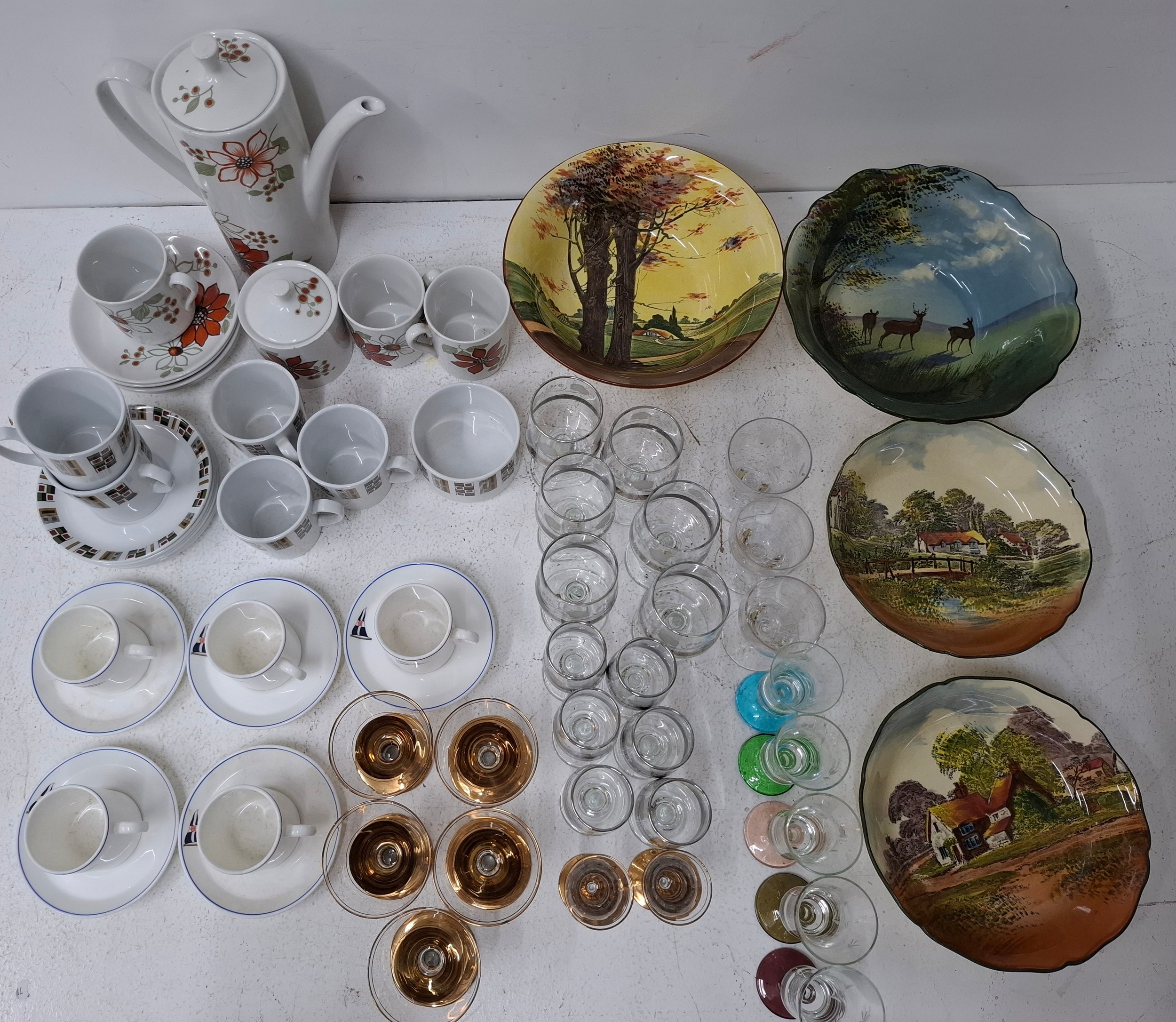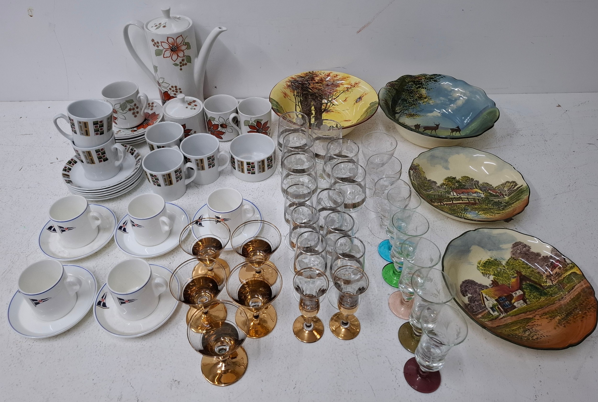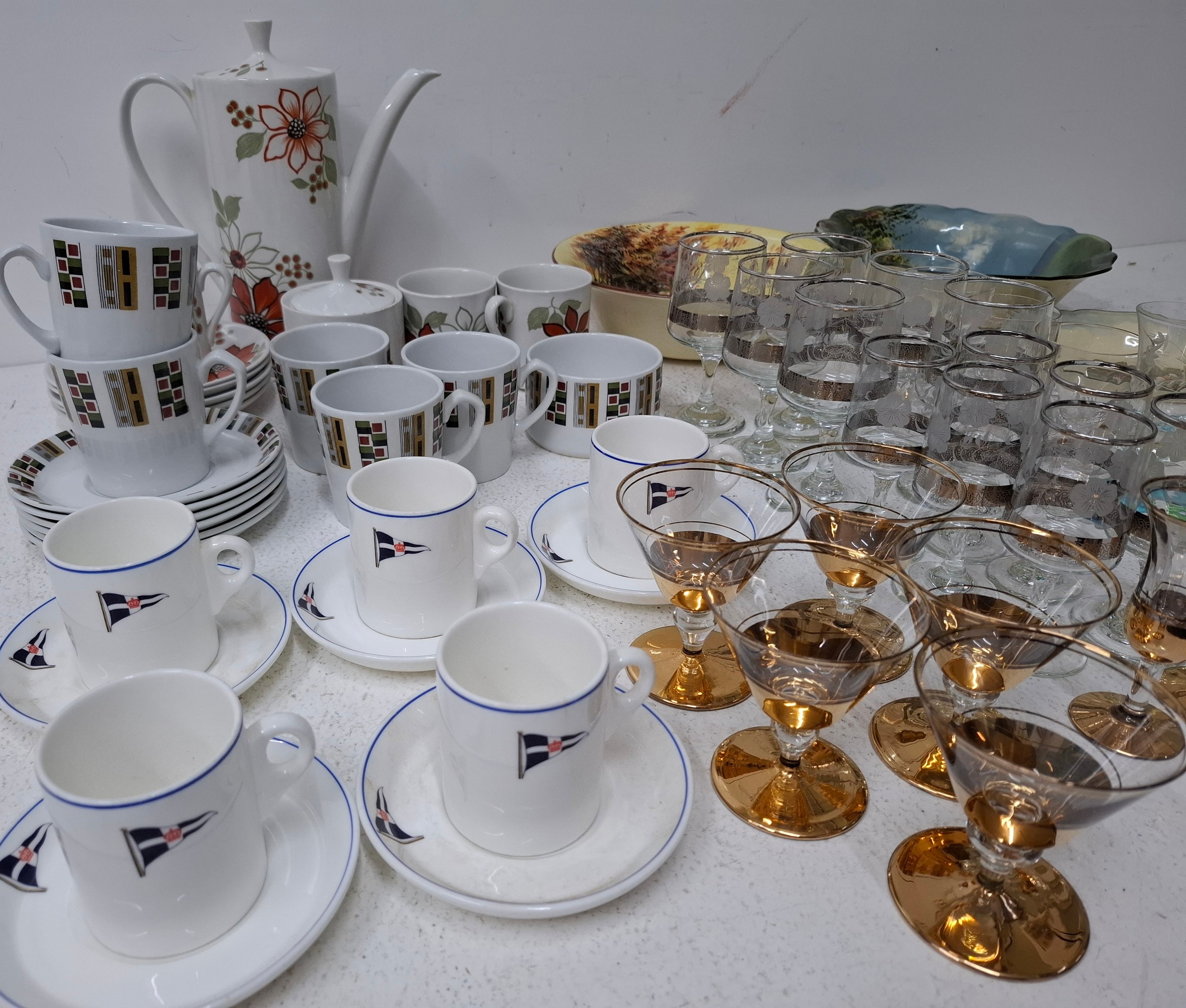 A quantity of 1950's and 60's ceramics and glassware to include a Myott part coffee set, an Alfred Meakin part coffee set, 5 Wedgwood maritime coffee cans with matching saucers and Royal Doulton bowls to include a Series Ware bowl with images of deer. Location:G5