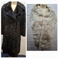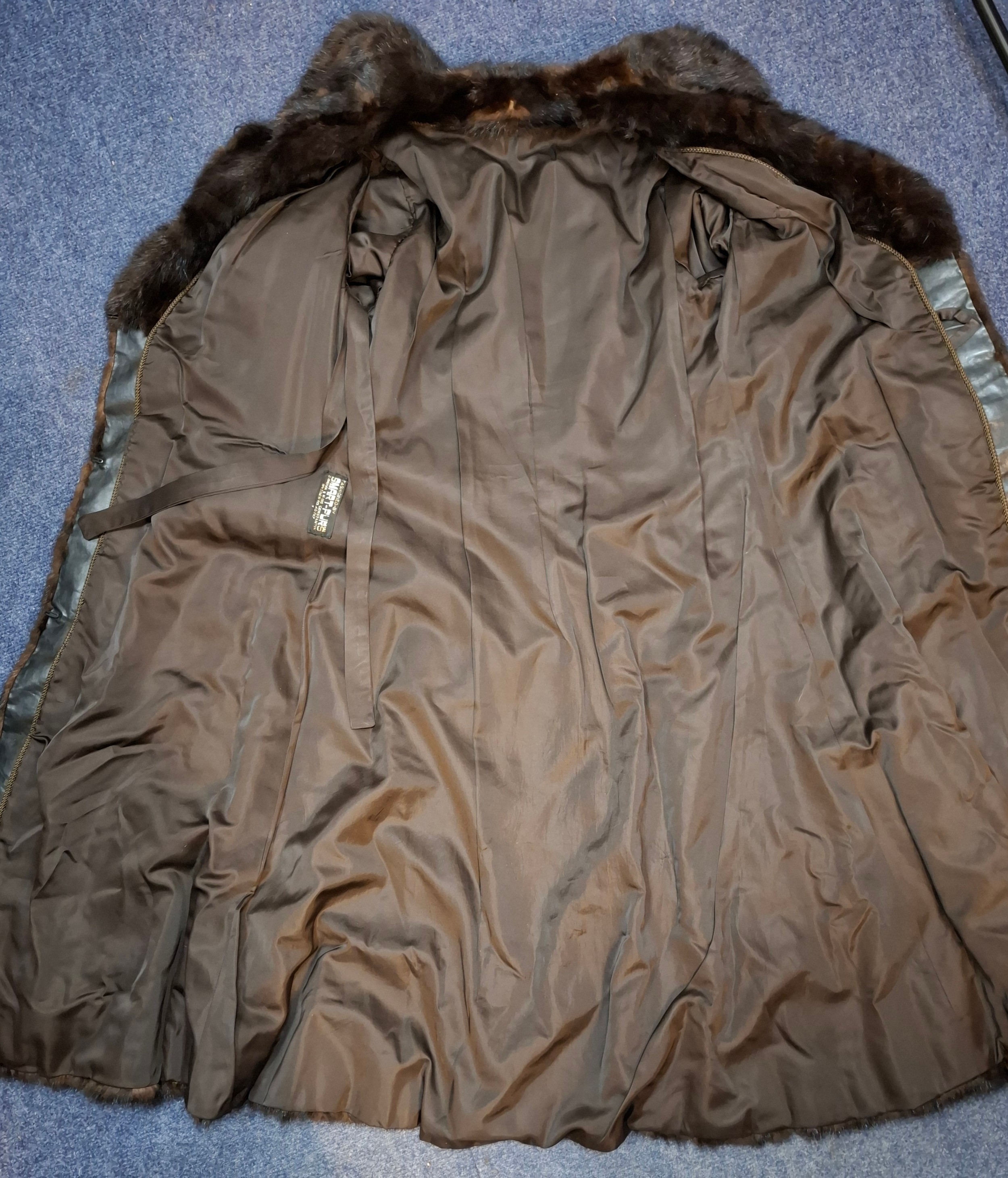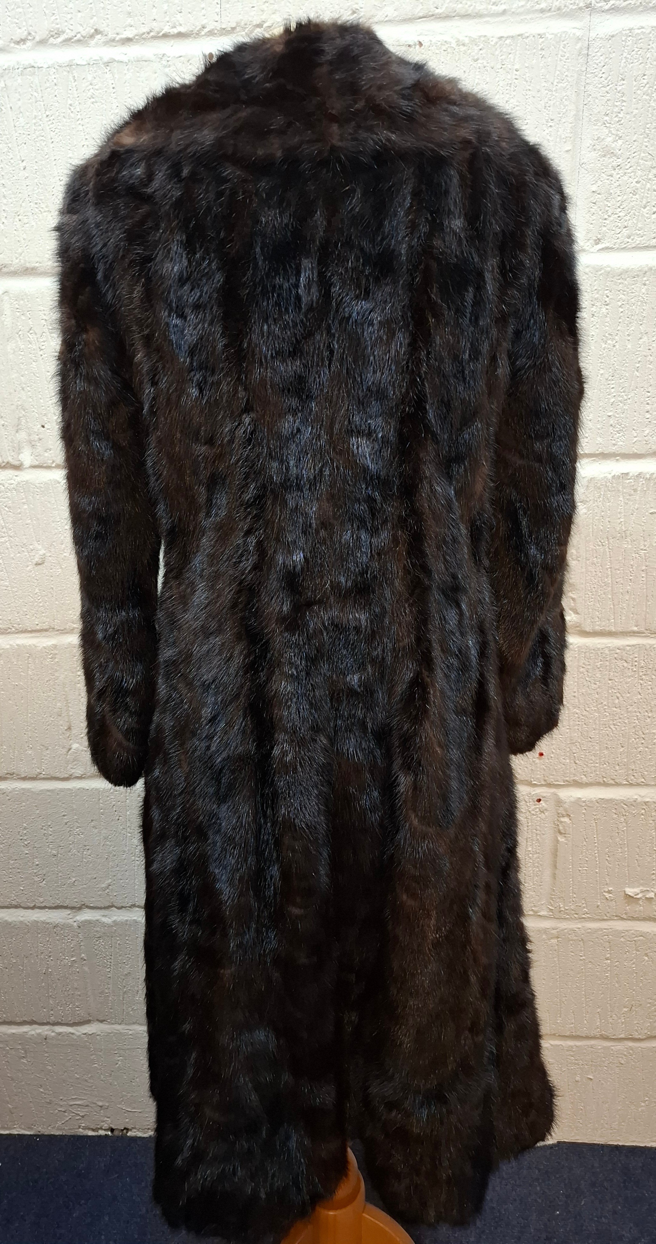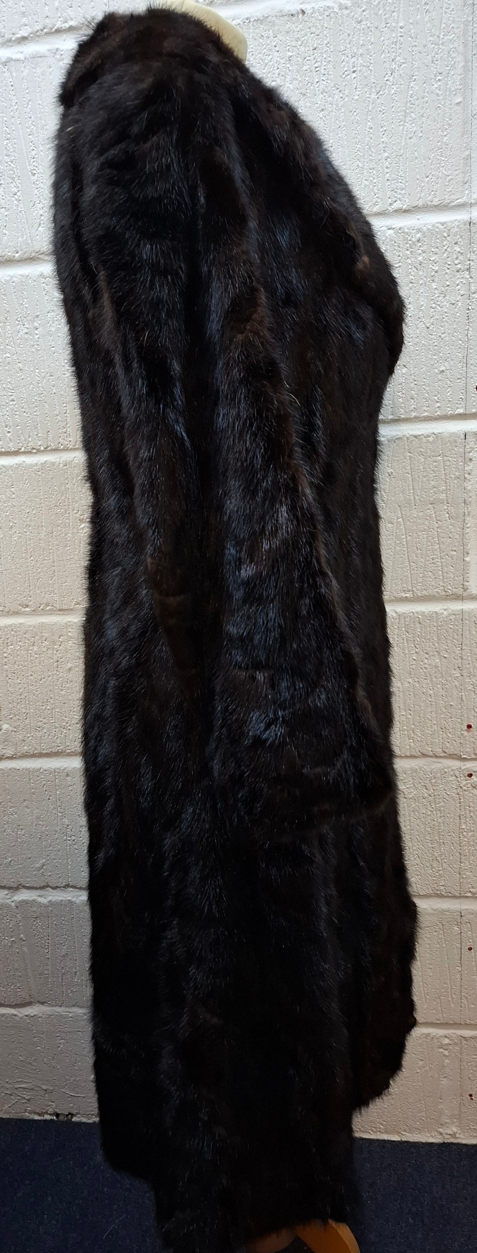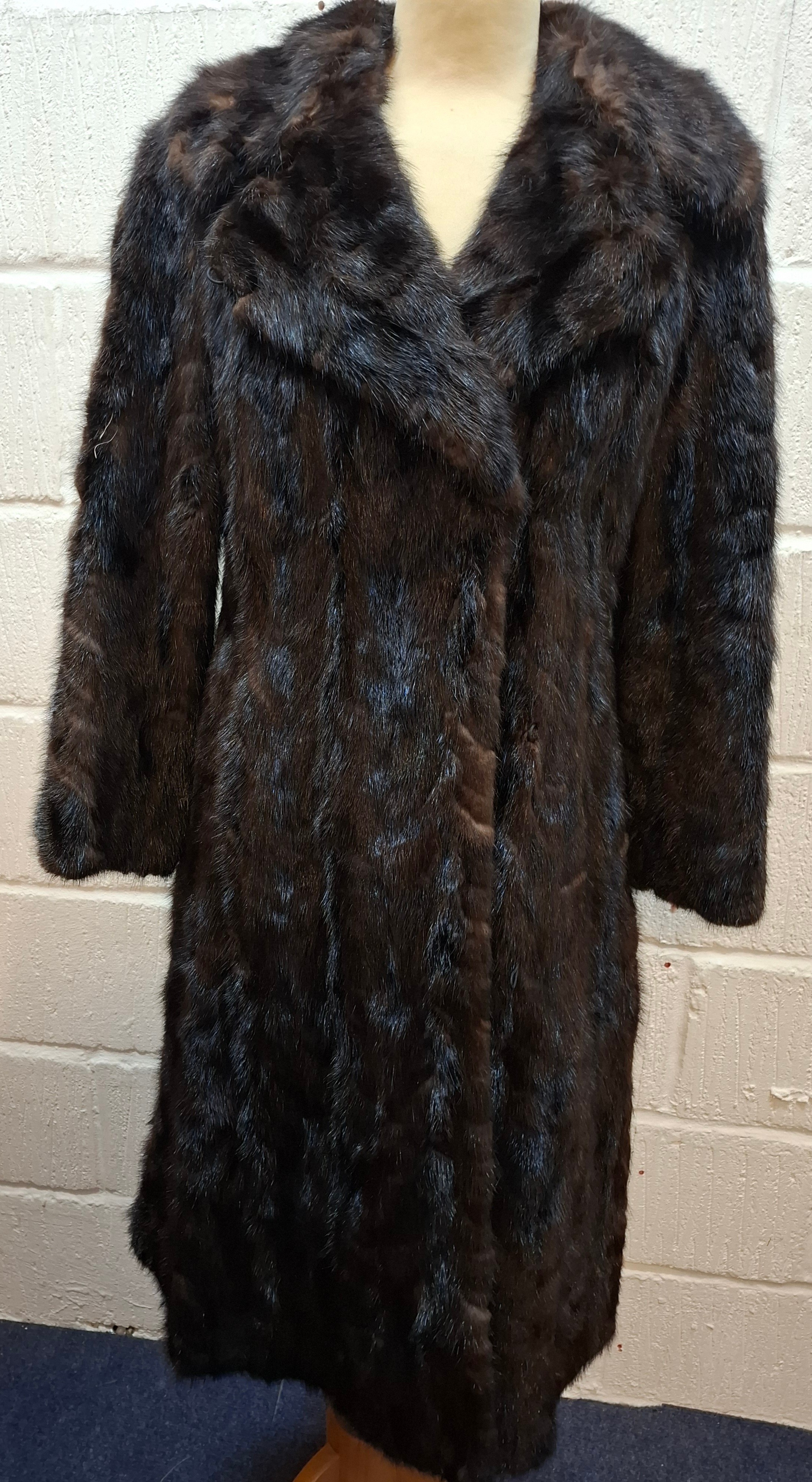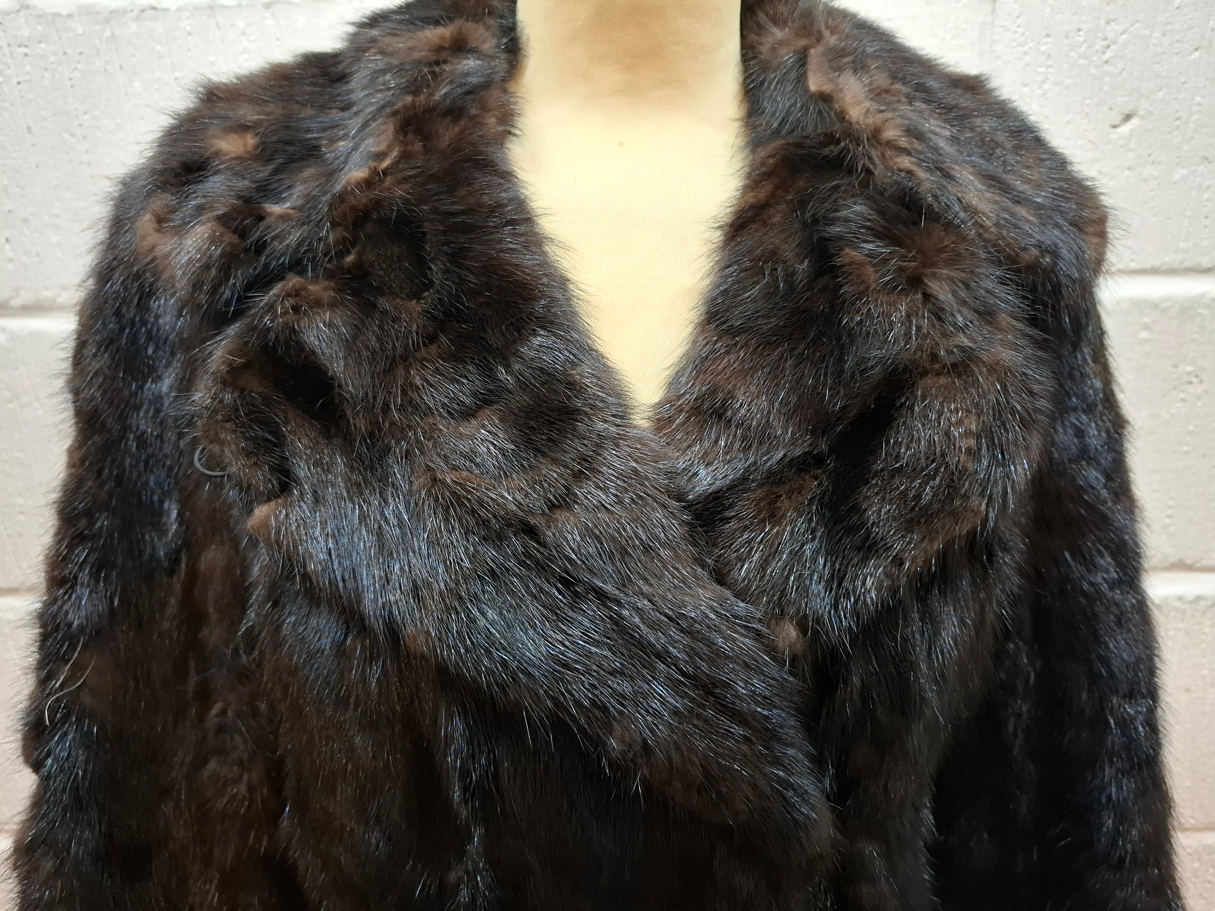 A 1970's dark brown ranch mink coat with matching belt having a shawl collar and tapered waist, approx 36" chest x 44" long together with a vintage cream stole. Location:RWM (original receipts on hangar)