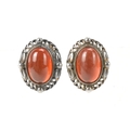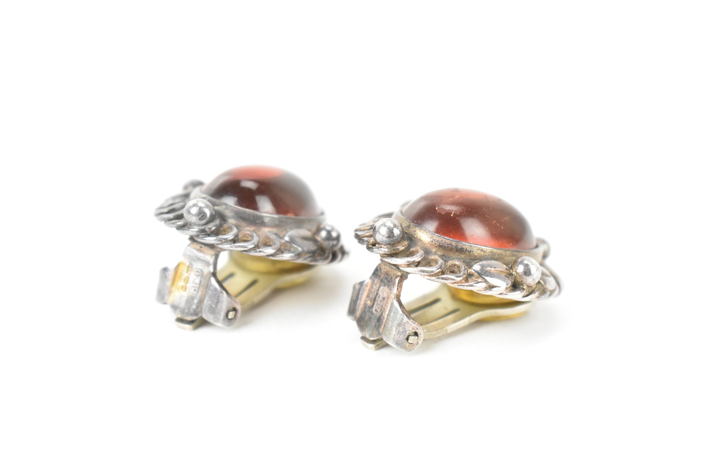A pair of Georg Jensen Heritage Collection silver and amber earrings, each oval amber cabochon collet set within a stylised bead and foliate border, on hinged clip fittings, signed and stamped '925S' '1995', 2cm x 2.5cm