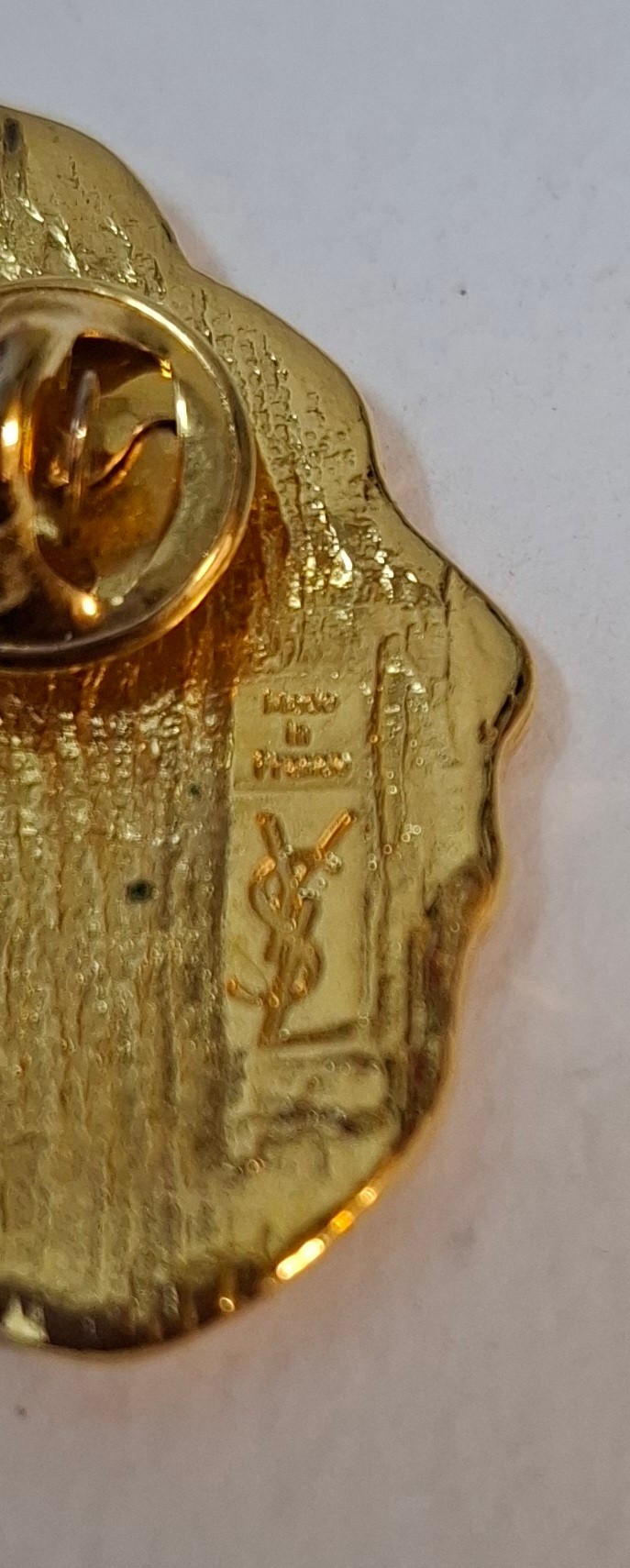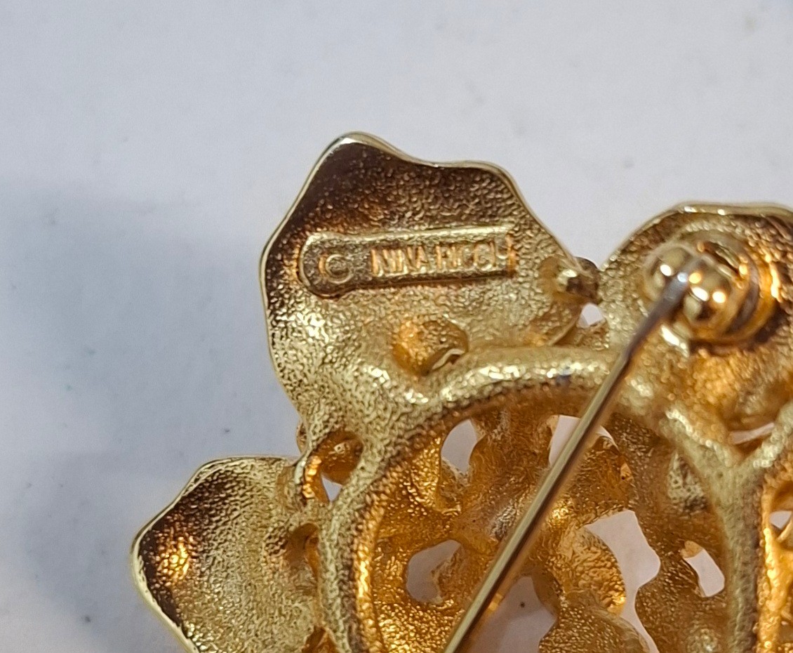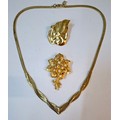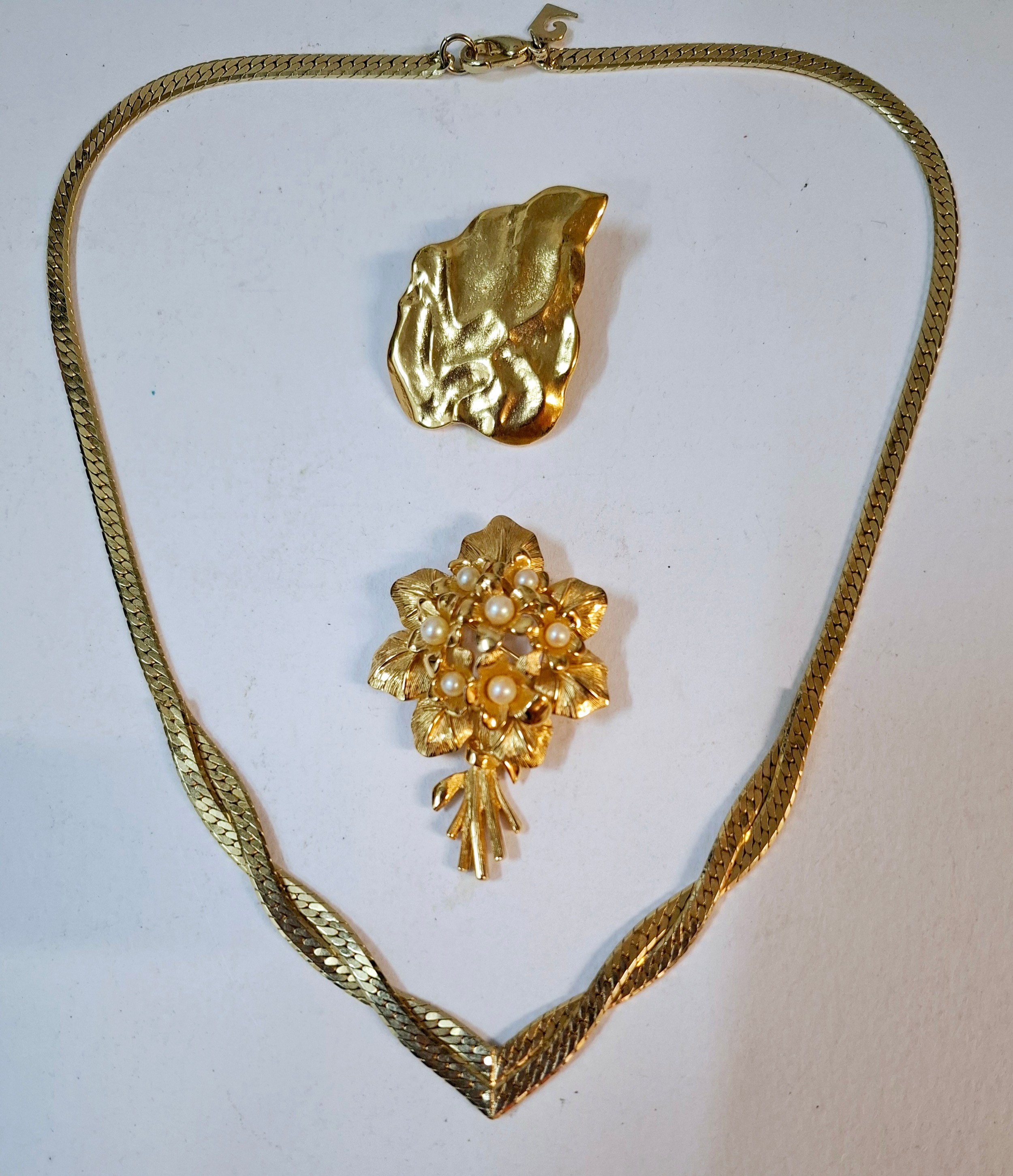 YSL- A small lot comprising an Yves Saint Laurent gold tone leaf brooch, a gold tone Nina Ricci floral brooch with seed pearls and a gold tone Pierre Cardin necklace. Location:Cab 3
