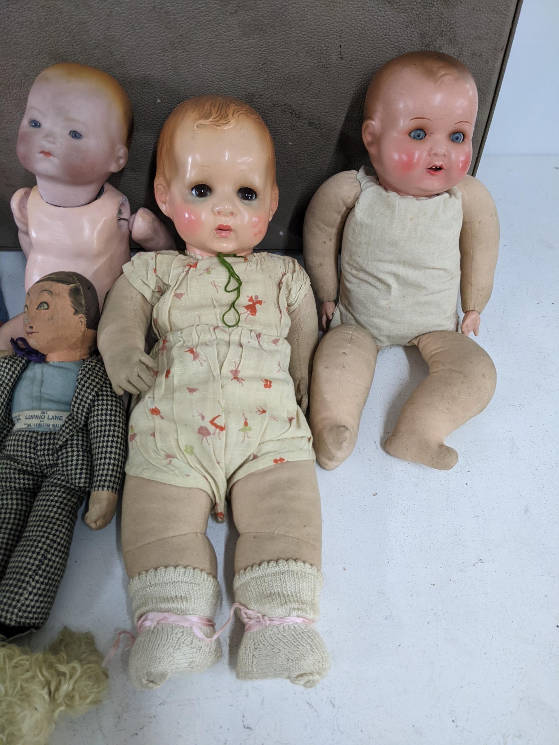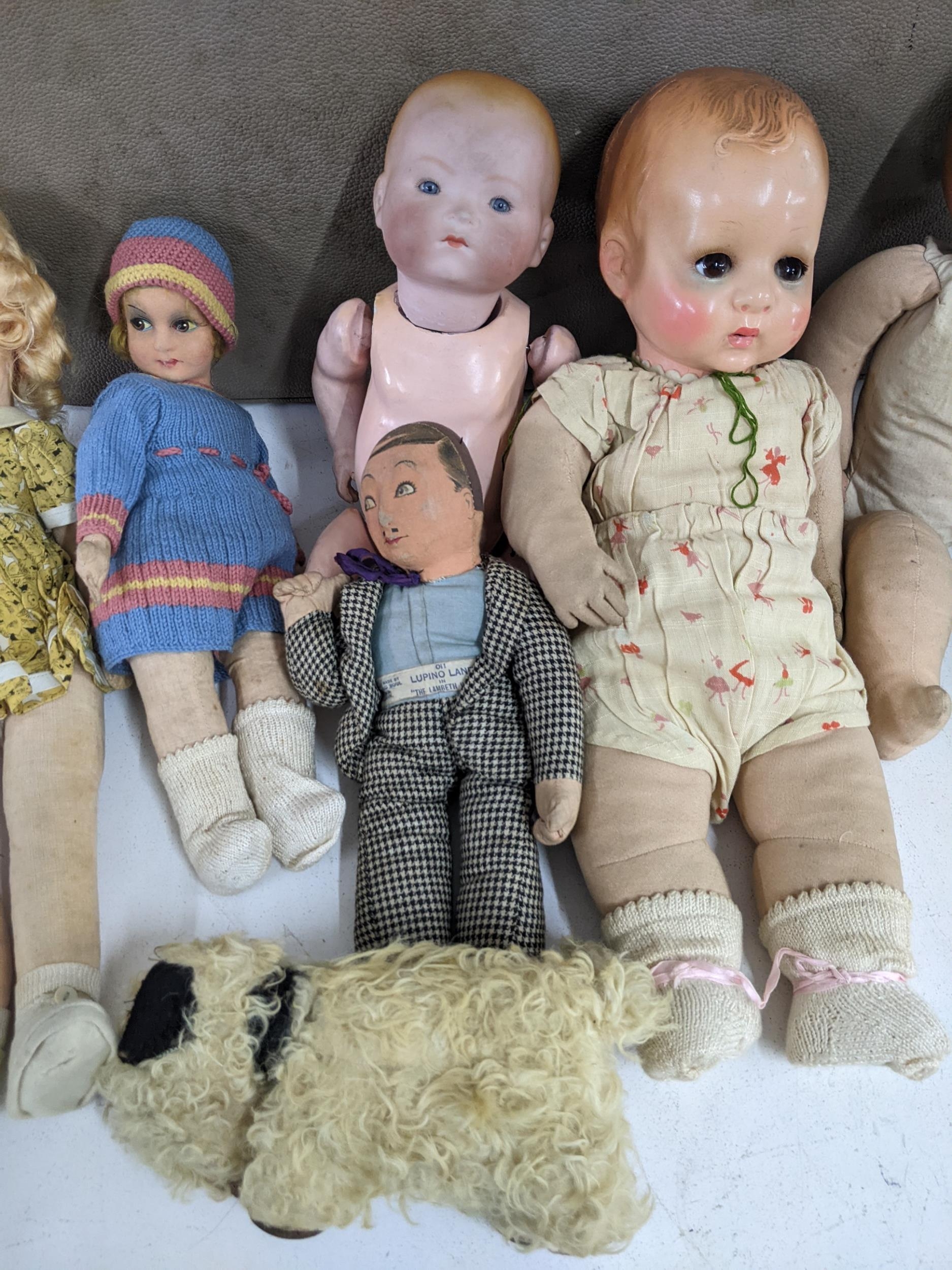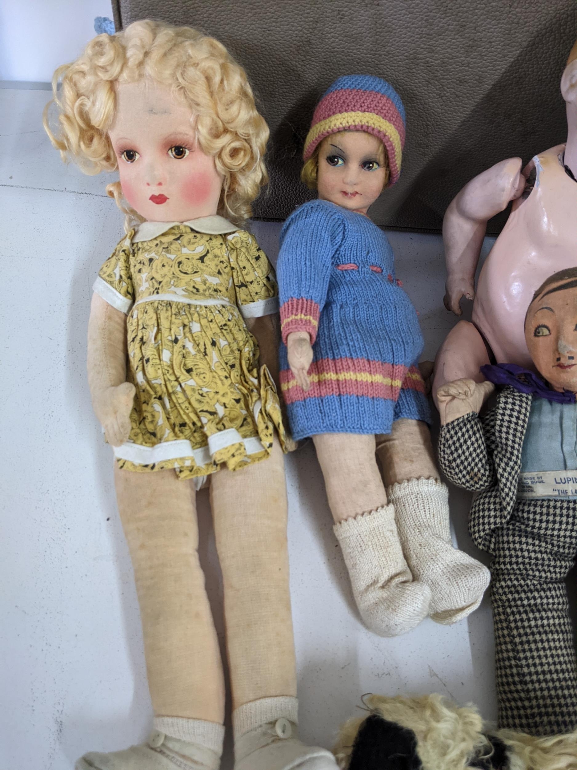 Six dolls and a large collection of accessories and clothing, one of the dolls - A gentleman 011 Lupino Lane in "The Lambeth Walk" and a toy dog