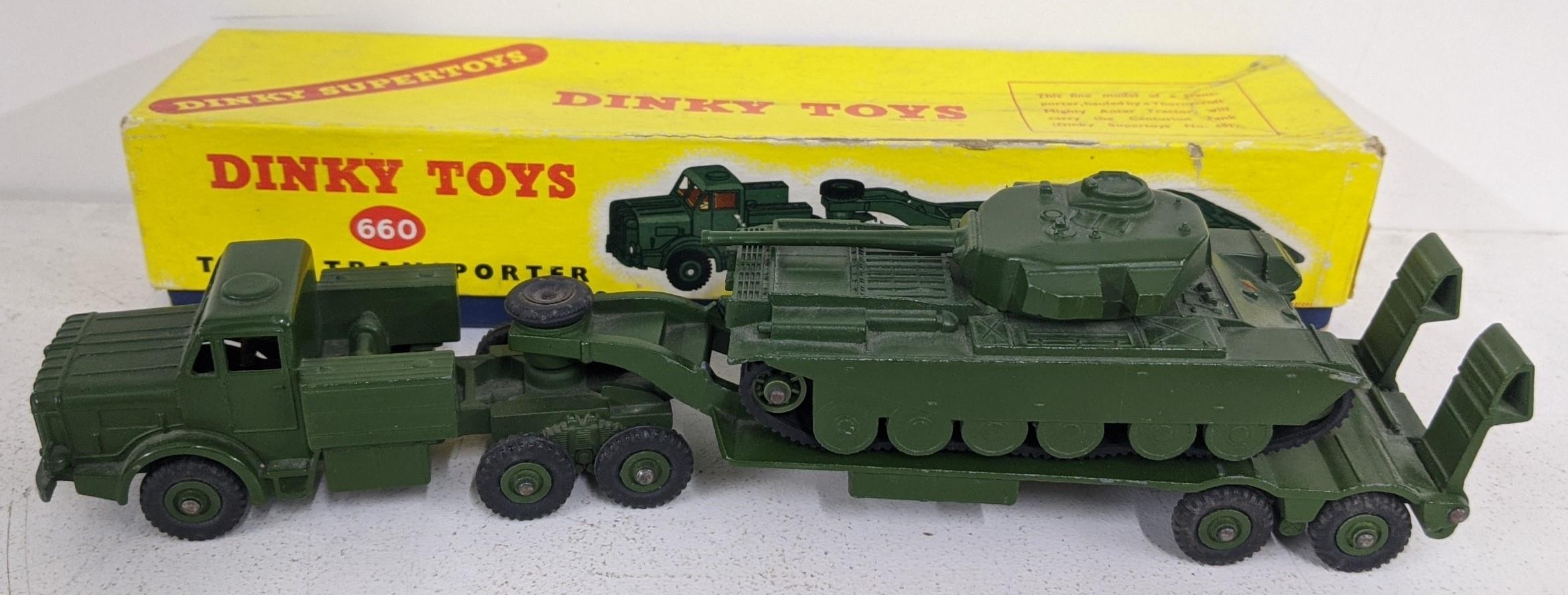 A Dinky Supertoys 660 Tank Transporter, hauled by a Thorneycroft Mighty Antar Tractor boxed, and a Dinky Supertoys Centurion Tank 651 unboxed.