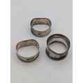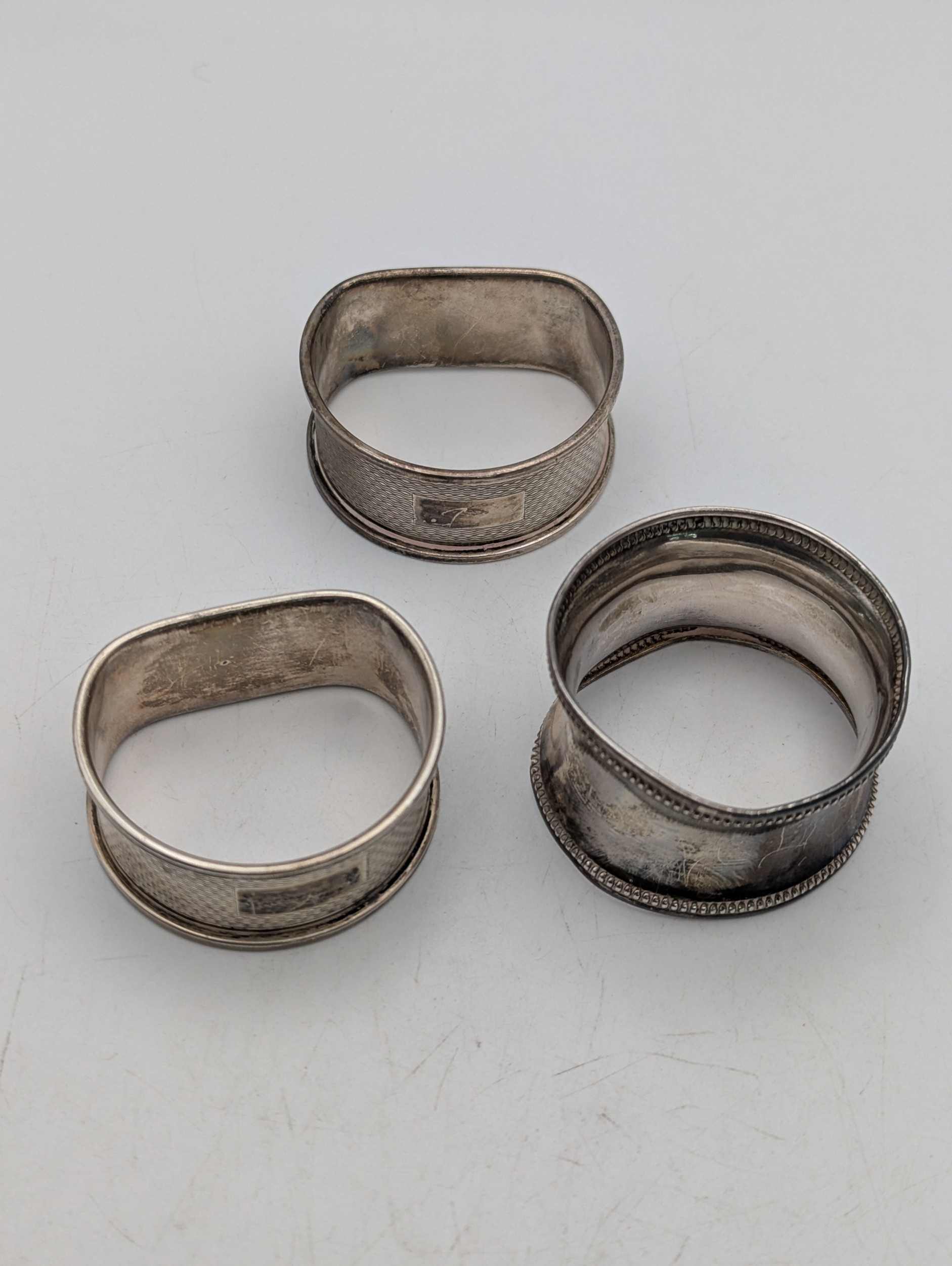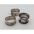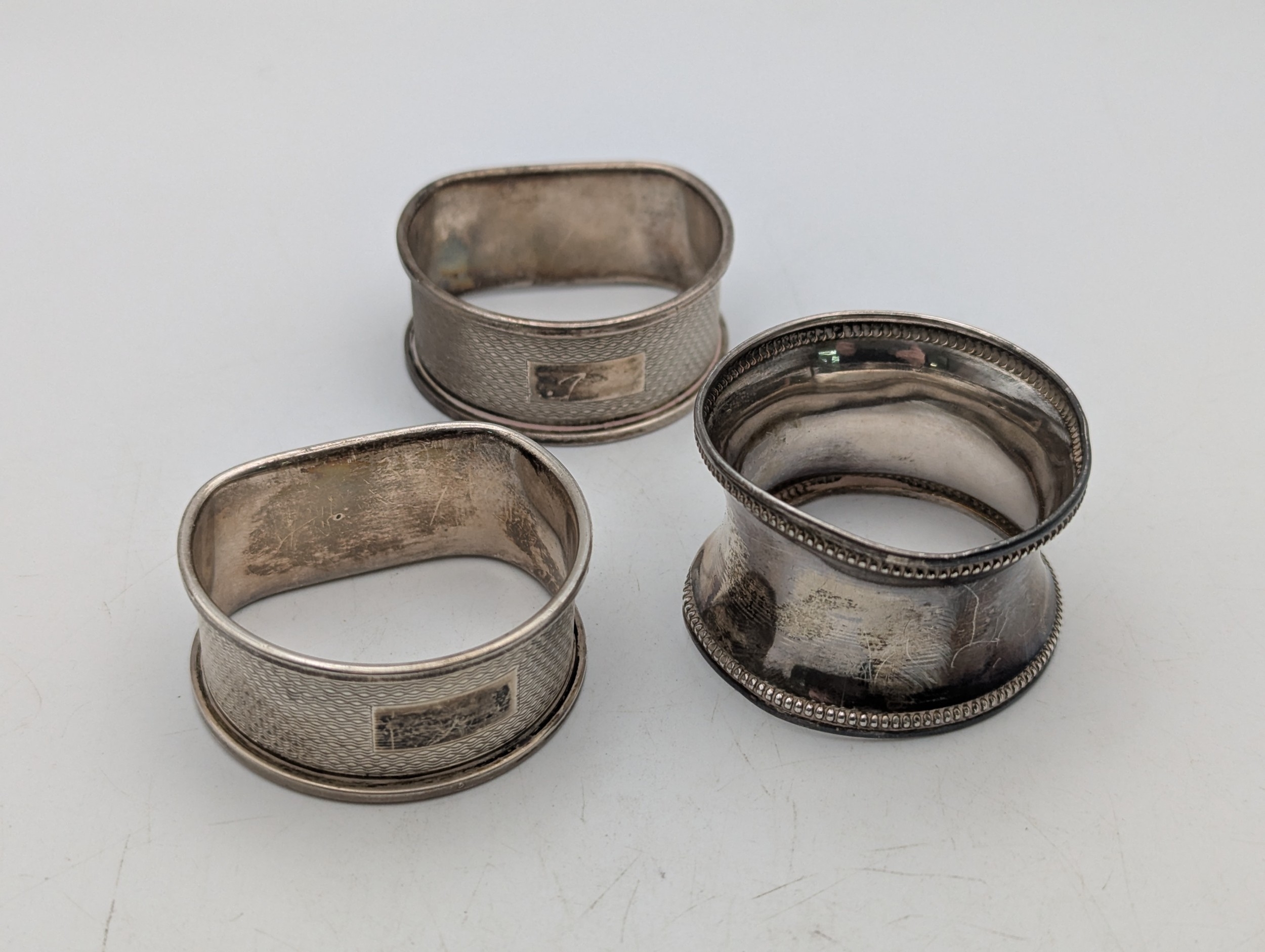 Three silver napkin rings two Broadway and Co Elizabeth II napkin rings with machine turned decoration and vacant cartouches, Birmingham 1960 and George V napkin ring of waisted form with beaded edge borders, Birmingham 1918, makers mark for Charles Wilkes, total weight 40.4g