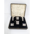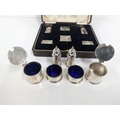 Six silver condiment pots comprising of two salts, two lidded mustard pot (three with glass liners) and a pair of pepper pots, total weight excluding glass 201.2g, in a fitted case