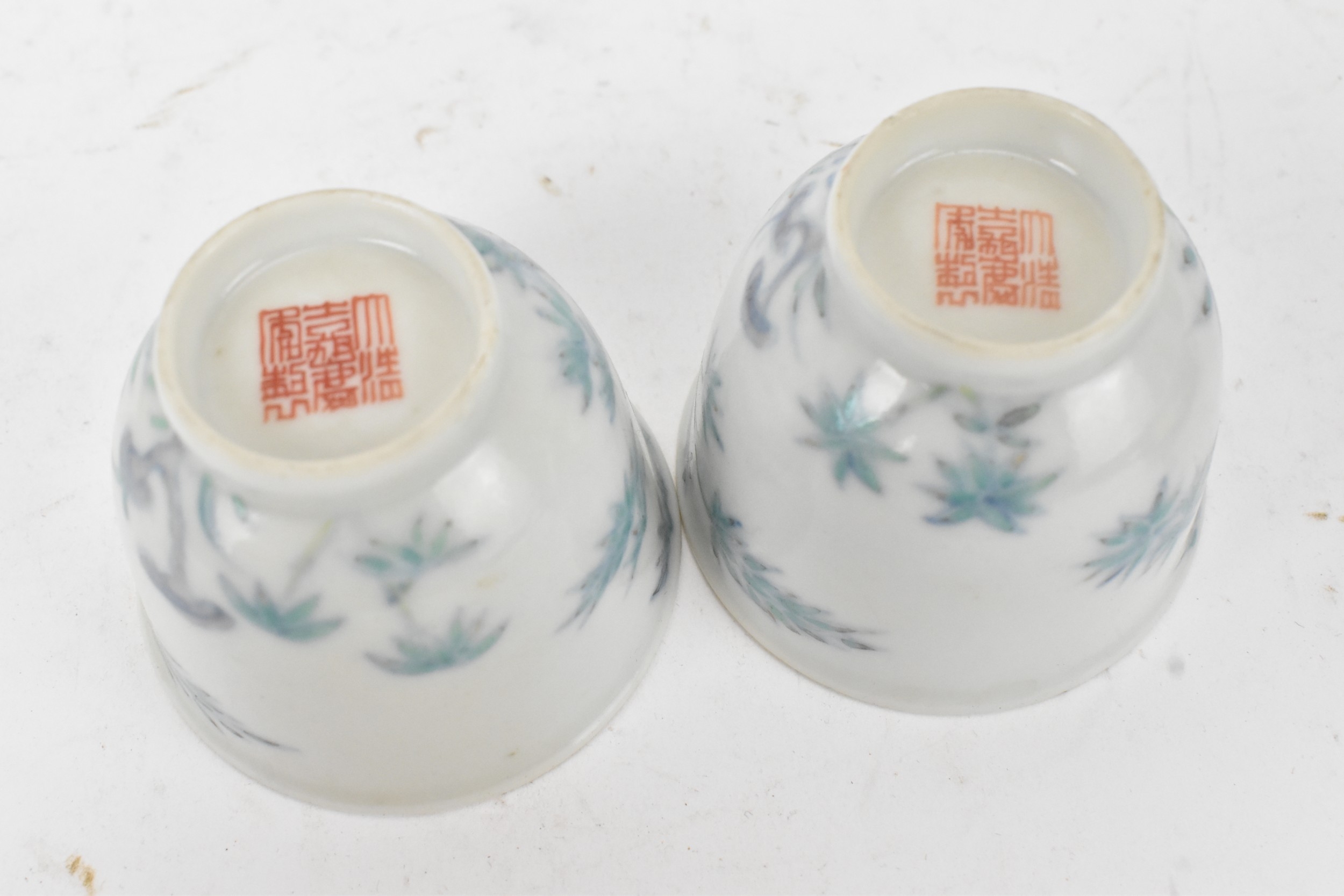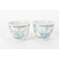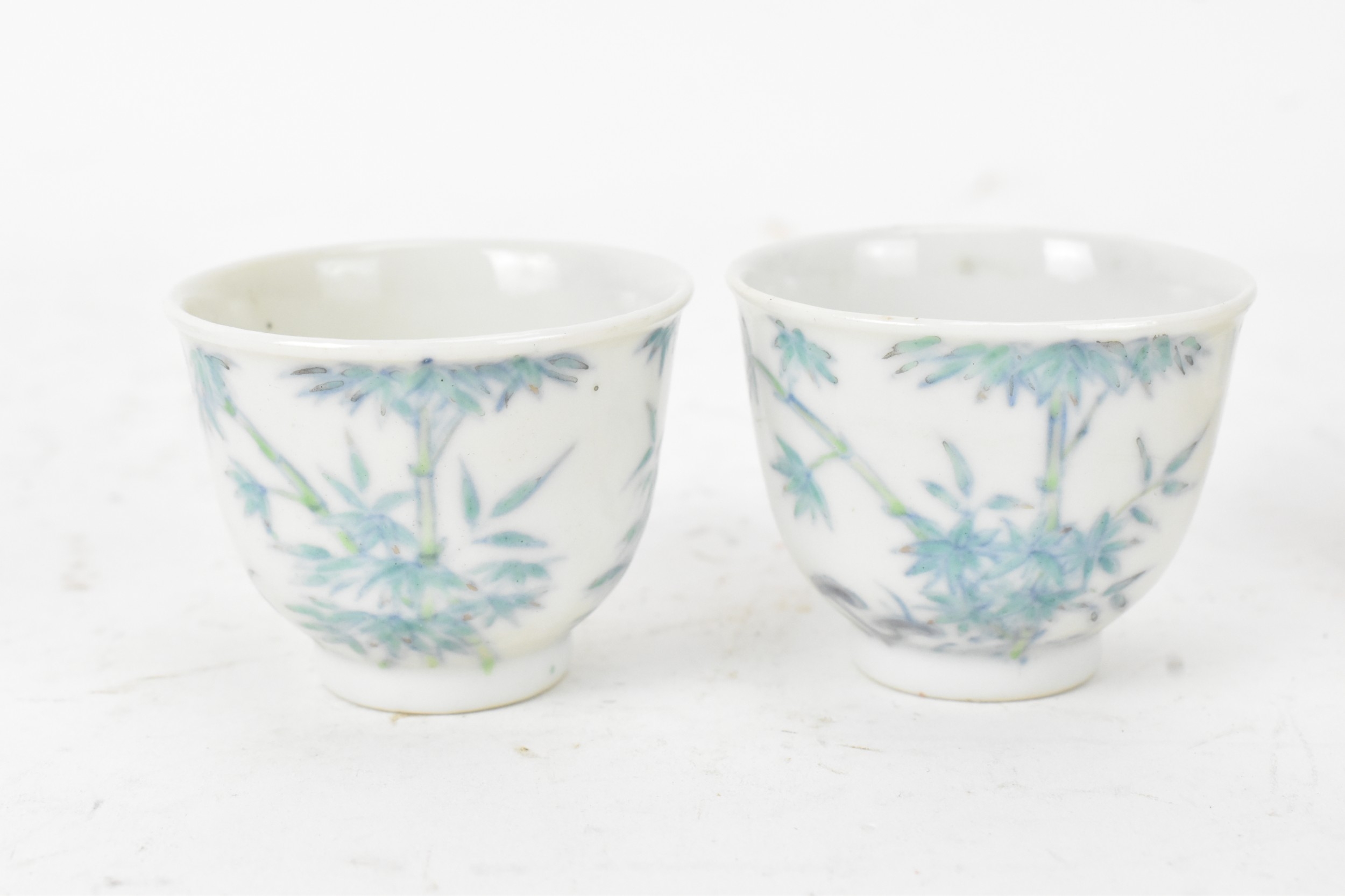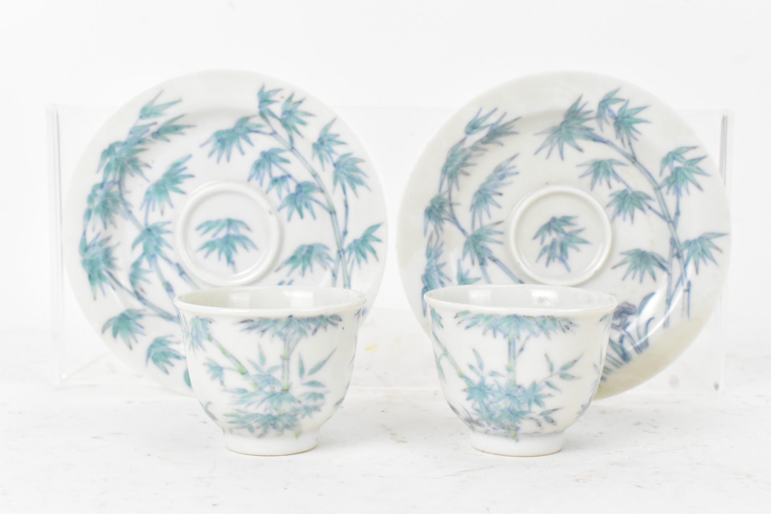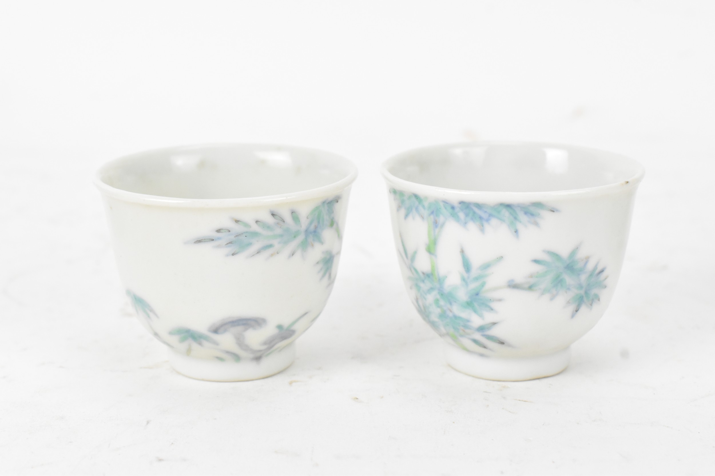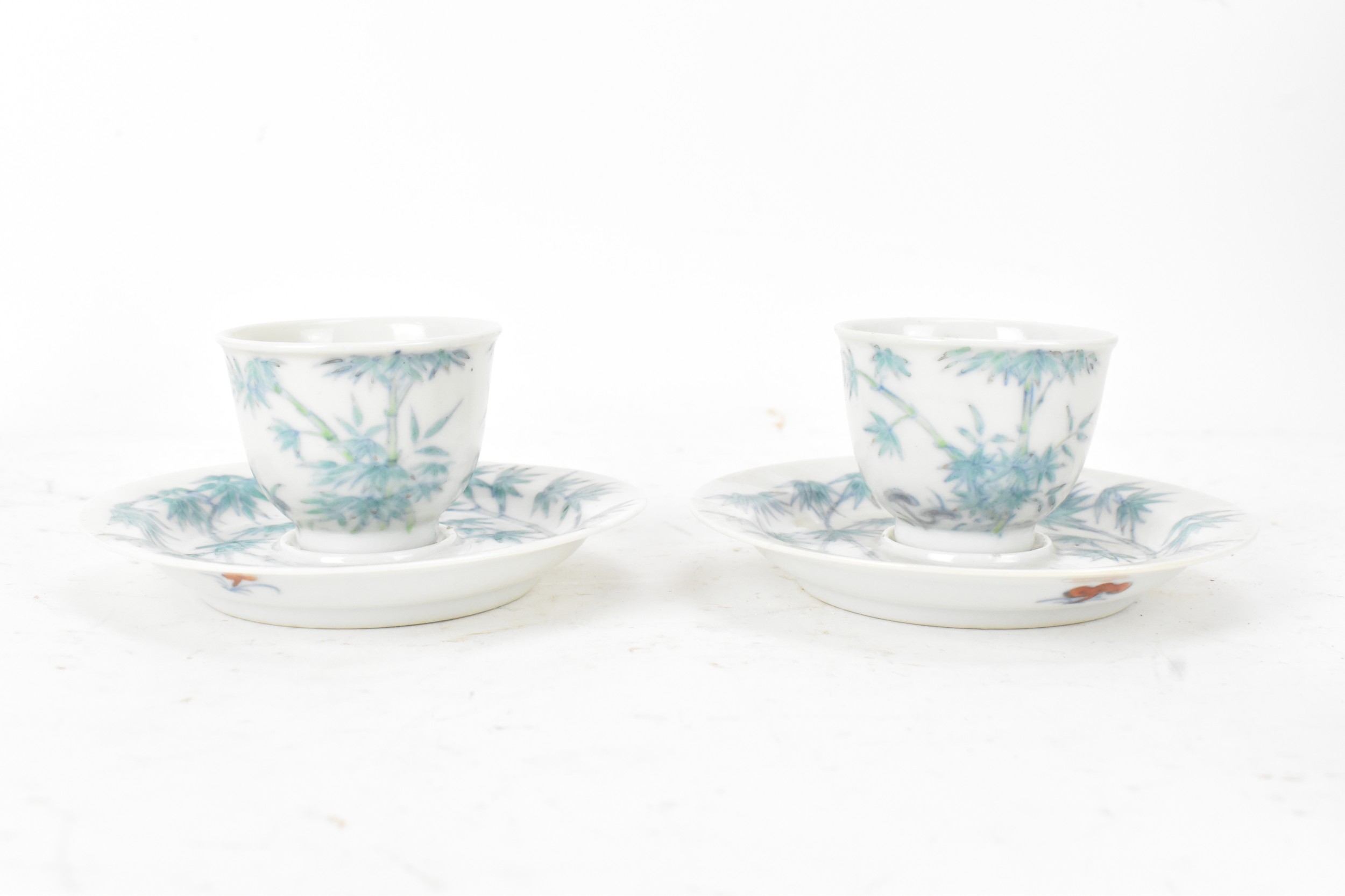 A pair of Chinese famille-verte porcelain cups and saucers, each cup of flared form, decorated with bamboo and lingzhi fungus, the bases with iron-red seal marks, cups 4.2cm high x 5.5cm wide, saucers 11.2cm wide