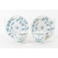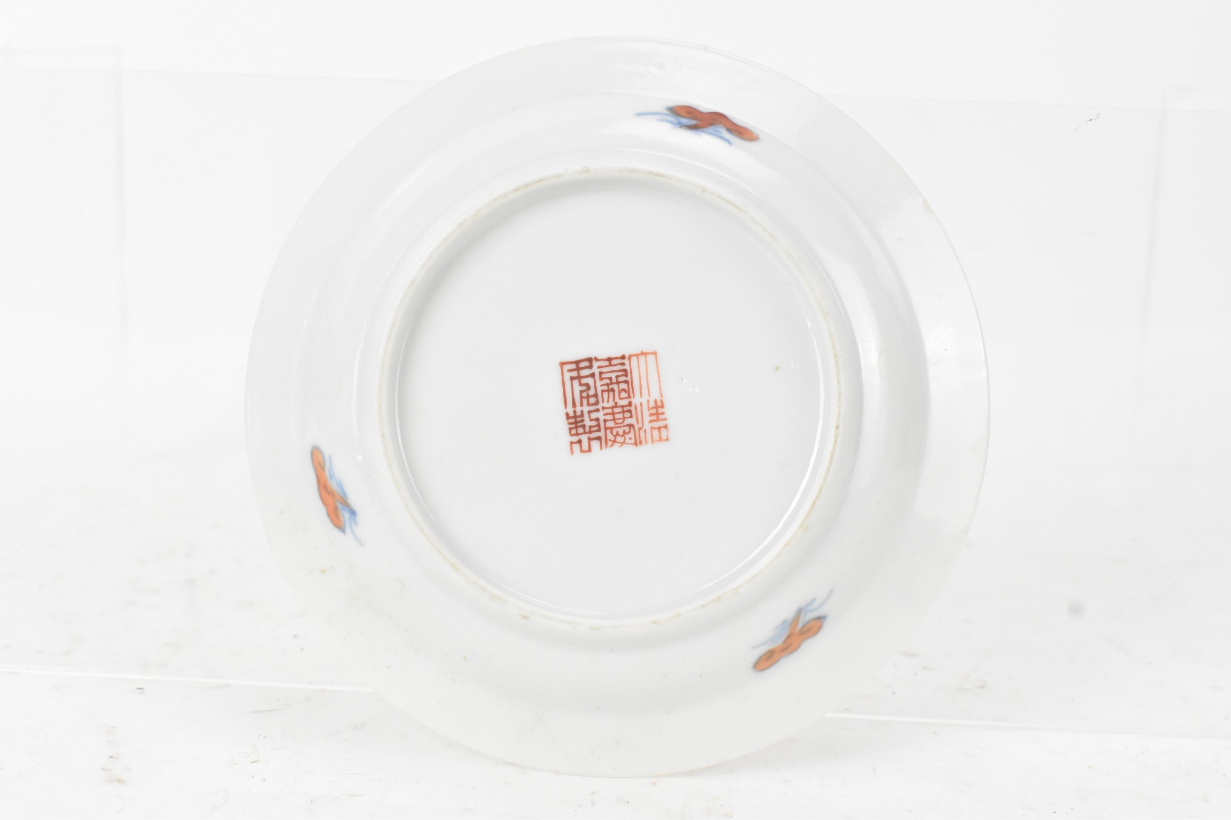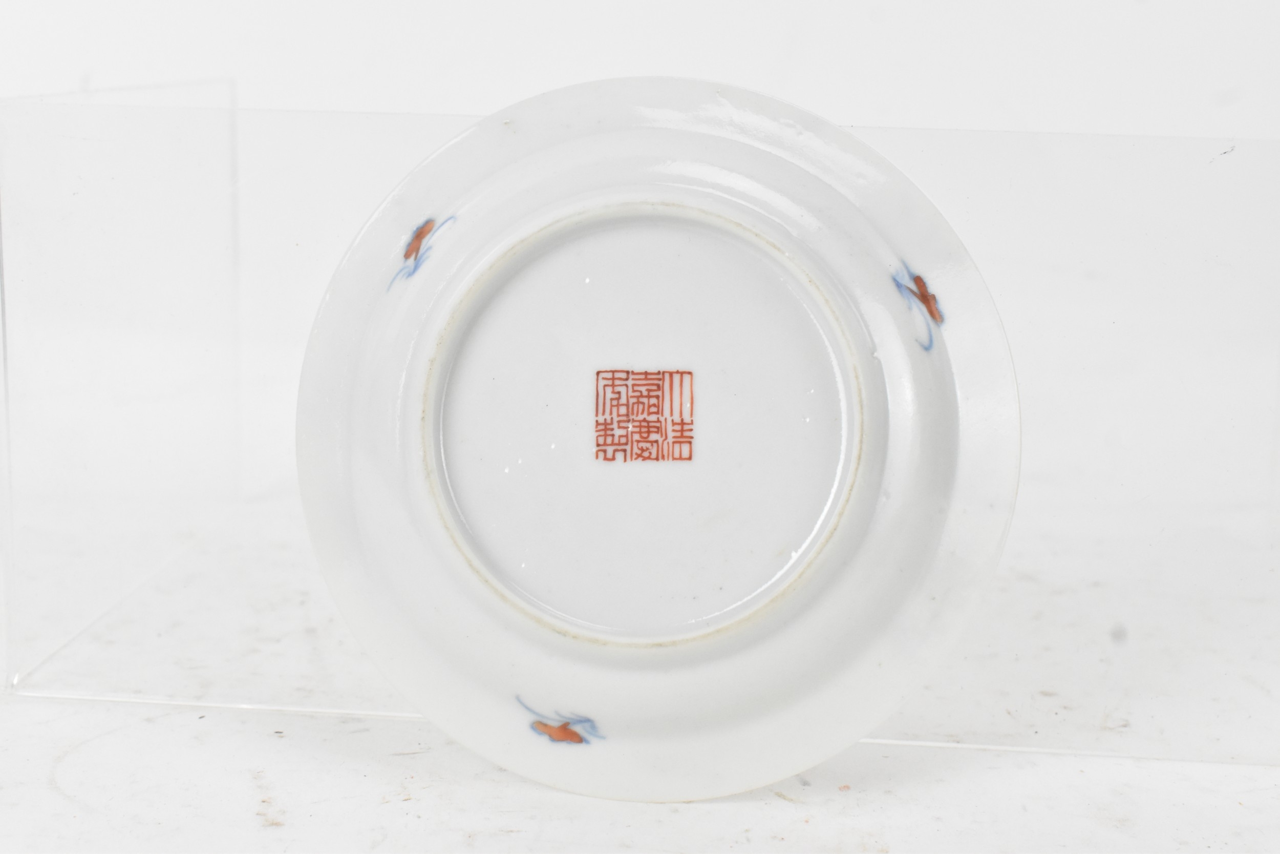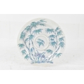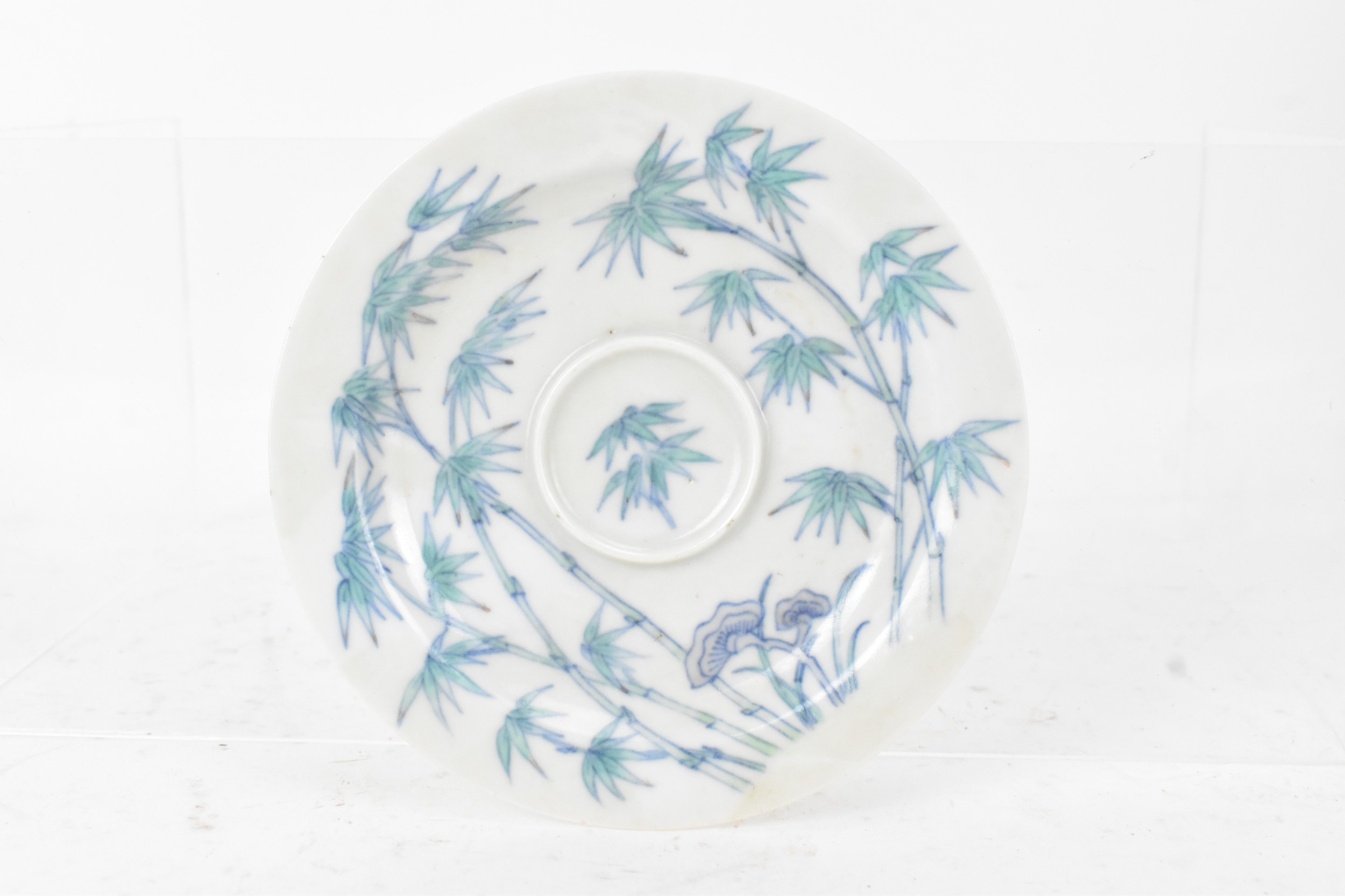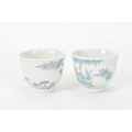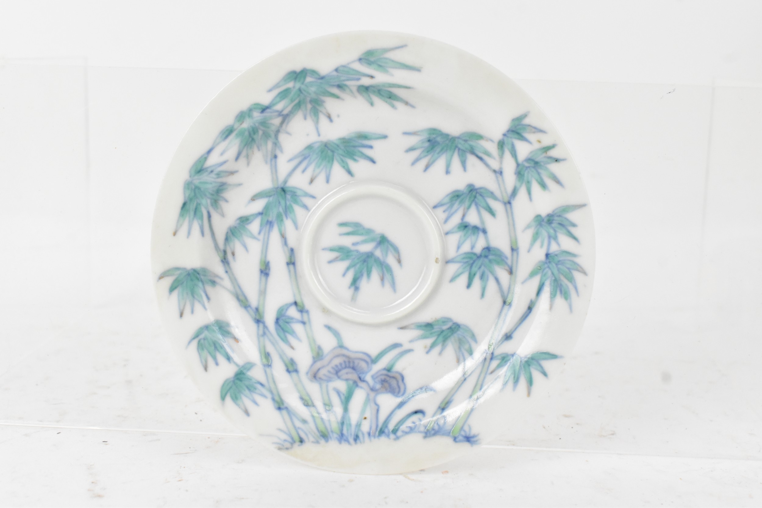 A pair of Chinese famille-verte porcelain cups and saucers, each cup of flared form, decorated with bamboo and lingzhi fungus, the bases with iron-red seal marks, cups 4.2cm high x 5.5cm wide, saucers 11.2cm wide