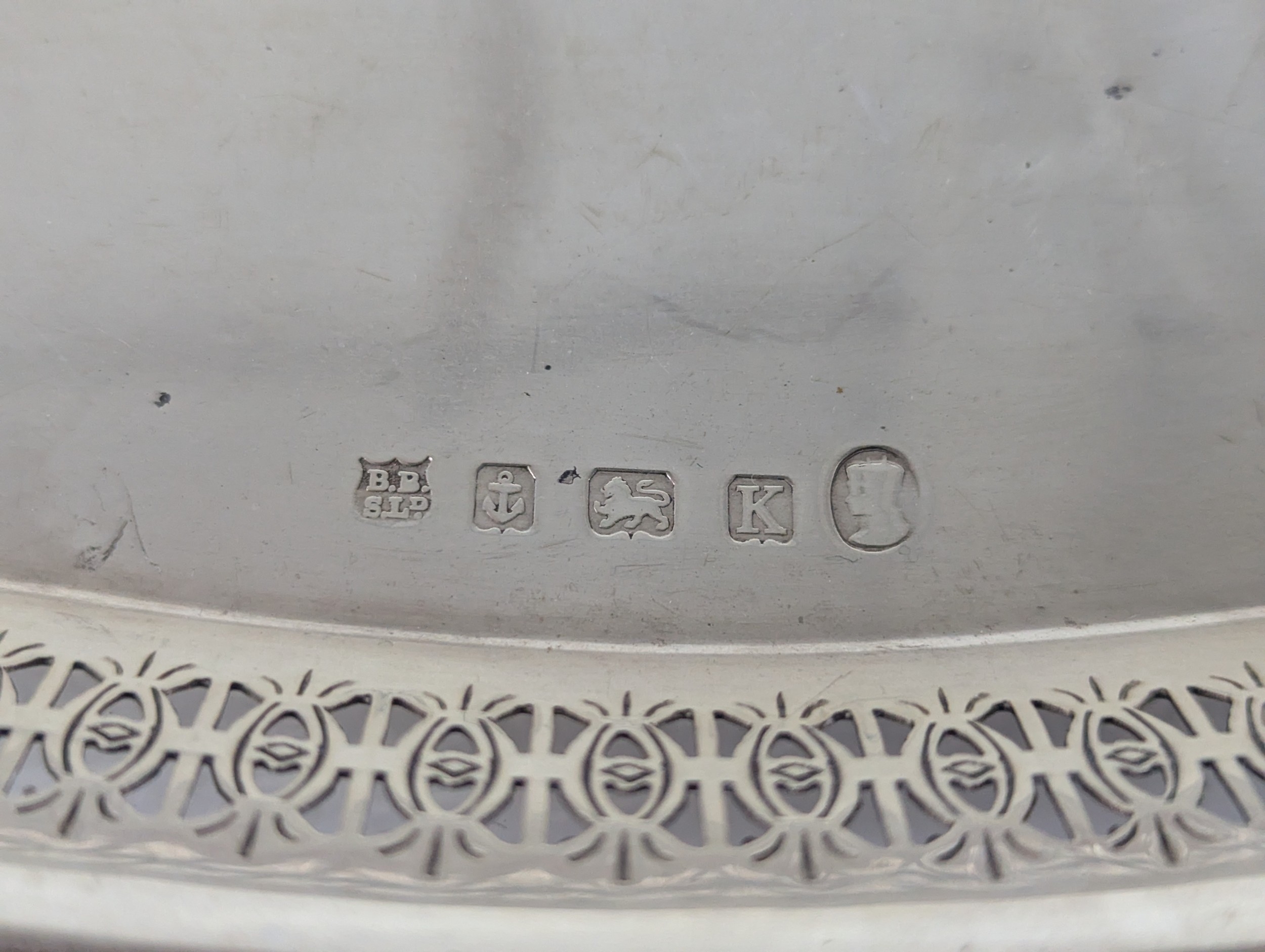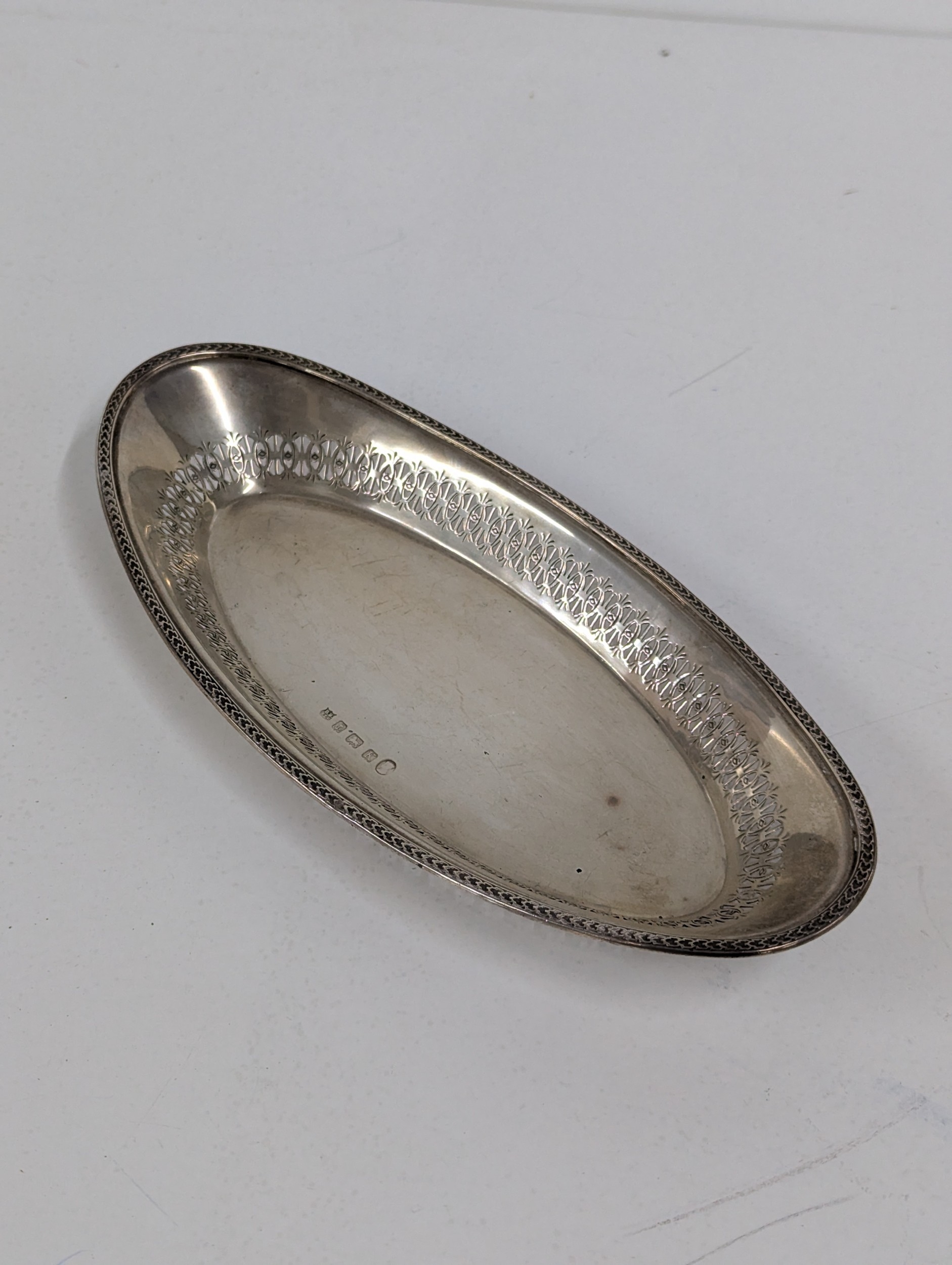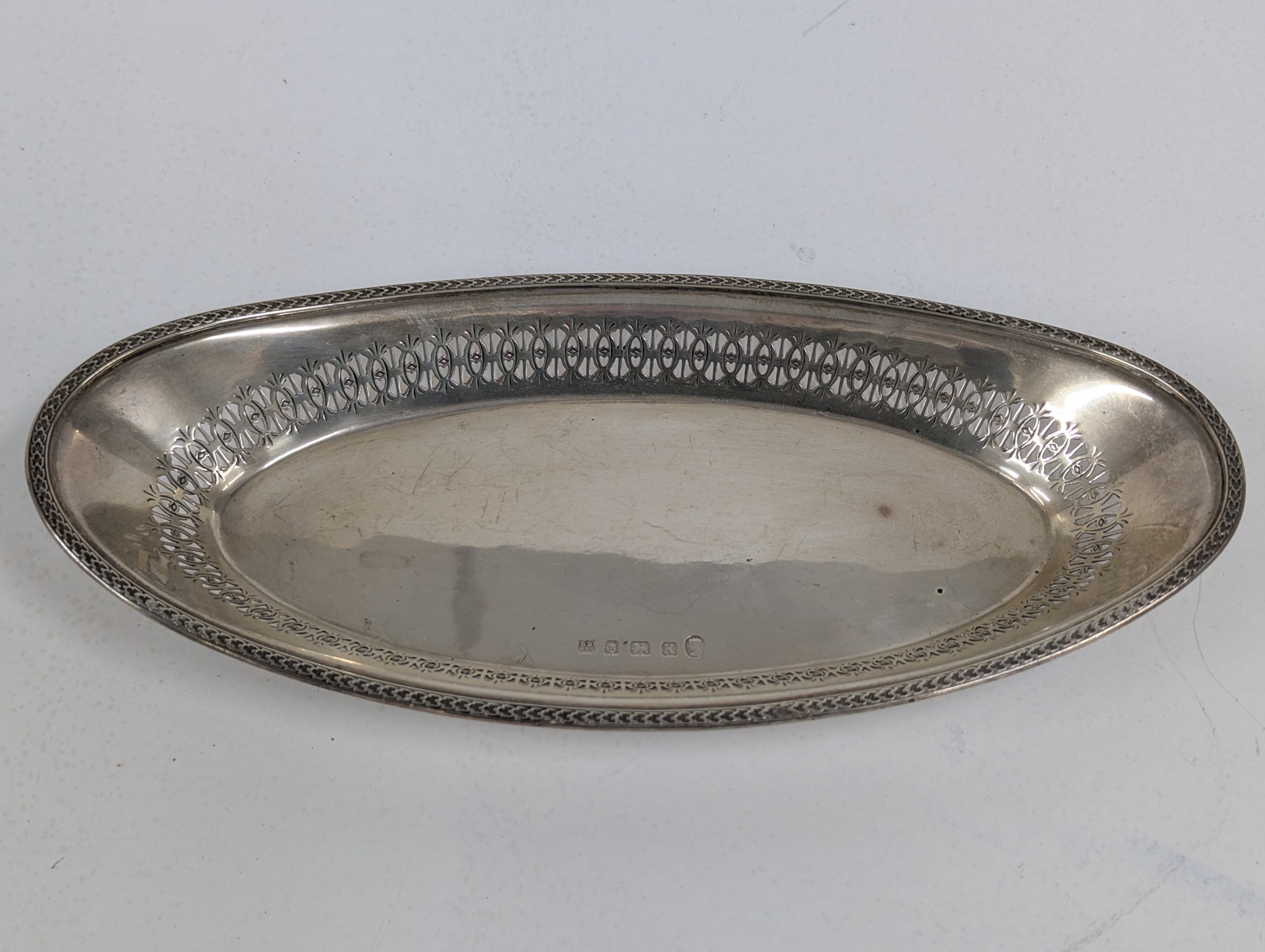 A silver oval dish having pierced decoration hallmarked Birmingham 1934 with Jubilee mark 28cm L x 13cm W, 211.9g