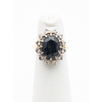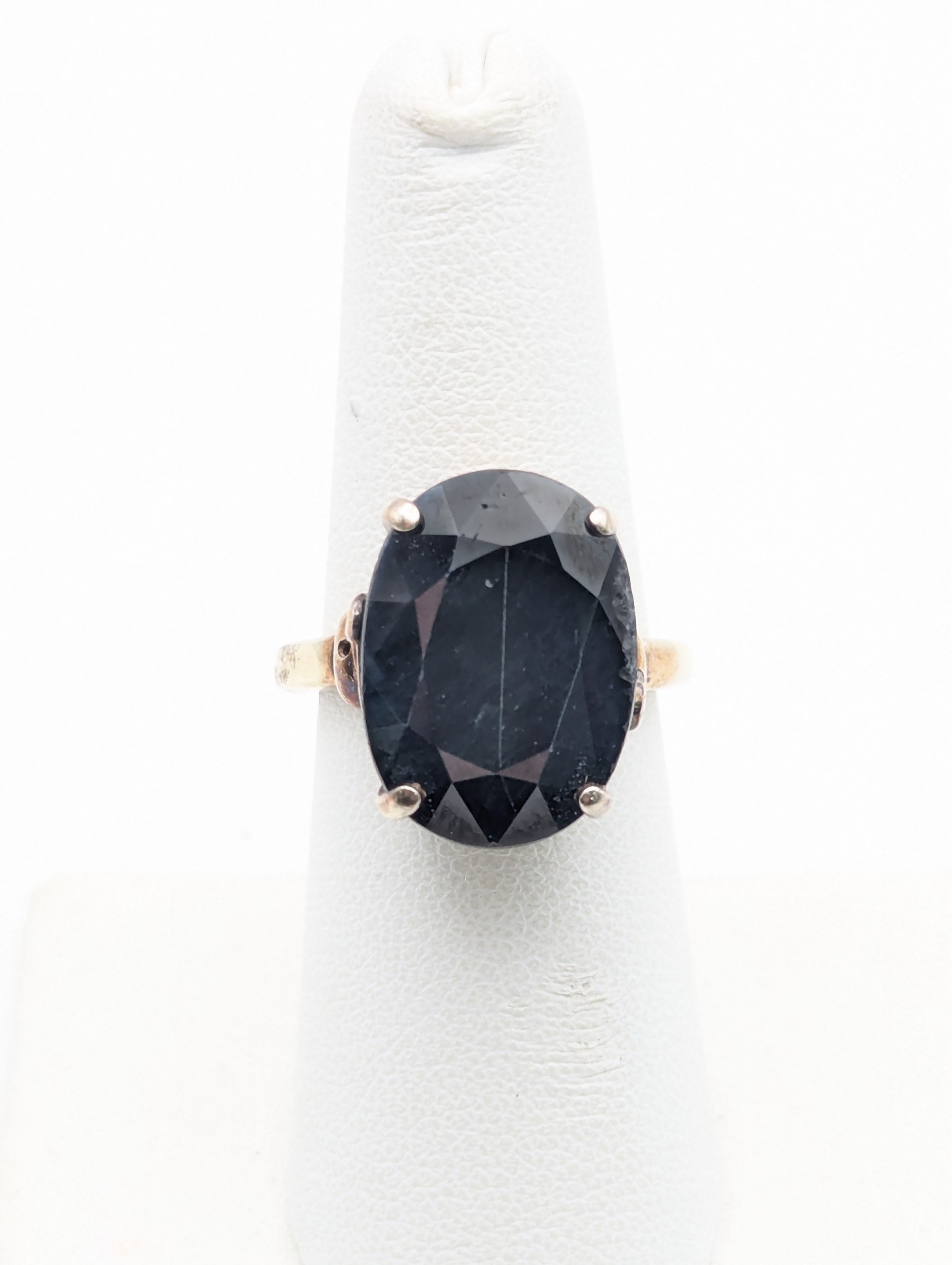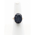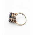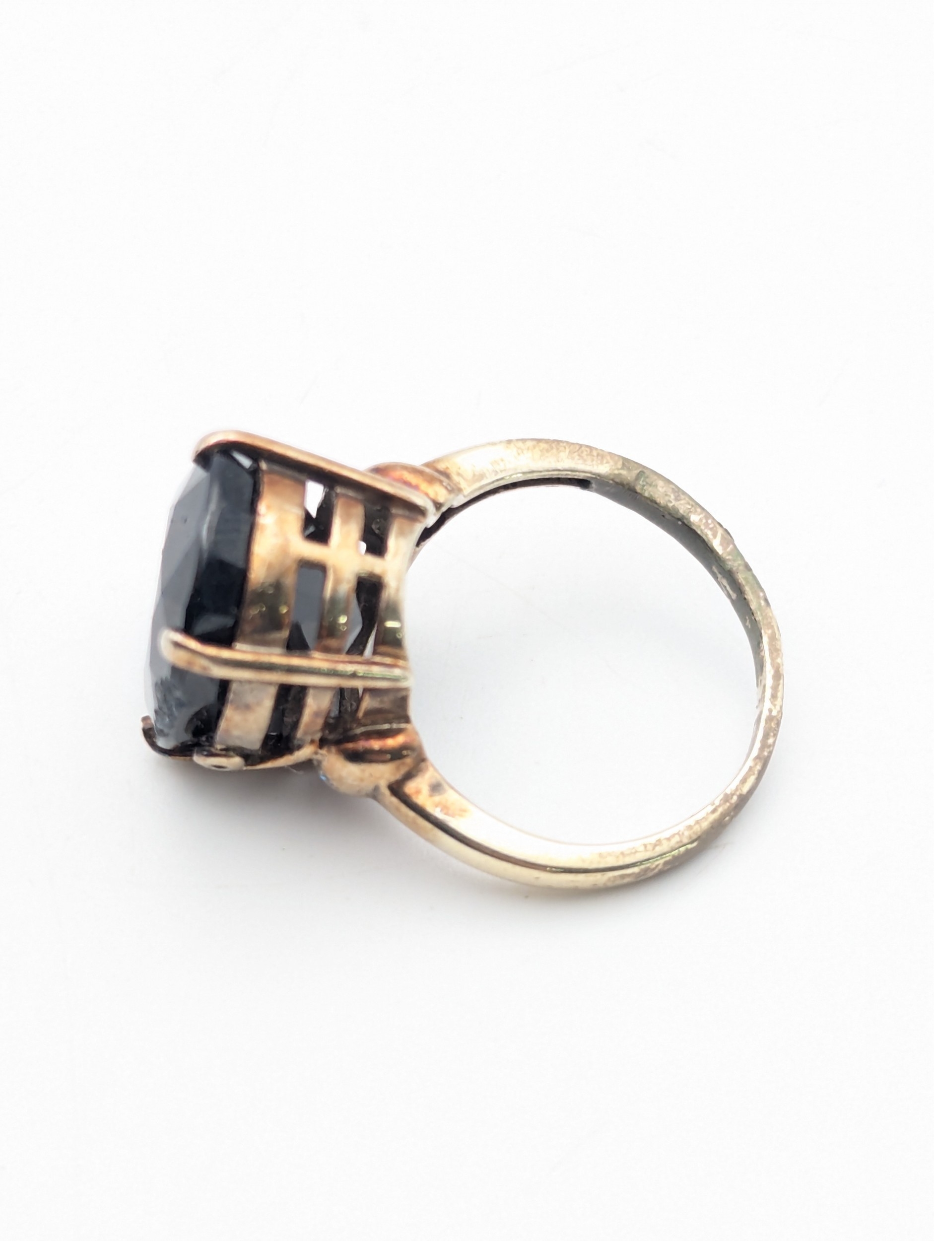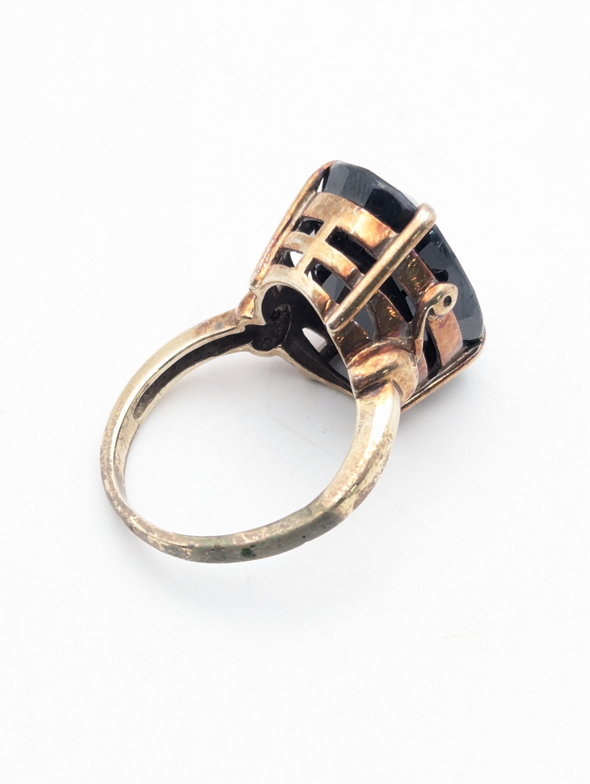 A yellow metal ring tested as 9ct with a claw set oval fasted cut dark stone possibly topaz or zircon, size N, weight 9g