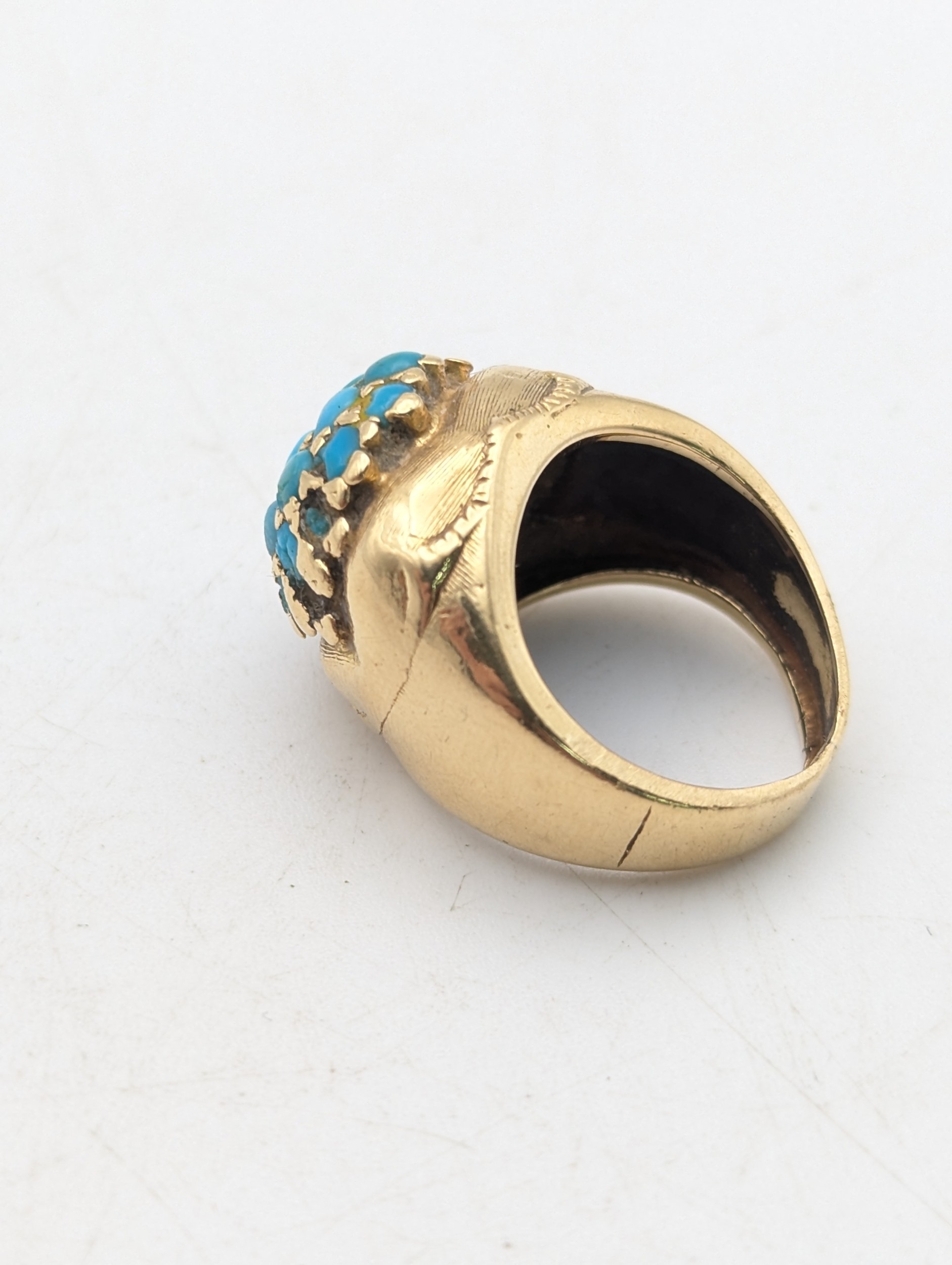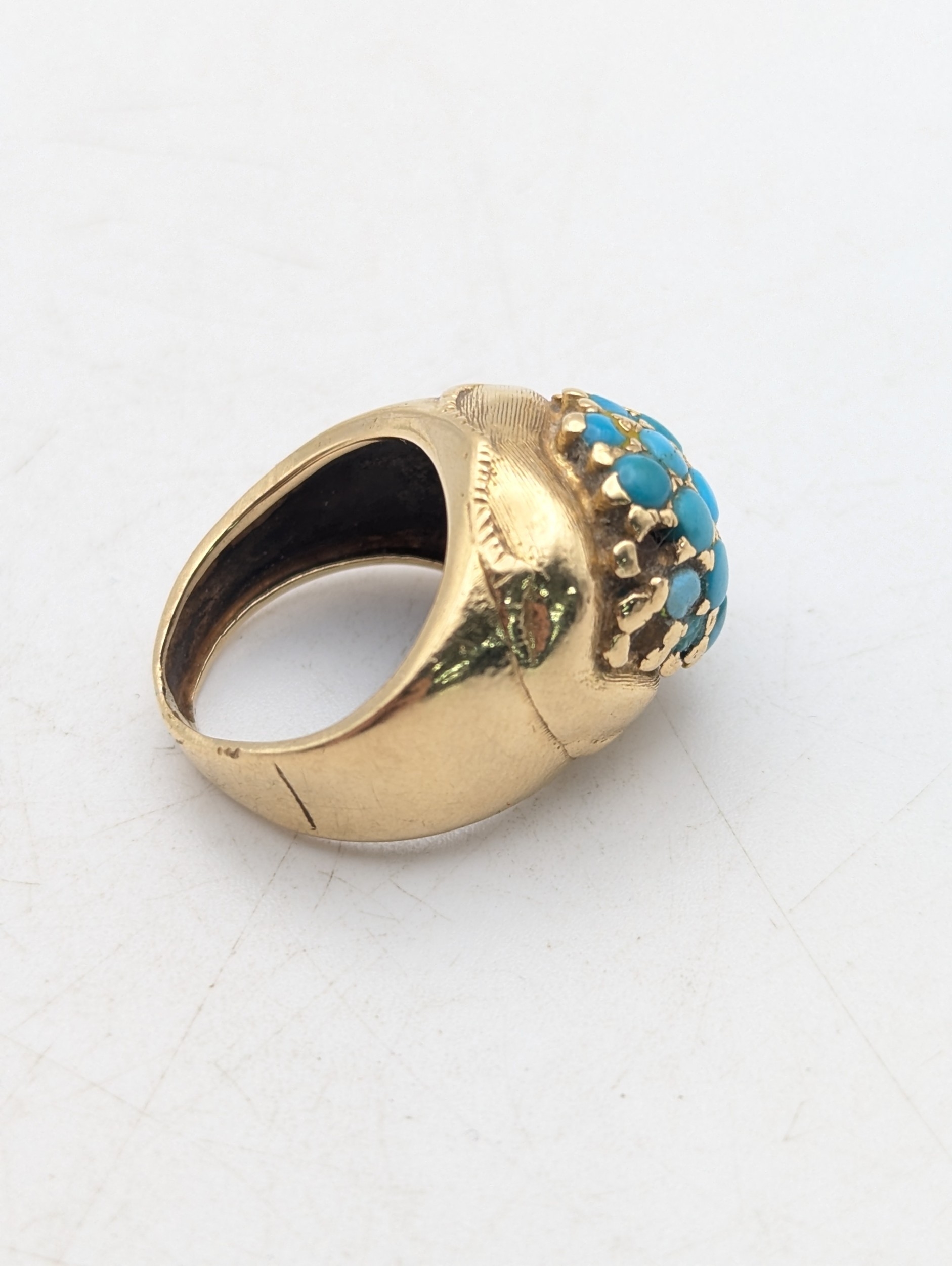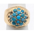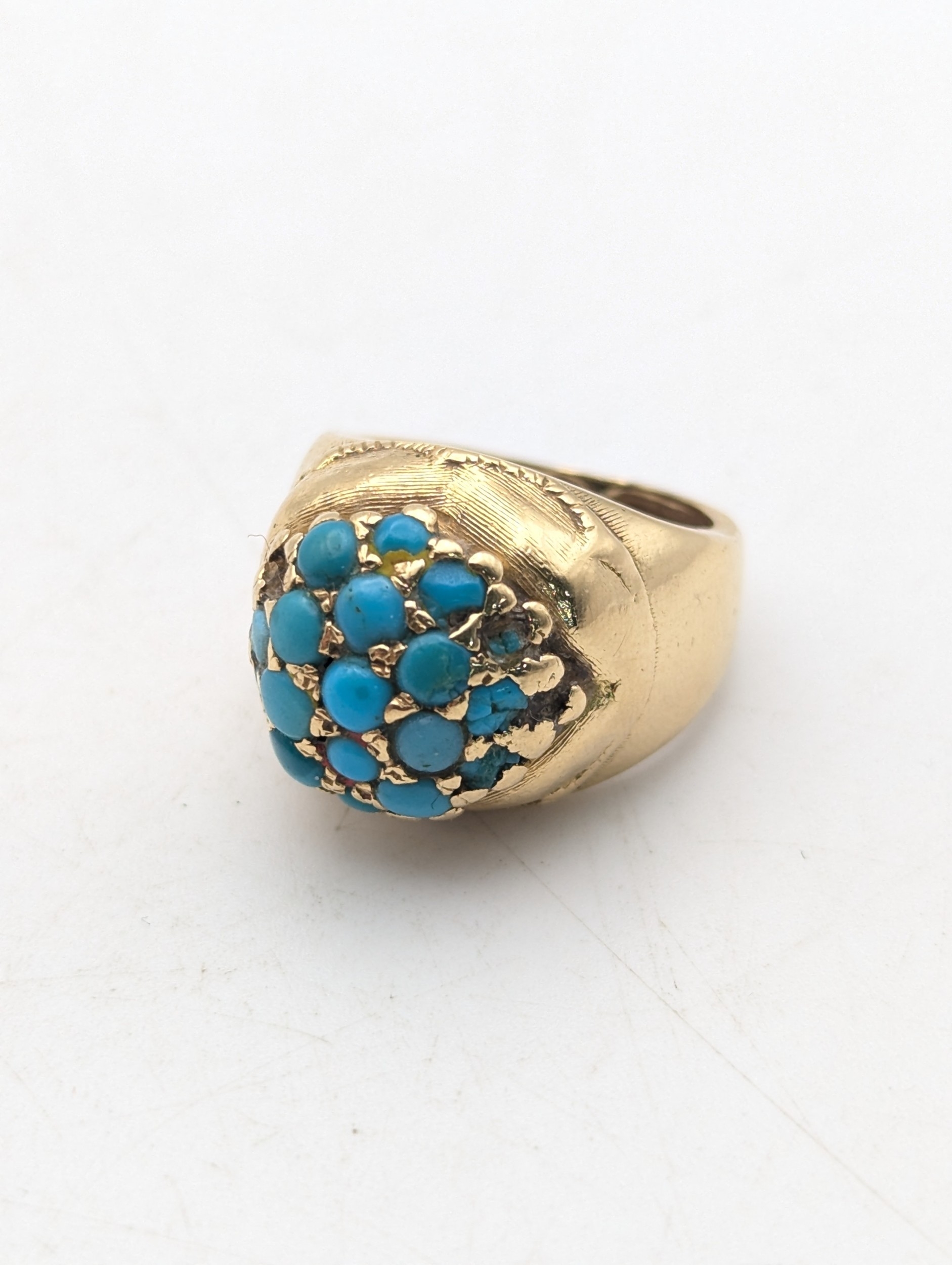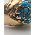 A Victorian yellow gold and turquoise cluster ring tested as 18ct gold, size H, 8.4g