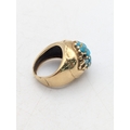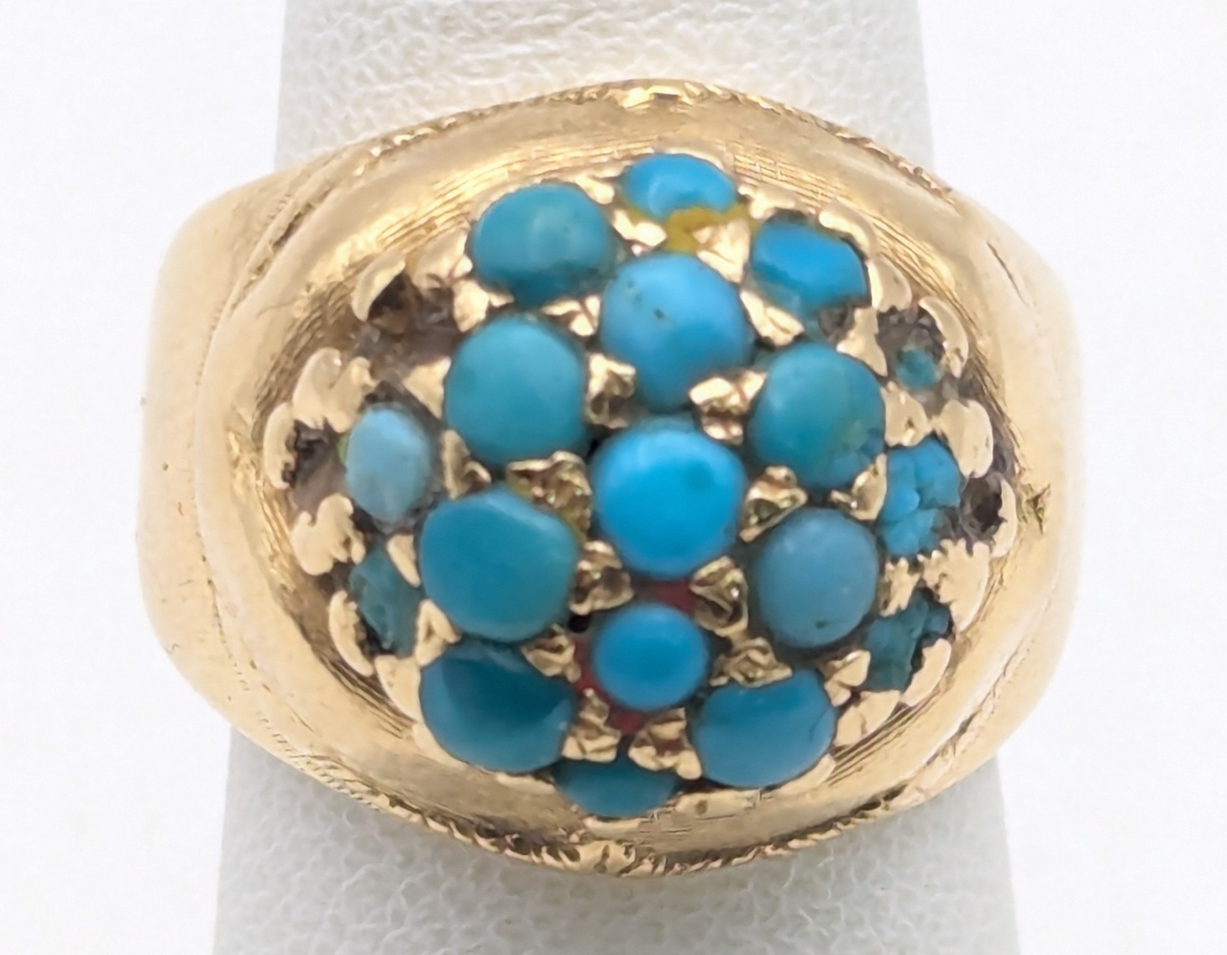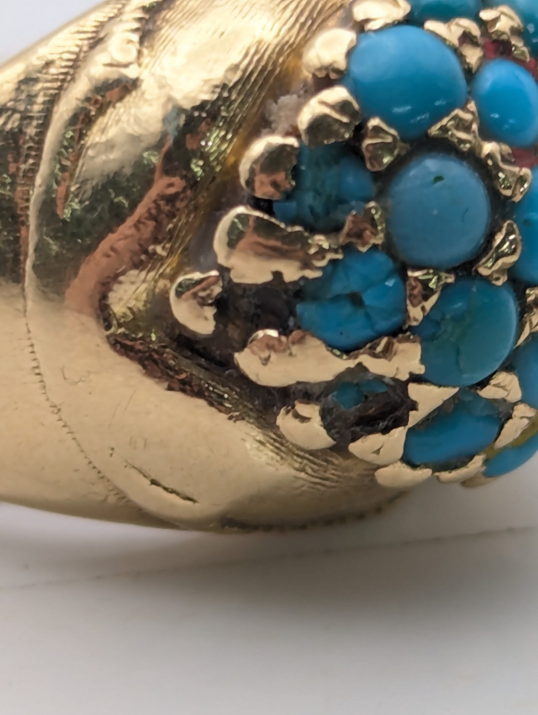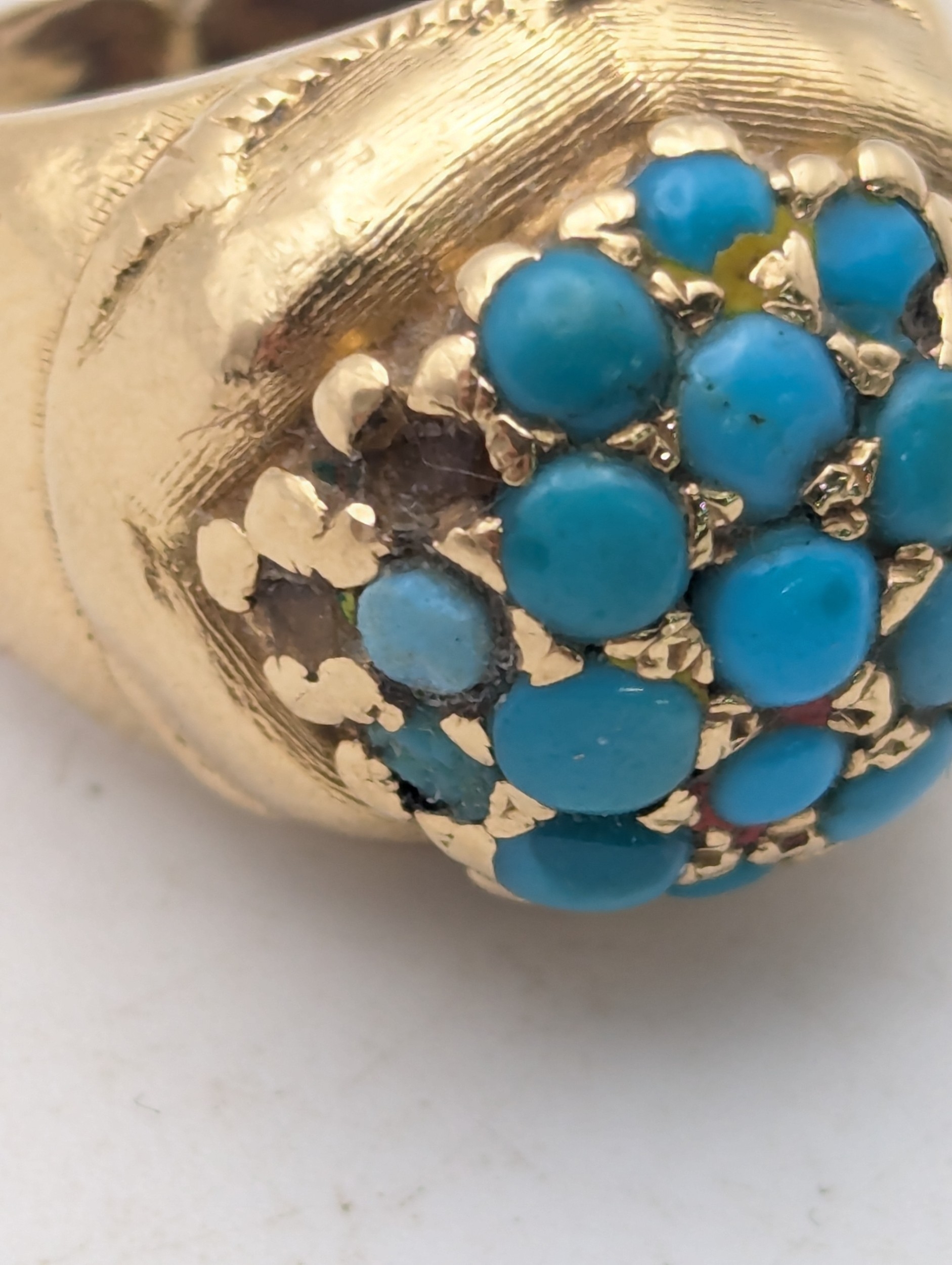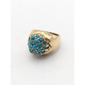A Victorian yellow gold and turquoise cluster ring tested as 18ct gold, size H, 8.4g