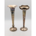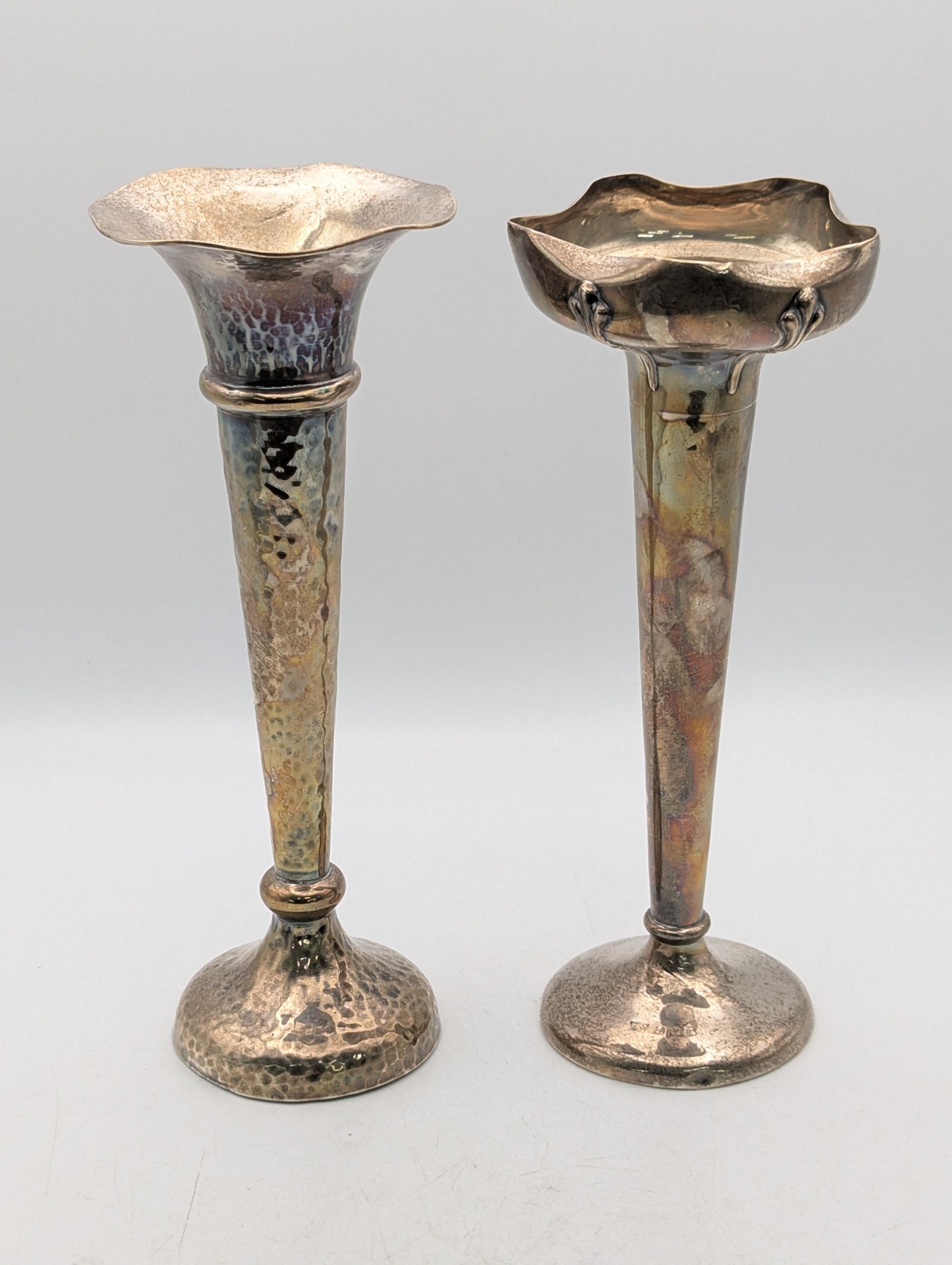 Two silver vases both with weighted bases to include a trumpet shaped bud vase with hammered decoration and one other