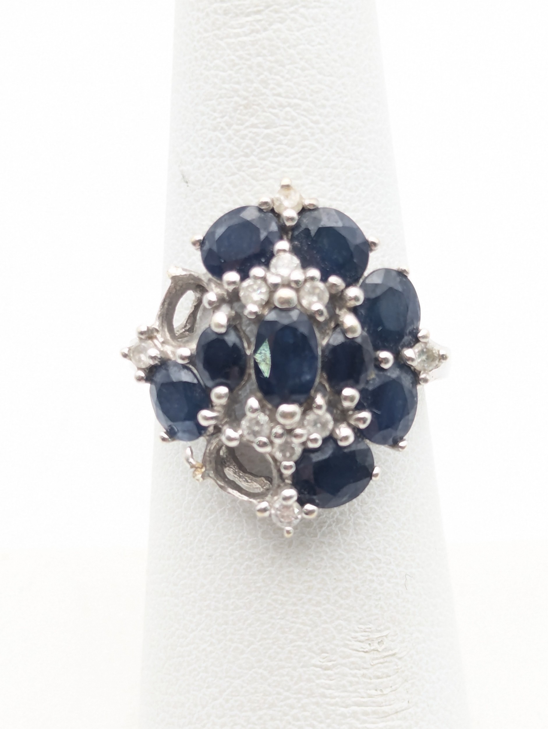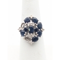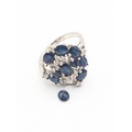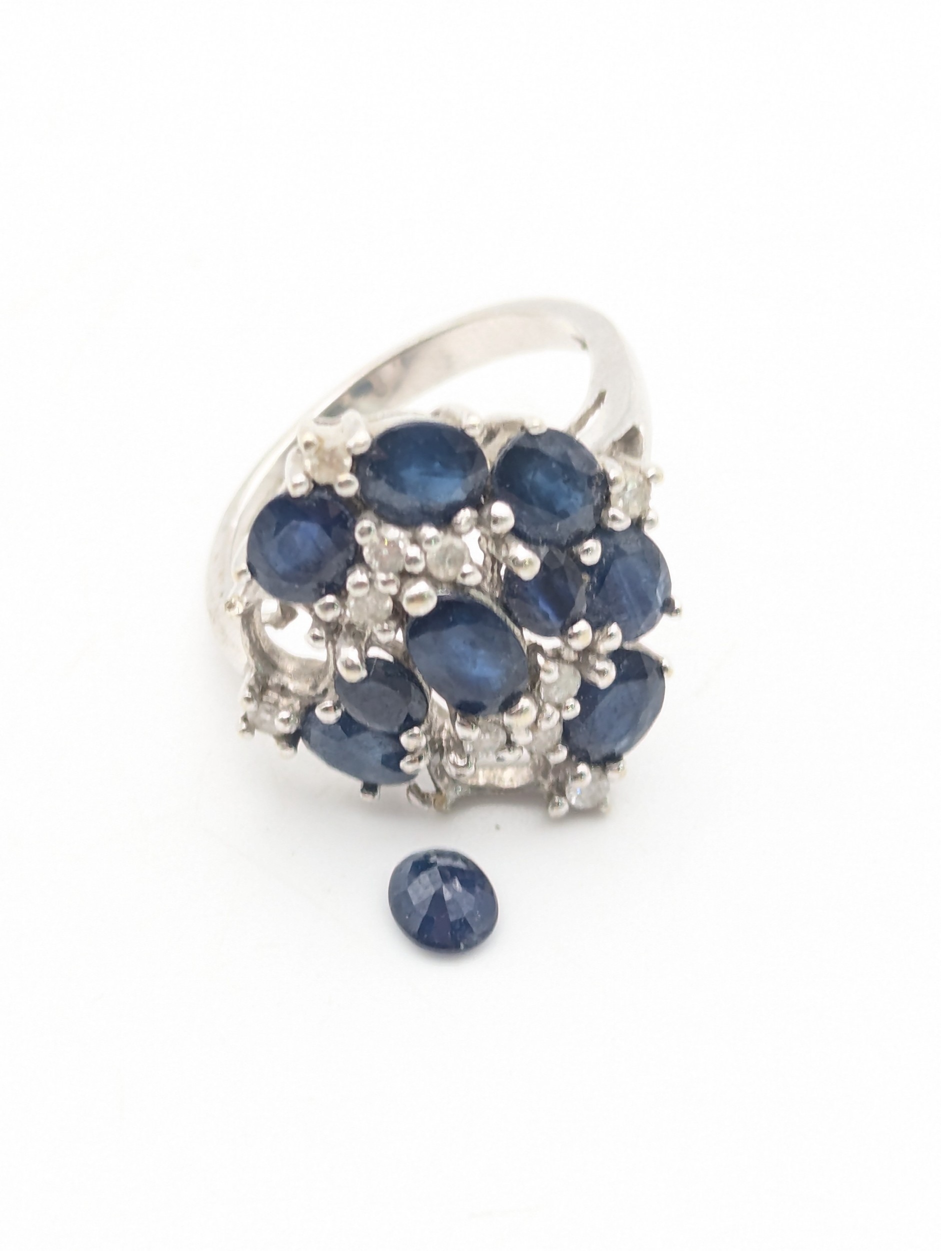A 9ct white gold sapphire and diamond cocktail ring (one sapphire loose and another missing) size N1/2, weight 5.4g
