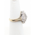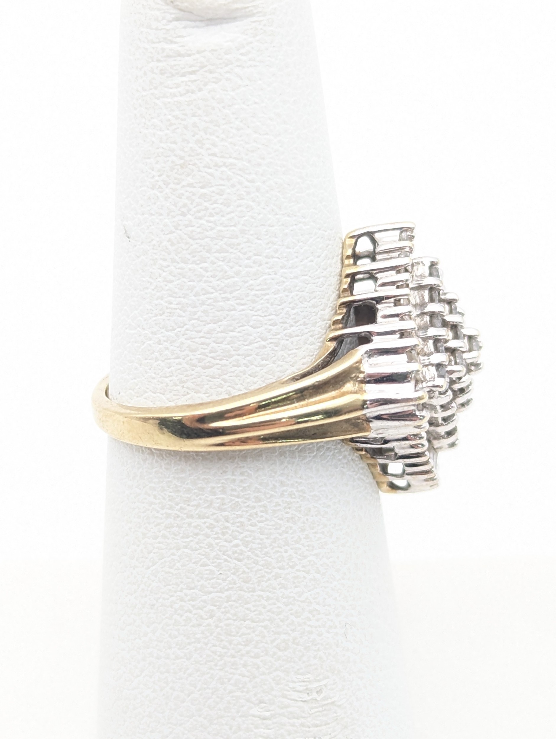 A 9ct yellow gold diamond cluster ring set with 25 brilliant cut diamonds and 35 baguette cut diamonds, size M1/2, weight 5g