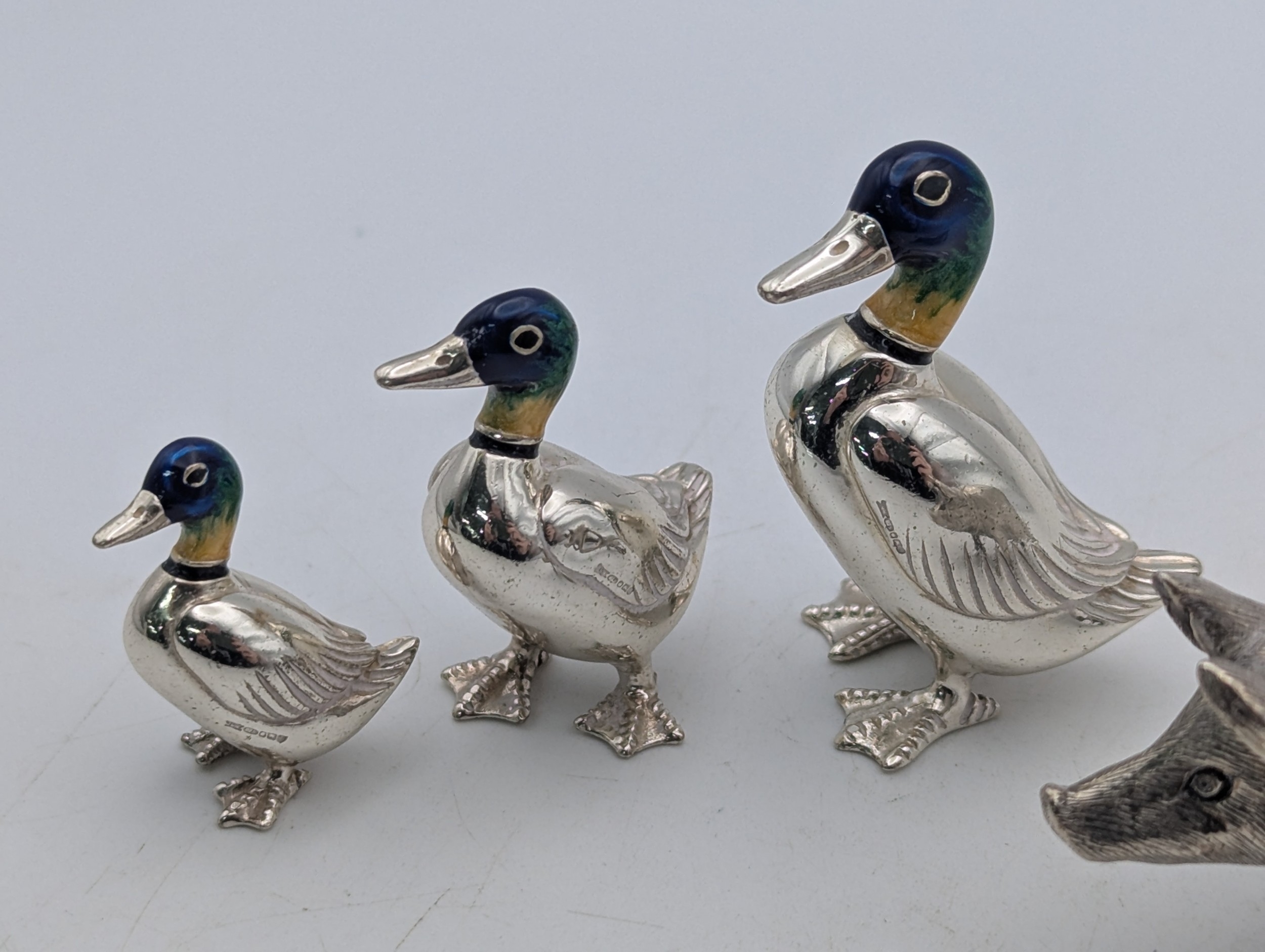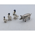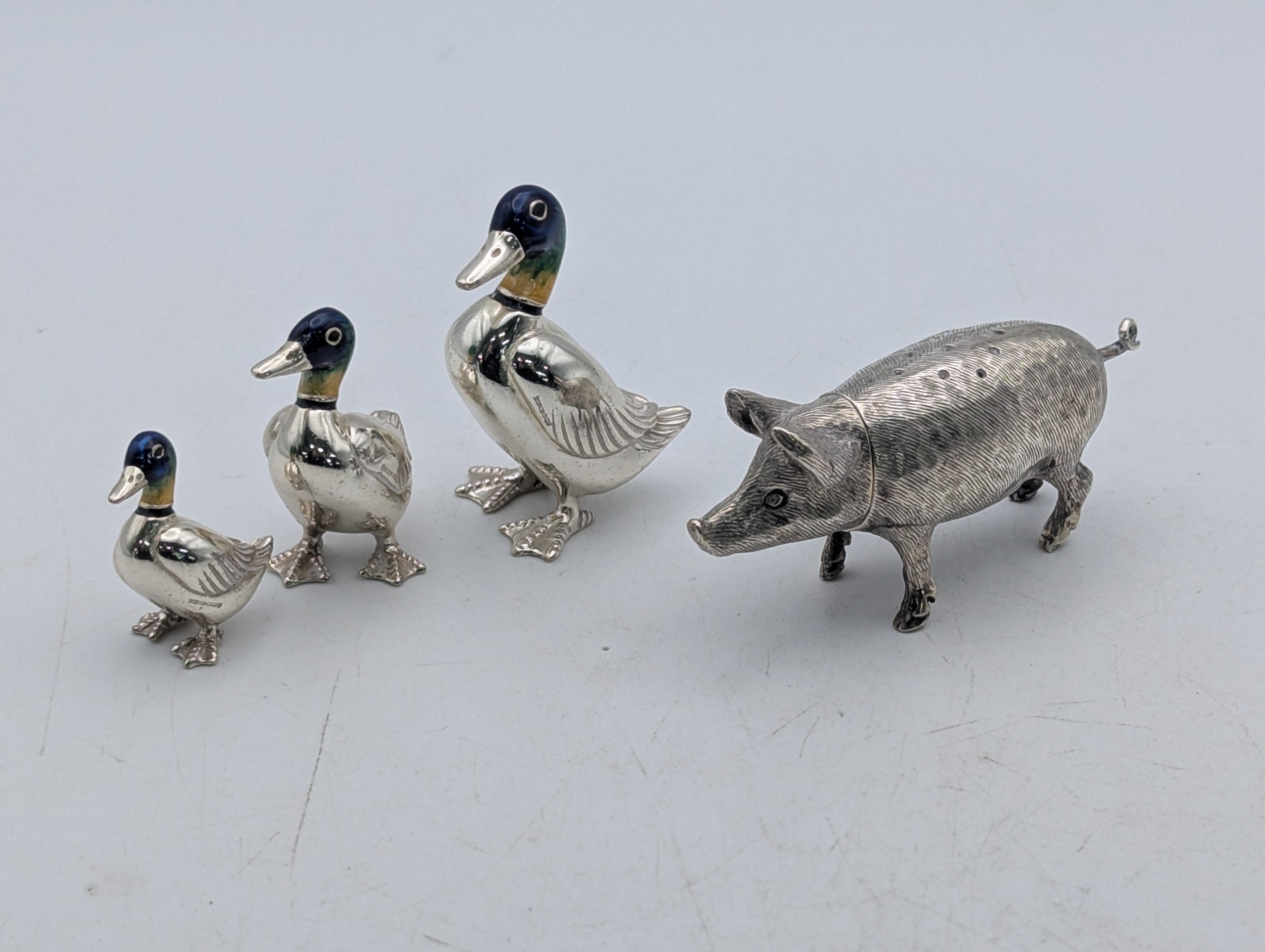 Silver collectables to include a pepper pot fashioned as a pig together with three silver and enamel duck models of graduated sizes, total weight 69g